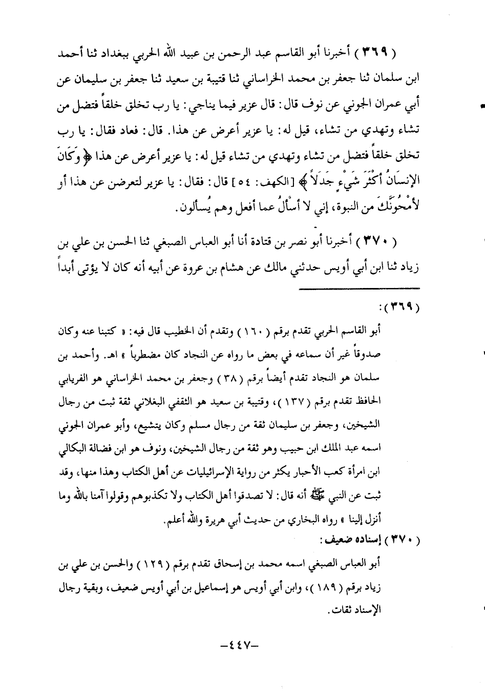 369 - أَخْبَرَنَا أَبُو الْقَاسِمِ عَبْدُ الرَّحْمَنِ بْنُ عُبَيْدِ اللَّهِ الْحَرْبِيُّ , بِبَغْدَادَ , ثنا أَحْمَدُ بْنُ سَلْمَانَ , ثنا جَعْفَرُ بْنُ مُحَمَّدٍ الْخُرَاسَانِيُّ , ثنا قُتَيْبَةُ بْنُ سَعِيدٍ , ثنا جَعْفَرُ بْنُ سُلَيْمَانَ , عَنْ أَبِي عِمْرَانَ الْجَوْنِيِّ , عَنْ نَوْفٍ , قَالَ: قَالَ عُزَيْرٌ فِيمَا يُنَاجِي: §يَا رَبِّ تَخْلُقُ خَلْقًا فَتُضِلُّ مَنْ تَشَاءُ وَتَهْدِي مَنْ تَشَاءُ , قِيلَ لَهُ: يَا عُزَيْرُ أَعْرِضْ عَنْ هَذَا قَالَ: فَعَادَ فَقَالَ: يَا رَبِّ تَخْلُقُ خَلْقًا فَتُضِلُّ مَنْ تَشَاءُ وَتَهْدِي مَنْ تَشَاءُ , قِيلَ لَهُ: يَا عُزَيْرُ أَعْرِضْ عَنْ هَذَا: {وَكَانَ الْإِنْسَانُ أَكْثَرَ شَيْءٍ جَدَلًا} [الكهف: 54] قَالَ: فَقَالَ يَا عُزَيْرُ لَتُعْرِضَنَّ عَنْ هَذَا أَوْ لَأَمْحُوَنَّكَ مِنَ النُّبُوَّةِ , إِنِّي لَا أُسْأَلُ عَمَّا أَفْعَلُ وَهُمْ يُسْأَلُونَ