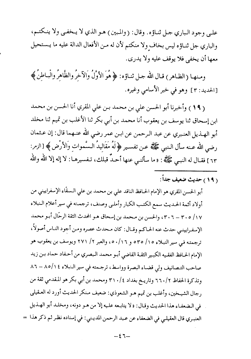 19 - وَأَخْبَرَنَا أَبُو الْحَسَنِ عَلِيُّ بْنُ مُحَمَّدِ بْنِ عَلِيٍّ الْمُقْرِئ، أنا الْحَسَنُ بْنُ مُحَمَّدِ بْنِ إِسْحَاقَ , ثَنَا يُوسُفُ بْنُ يَعْقُوبَ , أنا مُحَمَّدُ بْنُ أَبِي بَكْرٍ , ثَنَا الْأَغْلَبُ بْنُ تَمِيمٍ , ثَنَا مَخْلَدٌ أَبُو الْهُذَيْلِ الْعَنْبَرِيُّ , عَنْ عَبْدِ الرَّحْمَنِ , عَنِ ابْنِ عُمَرَ , رَضِيَ اللَّهُ عَنْهُمَا قَالَ: إِنَّ عُثْمَانَ رَضِيَ اللَّهُ عَنْهُ سَأَلَ النَّبِيَّ صَلَّى اللهُ عَلَيْهِ وَسَلَّمَ عَنْ تَفْسِيرِ: {لَهُ مَقَالِيدُ السَّمَاوَاتِ وَالْأَرْضِ} [الزمر: 63] فَقَالَ لَهُ النَّبِيُّ صَلَّى اللهُ عَلَيْهِ وَسَلَّمَ: " §مَا سَأَلَنِي عَنْهَا أَحَدٌ قَبْلَكَ , تَفْسِيرُهَا: لَا إِلَهَ إِلَّا اللَّهُ وَاللَّهُ -[47]- أَكْبَرُ وَسُبْحَانَ اللَّهِ وَبِحَمْدِهِ أَسْتَغْفِرُ اللَّهَ لَا حَوْلَ وَلَا قُوَّةَ إِلَّا بِاللَّهِ الْأَوَّلِ وَالْآخَرِ وَالظَّاهِرِ وَالْبَاطِنِ بِيَدِهِ الْخَيْرُ يُحْيِي وَيُمِيتُ وَهُوَ عَلَى كُلِّ شَيْءٍ قَدِيرٌ " وَذَكَرَ الْحَدِيثَ قَالَ الْحَلِيمِيُّ - رَحِمَهُ اللَّهُ - فِي مَعْنَى الظَّاهِرُ إِنَّهُ الْبَادِي فِي أَفْعَالِهِ وَهُوَ جَلَّ ثَنَاؤُهُ بِهَذِهِ الصِّفَةِ , فَلَا يُمْكِنُ مَعَهَا أَنْ يُجْحَدَ وُجُودُهُ وَيُنْكَرُ ثُبُوتُهُ وَقَالَ أَبُو سُلَيْمَانَ الْخَطَّابِيُّ: هُوَ الظَّاهِرُ بِحُجَجِهِ الْبَاهِرَةِ وَبَرَاهِينِهِ النَّيِّرَةِ وَشَوَاهِدِ أَعْلَامِهِ الدَّالَّةِ عَلَى ثُبُوتِ رُبُوبِيَّتِهِ وَصِحَّةِ وَحْدَانِيَّتِهِ , وَيَكُونُ الظَّاهِرُ فَوْقَ كُلِّ شَيْءٍ بِقُدْرَتِهِ , وَقَدْ يَكُونُ الظُّهُورُ بِمَعْنَى الْعُلُوِّ , وَيَكُونُ بِمَعْنَى الْغَلَبَةِ وَمِنْهَا الْوَارِثُ وَمَعْنَاهُ الْبَاقِي بَعْدَ ذَهَابِ غَيْرِهِ وَرَبُّنَا جَلَّ ثَنَاؤُهُ بِهَذِهِ الصِّفَةِ لِأَنَّهُ يَبْقَى بَعْدَ ذَهَابِ الْمُلَّاكِ الَّذِينَ أَمْتَعَهُمْ فِي هَذِهِ الدُّنْيَا بِمَا آتَاهُمْ , لِأَنَّ وُجُودَهُمْ وَوُجُودَ الْأَمْلَاكِ كَانَ بِهِ , وَوُجُودُهُ لَيْسَ بِغَيْرِهِ , وَهَذَا الِاسْمُ مِمَّا يُؤْثَرُ عَنْ رَسُولِ اللَّهِ صَلَّى اللهُ عَلَيْهِ وَسَلَّمَ فِي خَبَرِ الْأَسَامِي وَقَالَ اللَّهُ عَزَّ وَجَلَّ: {وَإِنَّا لَنَحْنُ نُحْيِي وَنُمِيتُ وَنَحْنُ الْوَارِثُونَ} [الحجر: 23]