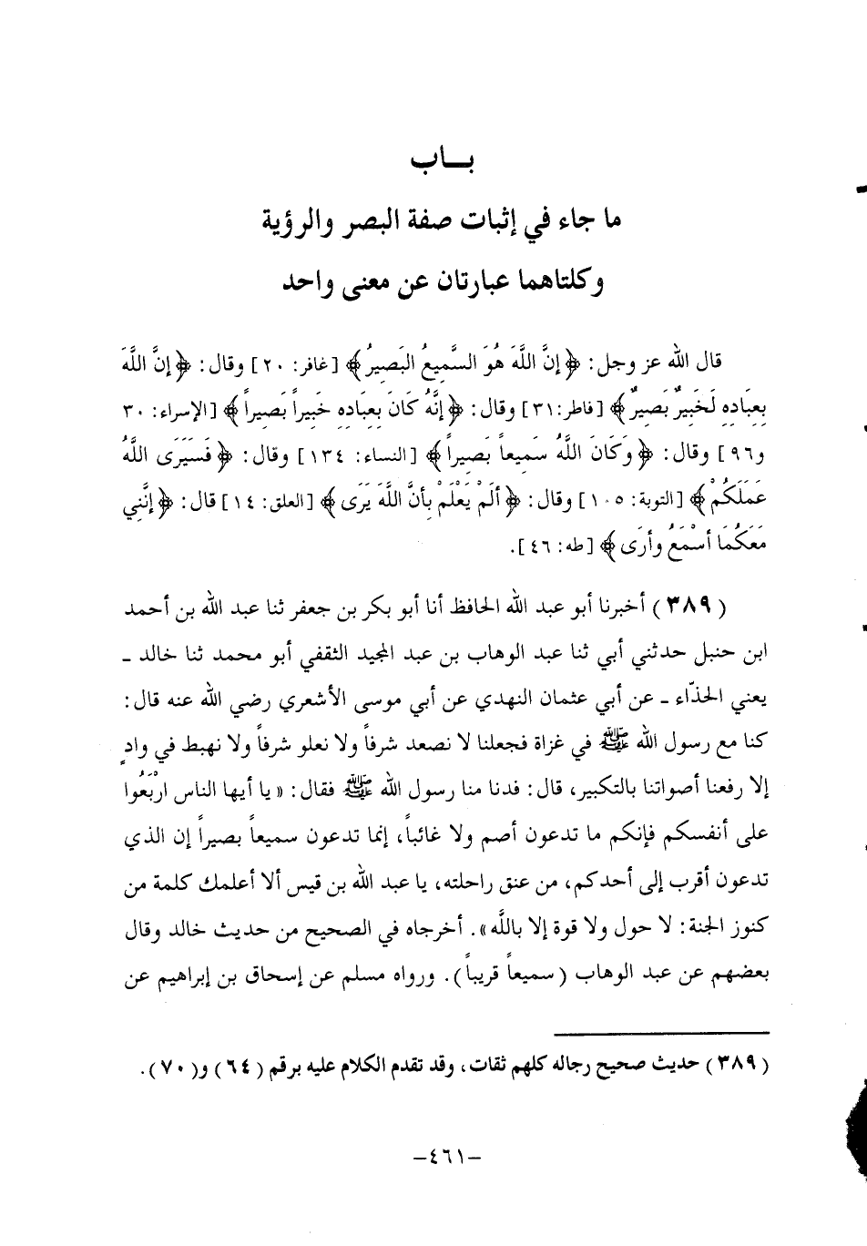 389 - أَخْبَرَنَا أَبُو عَبْدِ اللَّهِ الْحَافِظُ , أنا أَبُو بَكْرِ بْنُ جَعْفَرٍ , ثنا عَبْدُ اللَّهِ بْنُ أَحْمَدَ بْنِ حَنْبَلٍ , حَدَّثَنِي أَبِي , ثنا عَبْدُ الْوَهَّابِ بْنُ عَبْدِ الْمَجِيدِ الثَّقَفِيُّ أَبُو مُحَمَّدٍ , ثنا خَالِدُ يَعْنِي الْحَذَّاءَ عَنْ أَبِي عُثْمَانَ النَّهْدِيِّ , عَنْ أَبِي مُوسَى الْأَشْعَرِيِّ , رَضِيَ اللَّهُ عَنْهُ , قَالَ: كُنَّا مَعَ رَسُولِ اللَّهِ صَلَّى اللهُ عَلَيْهِ وَسَلَّمَ فِي غَزَاةٍ , فَجَعَلْنَا لَا نَصْعَدُ شَرَفًا , وَلَا نَعْلُو شَرَفًا , وَلَا نَهْبِطُ فِي وَادٍ إِلَّا رَفَعْنَا أَصْوَاتَنَا بِالتَّكْبِيرِ , قَالَ: فَدَنَا مِنَّا رَسُولُ اللَّهِ صَلَّى اللَّهُ عَلَيْهِ وَسَلَّم , فَقَالَ: " يَا أَيُّهَا النَّاسُ ارْبَعُوا عَلَى أَنْفُسِكُمْ فَإِنَّكُمْ مَا تَدْعُونَ أَصَمَّ وَلَا غَائِبًا , إِنَّمَا تَدْعُونَ سَمِيعًا بَصِيرًا؛ إِنَّ الَّذِي تَدْعُونَ أَقْرَبُ إِلَى أَحَدِكُمْ , مِنْ عُنُقِ رَاحِلَتِهِ , يَا عَبْدَ اللَّهِ بْنَ قَيْسِ , أَلَا أُعَلِّمُكَ §كَلِمَةً مِنْ كُنُوزِ الْجَنَّةِ: لَا حَوْلَ وَلَا قُوَّةَ إِلَّا بِاللَّهِ «أَخْرِجَاهُ فِي الصَّحِيحِ مِنْ حَدِيثِ خَالِدٍ , وَقَالَ بَعْضُهُمْ عَنْ عَبْدِ الْوَهَّابِ» سَمِيعًا قَرِيبًا " , وَرَوَاهُ مُسْلِمُ , عَنْ إِسْحَاقَ بْنِ إِبْرَاهِيمَ , عَنْ -[462]- عَبْدِ الْوَهَّابِ , وَكَأَنَّهُ قَالَهُمَا جَمِيعًا , وَذَلِكَ بَيِّنٌ مِنْ رِوَايَةِ النَّرْسِيُّ عَنْ حَمَّادٍ , عَنْ أَيُّوبَ , عَنْ أَبِي عُثْمَانَ