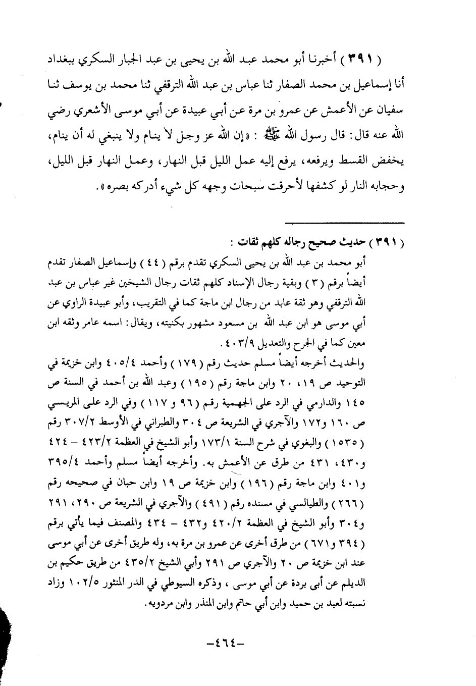 391 - أَخْبَرَنَا أَبُو مُحَمَّدٍ عَبْدُ اللَّهِ بْنِ يَحْيَى بْنِ عَبْدِ الْجَبَّارِ السُّكَّرِيِّ , بِبَغْدَادَ , أنا إِسْمَاعِيلُ بْنُ مُحَمَّدٍ الصَّفَّارُ , ثنا عَبَّاسُ بْنُ عَبْدِ اللَّهِ التَّرْقُفِيُّ , ثنا مُحَمَّدُ بْنُ يُوسُفَ , ثنا سُفْيَانُ , عَنِ الْأَعْمَشِ , عَنْ عَمْرِو بْنِ مُرَّةَ , عَنْ أَبِي عُبَيْدَةَ , عَنْ أَبِي مُوسَى الْأَشْعَرِيِّ , رَضِيَ اللَّهُ عَنْهُ , قَالَ: قَالَ رَسُولُ اللَّهِ صَلَّى اللهُ عَلَيْهِ وَسَلَّمَ: «إِنَّ §اللَّهَ عَزَّ وَجَلَّ لَا يَنَامُ وَلَا يَنْبَغِي لَهُ أَنْ يَنَامَ , يَخْفِضُ الْقِسْطَ وَيَرْفَعُهُ , يُرْفَعُ إِلَيْهِ عَمَلُ اللَّيْلِ قَبْلَ النَّهَارِ , وَعَمَلُ النَّهَارِ قَبْلَ اللَّيْلِ , وَحِجَابُهُ النَّارُ لَوْ كَشَفَهَا لَأَحْرَقَتْ سُبُحَاتُ وَجْهِهِ كُلَّ شَيْءٍ أَدْرَكَهُ بَصَرُهُ» -[465]-
