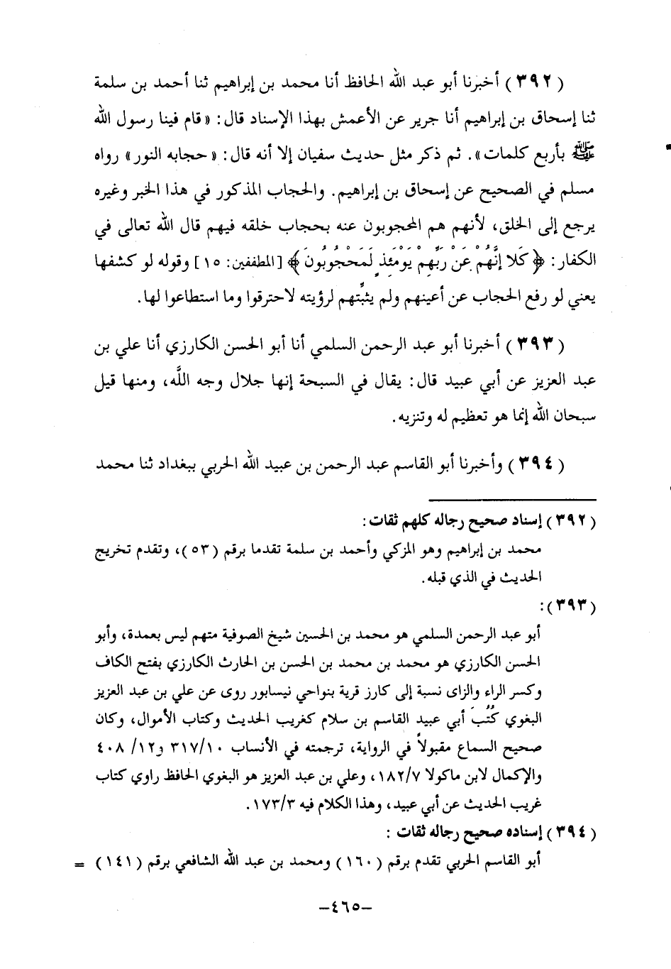 394 - وَأَخْبَرَنَا أَبُو الْقَاسِمِ عَبْدُ الرَّحْمَنِ بْنِ عُبَيْدِ اللَّهِ الْحَرْبِيُّ , بِبَغْدَادَ , ثنا مُحَمَّدُ -[466]- بْنُ عَبْدِ اللَّهِ بْنِ إِبْرَاهِيمَ الشَّافِعِيُّ , ثنا مُحَمَّدُ بْنُ إِسْمَاعِيلَ التِّرْمِذِيُّ السُّلَمِيُّ , ثنا الْفَضْلُ بْنُ دُكَيْنٍ , ثنا الْمَسْعُودِيُّ , عَنْ عَمْرِو بْنِ مُرَّةَ , عَنْ أَبِي عُبَيْدَةَ , عَنْ أَبِي مُوسَى , رَضِيَ اللَّهُ عَنْهُ , قَالَ: قَامَ فِينَا رَسُولُ اللَّهِ صَلَّى اللهُ عَلَيْهِ وَسَلَّمَ بِأَرْبَعٍ , فَقَالَ: §«إِنَّ اللَّهَ لَا يَنَامُ وَلَا يَنْبَغِي لَهُ أَنْ يَنَامَ , يَخْفِضُ الْقِسْطَ وَيَرْفَعُهُ , وَيُرْفَعُ إِلَيْهِ عَمِلُ اللَّيْلِ قَبْلَ النَّهَارِ , وَعَمِلُ النَّهَارِ قَبْلَ اللَّيْلِ , حِجَابُهُ الْنُّورُ , لَوْ كَشَفَهَا لَأَحْرَقَتْ سُبُحَاتُ وَجْهِهِ كُلَّ شَيْءٍ أَدْرَكَهُ بَصَرُهُ» ثُمَّ قَرَأَ أَبُو عُبَيْدَةَ رَضِيَ اللَّهُ عَنْهُ: {نُودِيَ أَنْ بُورِكَ مَنْ فِي النَّارِ وَمَنْ حَوْلَهَا وَسُبْحَانَ اللَّهِ رَبِّ الْعَالَمِينَ} [النمل: 8] وَفِي هَذَا تَأْكِيدٌ لِقَوْلِ أَبِي عُبَيْدَةَ رَضِيَ اللَّهُ عَنْهُ إِنَّ سُبُحَاتٍ مِنَ التَّسْبِيحِ الَّذِي هُوَ التَّعْظِيمُ , وَالتَّنْزِيهُ