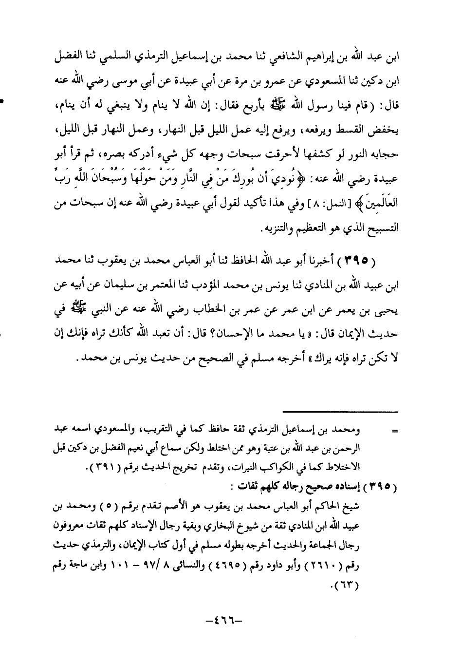 395 - أَخْبَرَنَا أَبُو عَبْدِ اللَّهِ الْحَافِظُ , ثنا أَبُو الْعَبَّاسِ مُحَمَّدُ بْنُ يَعْقُوبَ , ثنا مُحَمَّدُ بْنُ عُبَيْدِ اللَّهِ بْنِ الْمُنَادِي , ثنا يُونُسُ بْنُ مُحَمَّدٍ الْمُؤَدِّبُ , ثنا الْمُعْتَمِرُ بْنُ سُلَيْمَانَ , عَنْ أَبِيهِ , عَنْ يَحْيَى بْنِ يَعْمَرَ , عَنِ ابْنِ عُمَرَ، عَنْ عُمَرَ بْنِ الْخَطَّابِ , رَضِيَ اللَّهُ عَنْهُ , عَنِ النَّبِيِّ صَلَّى اللهُ عَلَيْهِ وَسَلَّمَ فِي حَدِيثِ الْإِيمَانِ , قَالَ: يَا مُحَمَّدُ , مَا الْإِحْسَانُ؟ , قَالَ: §" أَنْ تَعْبُدَ اللَّهَ كَأَنَّكَ تَرَاهُ , فَإِنَّكَ إِنْ لَمْ تَكُنُ تَرَاهُ , فَإِنَّهُ يَرَاكَ أَخْرَجَهُ مُسْلِمٌ فِي الصَّحِيحِ مِنْ حَدِيثِ يُونُسَ بْنِ مُحَمَّدٍ