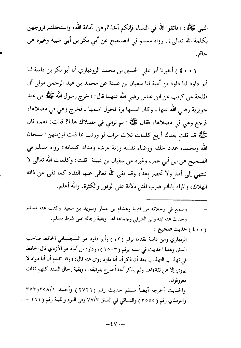 400 - أَخْبَرَنَا أَبُو عَلِيٍّ الْحُسَيْنُ بْنُ مُحَمَّدِ الرُّوذْبَارِيُّ , أنا أَبُو بَكْرِ بْنُ دَاسَةَ , ثنا أَبُو دَاوُدَ , ثَنَا دَاوُدُ بْنُ أُمَيَّةَ , ثنا سُفْيَانُ بْنُ عُيَيْنَةَ , عَنْ مُحَمَّدِ بْنِ عَبْدِ الرَّحْمَنِ , مَوْلَى آلِ طَلْحَةَ , عَنْ كُرَيْبٍ , عَنِ ابْنِ عَبَّاسٍ , رَضِيَ اللَّهُ عَنْهُمَا , قَالَ: خَرَجَ رَسُولُ اللَّهِ صَلَّى اللهُ عَلَيْهِ وَسَلَّمَ مِنْ عِنْدِ جُوَيْرِيَةَ رَضِيَ اللَّهُ عَنْهَا وَكَانَ اسْمُهَا بَرَّةَ فَحَوَّلَ اسْمُهَا فَخَرَجَ وَهِيَ فِي مُصَلَّاهَا , فَرَجَعَ وَهِيَ فِي مُصَلَّاهَا , فَقَالَ صَلَّى اللهُ عَلَيْهِ وَسَلَّمَ: «§لَمْ تَزَالِي فِي مُصَلَّاكِ هَذَا؟» , قَالَتْ: نَعَمْ , قَالَ صَلَّى اللهُ عَلَيْهِ وَسَلَّمَ: " قَدْ قُلْتُ بَعْدَكِ أَرْبَعَ كَلِمَاتٍ ثَلَاثَ مَرَّاتٍ , لَوْ وُزِنَتْ بِمَا قُلْتِ لَوَزَنَتْهُنَّ: سُبْحَانَ اللَّهِ , وَبِحَمْدِهِ , عَدَدَ خَلْقِهِ , وَرِضَاءَ نَفْسِهِ , وَزِنَةَ عَرْشِهِ , وَمِدَادَ كَلِمَاتِهِ " رَوَاهُ مُسْلِمٌ فِي الصَّحِيحِ , عَنِ ابْنِ أَبِي عُمَرَ , وَغَيْرِهِ , عَنْ سُفْيَانَ بْنِ عُيَيْنَةَ , قُلْتُ: وَكَلِمَاتُ اللَّهِ تَعَالَى لَا تَنْتَهِي إِلَى أَمَدٍ وَلَا تُحْصَرُ بِعَدٍّ , وَقَدْ نَفَى اللَّهُ تَعَالَى عَنْهَا النَّفَادَ كَمَا نَفَى عَنْ ذَاتِهِ الْهَلَاكَ , وَالْمُرَادُ بِالْخَبَرِ ضَرْبُ الْمَثَلِ دَلَالَةً عَلَى الْوُفُورِ وَالْكَثْرَةِ , وَاللَّهُ أَعْلَمُ