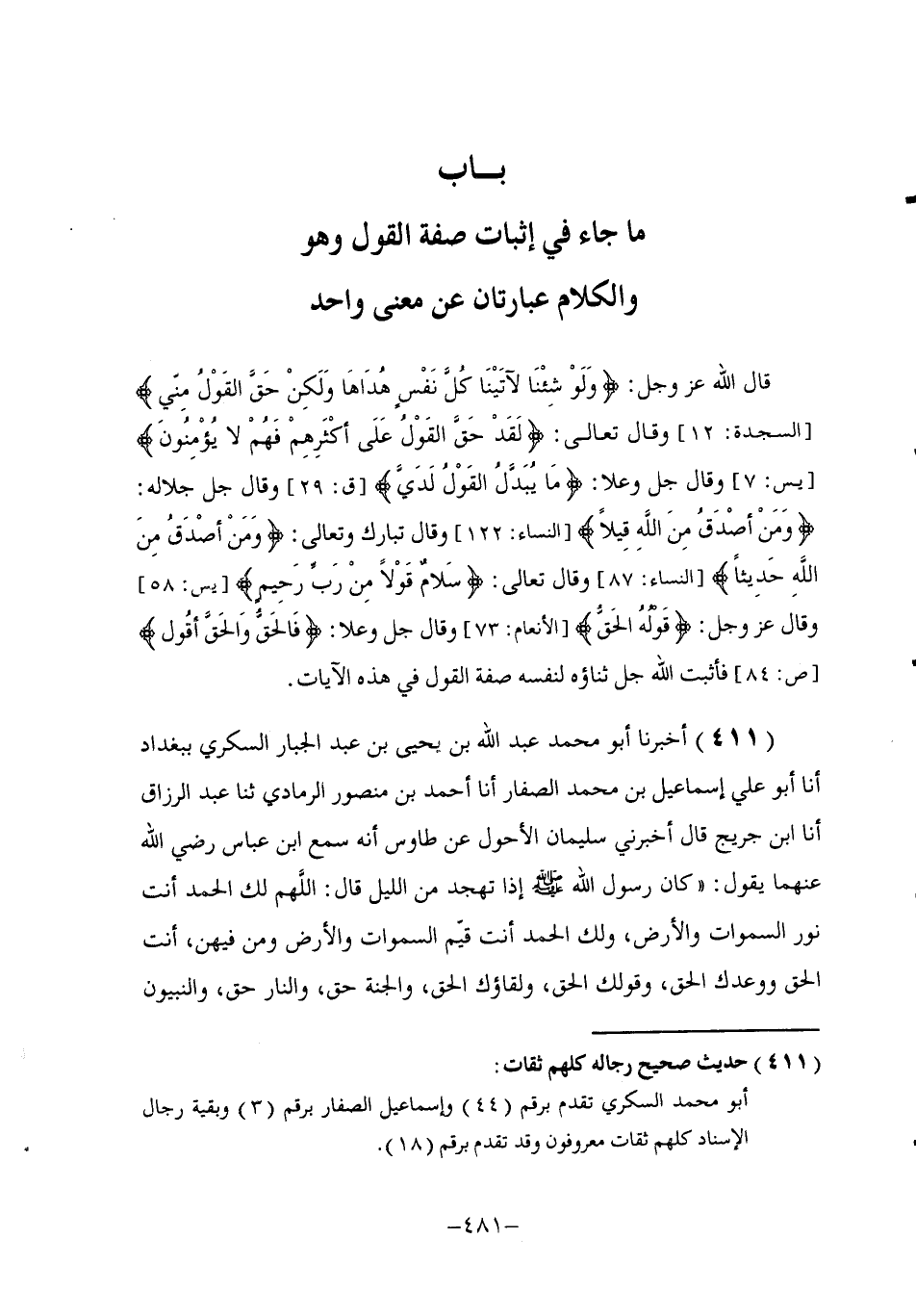 §بَابُ مَا جَاءَ فِي إِثْبَاتِ صِفَةِ الْقَوْلِ وَهُوَ وَالْكَلَامُ عِبَارَتَانِ عَنْ مَعْنًى وَاحِدٍ. قَالَ اللَّهُ عَزَّ وَجَلَّ: {وَلَوْ شِئْنَا لَآتَيْنَا كُلَّ نَفْسٍ هُدَاهَا وَلَكِنْ حَقَّ الْقَوْلُ مِنِّي} [السجدة: 13] وَقَالَ تَعَالَى: {لَقَدْ حَقَّ الْقَوْلُ عَلَى أَكْثَرَهِمْ فَهُمْ لَا يُؤْمِنُونَ} [يس: 7] , وَقَالَ جَلَّ وَعَلَا: {مَا يُبَدَّلُ الْقَوْلُ لَدَيَّ} [ق: 29] , وَقَالَ جَلَّ جَلَالُهُ: {وَمَنْ أَصْدَقُ مِنَ اللَّهِ قِيلًا} [النساء: 122] , وَقَالَ تَبَارَكَ وَتَعَالَى: {وَمَنْ أَصْدَقُ مِنَ اللَّهِ حَدِيثًا} [النساء: 87] , وَقَالَ تَعَالَى: {سَلَامٌ قَوْلًا مِنْ رَبِّ رَحِيمٍ} [يس: 58] , وَقَالَ عَزَّ وَجَلَّ: {قَوْلُهُ الْحَقُّ} [الأنعام: 73] , وَقَالَ جَلَّ وَعَلَا: {فَالْحَقُ وَالْحَقَّ أَقُولُ} [ص: 84] ؛ فَأَثْبَتَ اللَّهُ جَلَّ ثَنَاؤُهُ لِنَفْسِهِ صِفَةَ الْقَوْلِ فِي هَذِهِ الْآيَاتِ