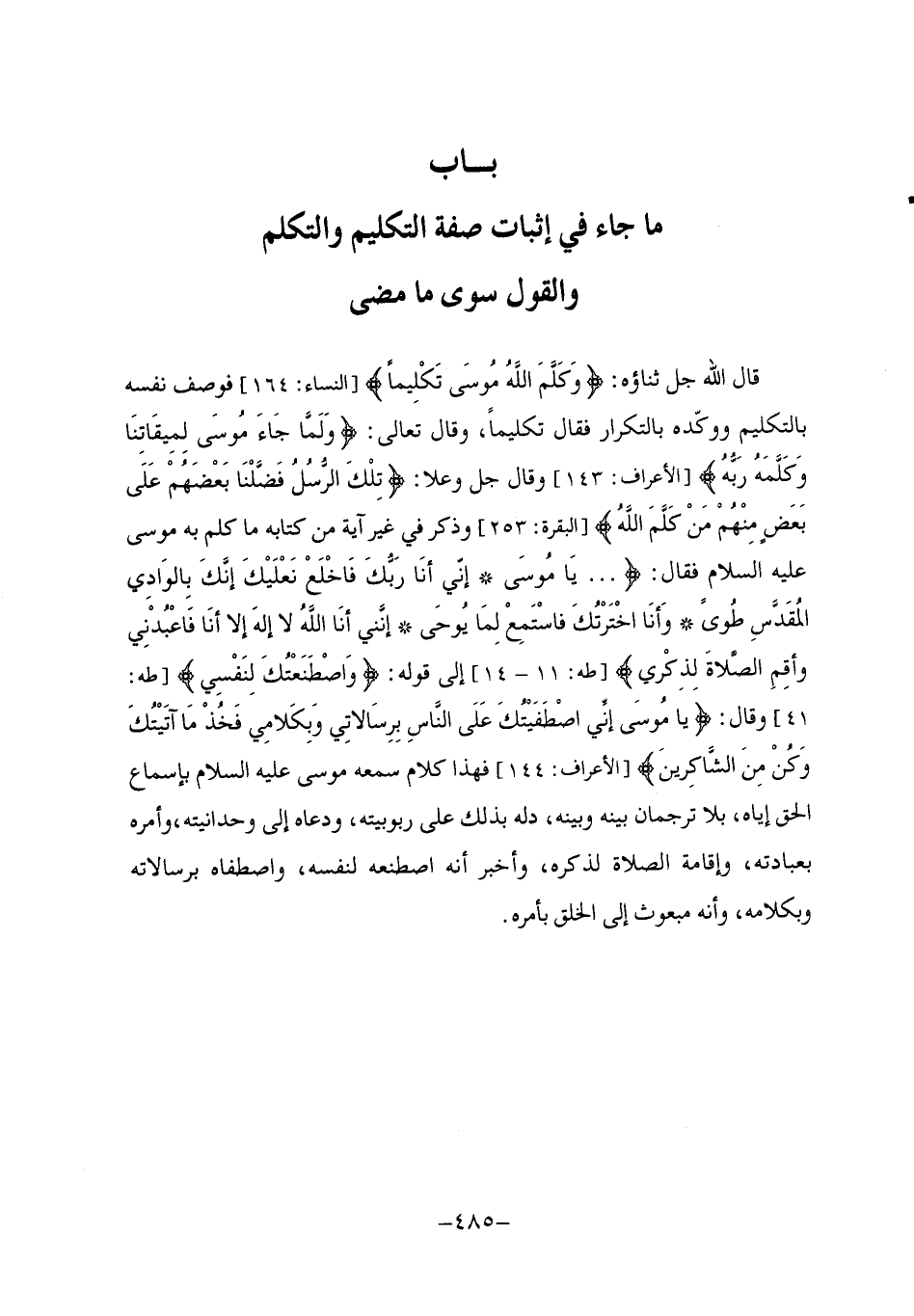 §بَابُ مَا جَاءَ فِي إِثْبَاتِ صِفَةِ التَّكْلِيمِ , وَالتَّكَلُّمِ , وَالْقَوْلُ سِوَى مَا مَضَى قَالَ اللَّهُ جَلَّ ثَنَاؤُهُ: {وَكَلَّمَ اللَّهُ مُوسَى تَكْلِيمًا} [النساء: 164] فَوَصَفَ نَفْسَهَ بِالتَّكْلِيمِ , وَوَكَّدَهُ بِالتِّكْرَارِ , فَقَالَ {تَكْلِيمًا} [النساء: 164] , وَقَالَ تَعَالَى: {وَلَمَّا جَاءَ مُوسَى لِمِيقَاتِنَا وَكَلَّمَهُ رَبُّهُ} [الأعراف: 143] , وَقَالَ جَلَّ وَعَلَا: {تِلْكَ الرُّسُلُ فَضَّلْنَا بَعْضَهُمْ عَلَى بَعْضٍ مِنْهُمْ مَنْ كَلَّمَ اللَّهُ} [البقرة: 253] , وَذَكَرَ فِي غَيْرِ آيَةٍ مِنْ كِتَابِهِ مَا كَلَّمَ بِهِ مُوسَى عَلَيْهِ السَّلَامُ , فَقَالَ: {يَا مُوسَى إِنِّي أَنَا رَبُّكَ فَاخْلَعْ نَعْلَيْكَ إِنَّكَ بِالْوَادِي الْمَقْدِسِ طُوًى وَأَنَا اخْتَرْتُكَ فَاسْتَمِعْ لِمَا يُوحَى إِنَّنِي أَنَا اللَّهُ لَا إِلَهَ إِلَّا أَنَا فَاعْبُدْنِي وَأَقِمِ الصَّلَاةَ لِذِكْرِي} [طه: 12] , إِلَى قَوْلِهِ: {وَاصْطَنَعْتُكَ لِنَفْسِي} [طه: 41] , وَقَالَ: {يَا مُوسَى إِنِّي اصْطَفَيْتُكَ عَلَى النَّاسِ بِرِسَالَاتِي وَبِكَلَامِي فَخُذْ مَا آتَيْتُكَ وَكُنْ مِنَ الشَّاكِرِينَ} [الأعراف: 144] فَهَذَا كَلَامٌ سَمِعَهُ مُوسَى عَلَيْهِ السَّلَامُ بِإِسْمَاعِ الْحَقِّ إِيَّاهُ بِلَا تَرْجُمَانَ بَيْنَهُ وَبَيْنَهُ , دَلَّهُ بِذَلِكَ عَلَى رُبُوبِيَّتِهِ , وَدَعَاهُ إِلَى وَحْدَانِيَّتِهِ , وَأَمَرَهُ بِعِبَادَتِهِ , وَإِقَامَةِ الصَّلَاةِ لِذِكْرِهِ , وَأَخْبَرَهُ أَنَّهُ اصْطَنَعَهُ لِنَفْسِهِ , وَاصْطَفَاهُ بِرِسَالَاتِهِ وَبِكَلَامِهِ , وَأَنَّهُ مَبْعُوثٌ إِلَى الْخَلْقِ بِأَمْرِهِ