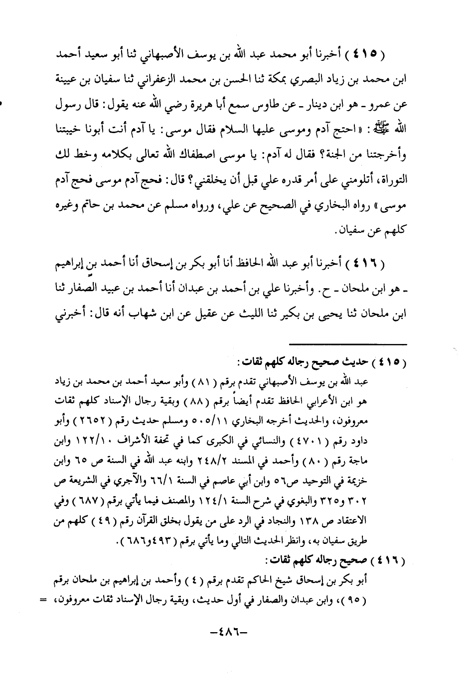 415 - أَخْبَرَنَا أَبُو مُحَمَّدٍ عَبْدُ اللَّهِ بْنُ يُوسُفَ الْأَصْبَهَانِيُّ , ثنا أَبُو سَعِيدٍ أَحْمَدُ بْنُ مُحَمَّدِ بْنِ زِيَادٍ الْبَصْرِيُّ بِمَكَّةَ , ثنا الْحَسَنُ بْنُ مُحَمَّدٍ الزَّعْفَرَانِيُّ , ثنا سُفْيَانُ بْنُ عُيَيْنَةَ , عَنْ عَمْرٍو هُوَ ابْنُ دِينَارٍ عَنْ طَاوُسٍ , سَمِعَ أَبَا هُرَيْرَةَ , رَضِيَ اللَّهُ عَنْهُ , يَقُولُ: قَالَ رَسُولُ اللَّهِ صَلَّى اللهُ عَلَيْهِ وَسَلَّمَ: " §احْتَجَّ آدَمُ , وَمُوسَى عَلَيْهِمَا السَّلَامُ , فَقَالَ مُوسَى: يَا آدَمُ , أَنْتَ أَبُونَا خَيَّبْتَنَا وَأَخْرَجْتَنَا مِنَ الْجَنَّةَ؟ فَقَالَ لَهُ آدَمُ يَا مُوسَى اصْطَفَاكَ اللَّهُ تَعَالَى بِكَلَامِهِ , وَخَطَّ لَكَ التَّوْرَاةَ , أَتَلُومُنِي عَلَى أَمْرٍ قَدَّرَهُ عَلَيَّ قَبْلَ أَنْ يَخْلُقَنِي؟ قَالَ: فَحَجَّ آدَمُ مُوسَى فَحَجَّ آدَمُ مُوسَى" رَوَاهُ الْبُخَارِيُّ فِي الصَّحِيحِ , عَنْ عَلِيٍّ , وَرَوَاهُ مُسْلِمٌ , عَنْ مُحَمَّدِ بْنِ حَاتِمٍ , وَغَيْرِهِ كُلِّهِمْ , عَنْ سُفْيَانَ