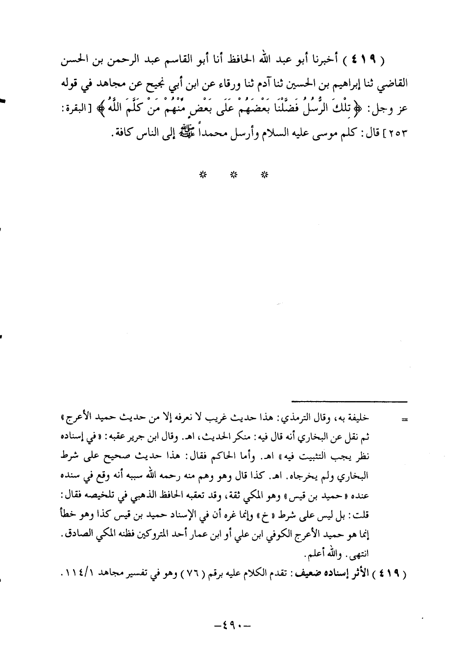 419 - أَخْبَرَنَا أَبُو عَبْدِ اللَّهِ الْحَافِظُ , أنا أَبُو الْقَاسِمِ عَبْدُ الرَّحْمَنِ بْنُ الْحَسَنِ الْقَاضِي , ثنا إِبْرَاهِيمُ بْنُ الْحُسَيْنِ , ثنا آدَمُ , ثنا وَرْقَاءُ , عَنِ ابْنِ أَبِي نَجِيحٍ , عَنْ مُجَاهِدٍ , فِي قَوْلِهِ عَزَّ وَجَلَّ: {§تِلْكَ الرُّسُلُ فَضَّلْنَا بَعْضَهَمْ عَلَى بَعْضٍ مِنْهُمْ مَنْ كَلَّمَ اللَّهُ} [البقرة: 253] قَالَ: كَلَّمَ مُوسَى عَلَيْهِ السَّلَامُ , وَأَرْسَلَ مُحَمَّدًا صَلَّى اللهُ عَلَيْهِ وَسَلَّمَ إِلَى النَّاسِ كَافَّةً