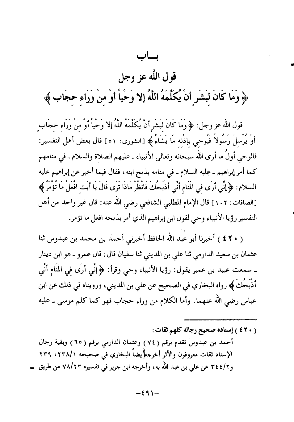 420 - أَخْبَرَنَا أَبُو عَبْدِ اللَّهِ الْحَافِظُ , أَخْبَرَنِي أَحْمَدُ بْنُ مُحَمَّدِ بْنِ عَبْدُوسٍ , ثنا عُثْمَانُ بْنُ سَعِيدٍ الدَّارَمِيُّ , ثنا عَلِيُّ بْنُ الْمَدِينِيِّ , ثنا سُفْيَانُ , قَالَ: قَالَ عَمْرٌو هُوَ ابْنُ دِينَارٍ سَمِعْتُ عُبَيْدَ بْنَ عُمَيْرٍ , يَقُولُ: §رُؤْيَا الْأَنْبِيَاءِ وَحْيٌ , وَقَرَأَ: {إِنِّي أَرَى فِيَ الْمَنَامِ أَنِّي أَذْبَحُكَ} [الصافات: 102] رَوَاهُ الْبُخَارِيُّ فِي الصَّحِيحِ عَنْ عَلِيِّ بْنِ الْمَدِينِيِّ , وَرُوِّينَاهُ فِي ذَلِكَ عَنِ ابْنِ عَبَّاسٍ رَضِيَ اللَّهُ عَنْهُمَا وَأَمَّا الْكَلَامُ مِنْ وَرَاءِ حِجَابٍ , فَهُوَ كَمَا كَلَّمَ مُوسَى عَلَيْهِ -[492]- السَّلَامُ مِنْ وَرَاءِ حِجَابٍ , وَالْحِجَابُ الْمَذْكُورُ فِي هَذَا الْوَضْعِ وَغَيْرِهِ يَرْجِعُ إِلَى الْخَلْقِ دُونَ الْخَالِقِ