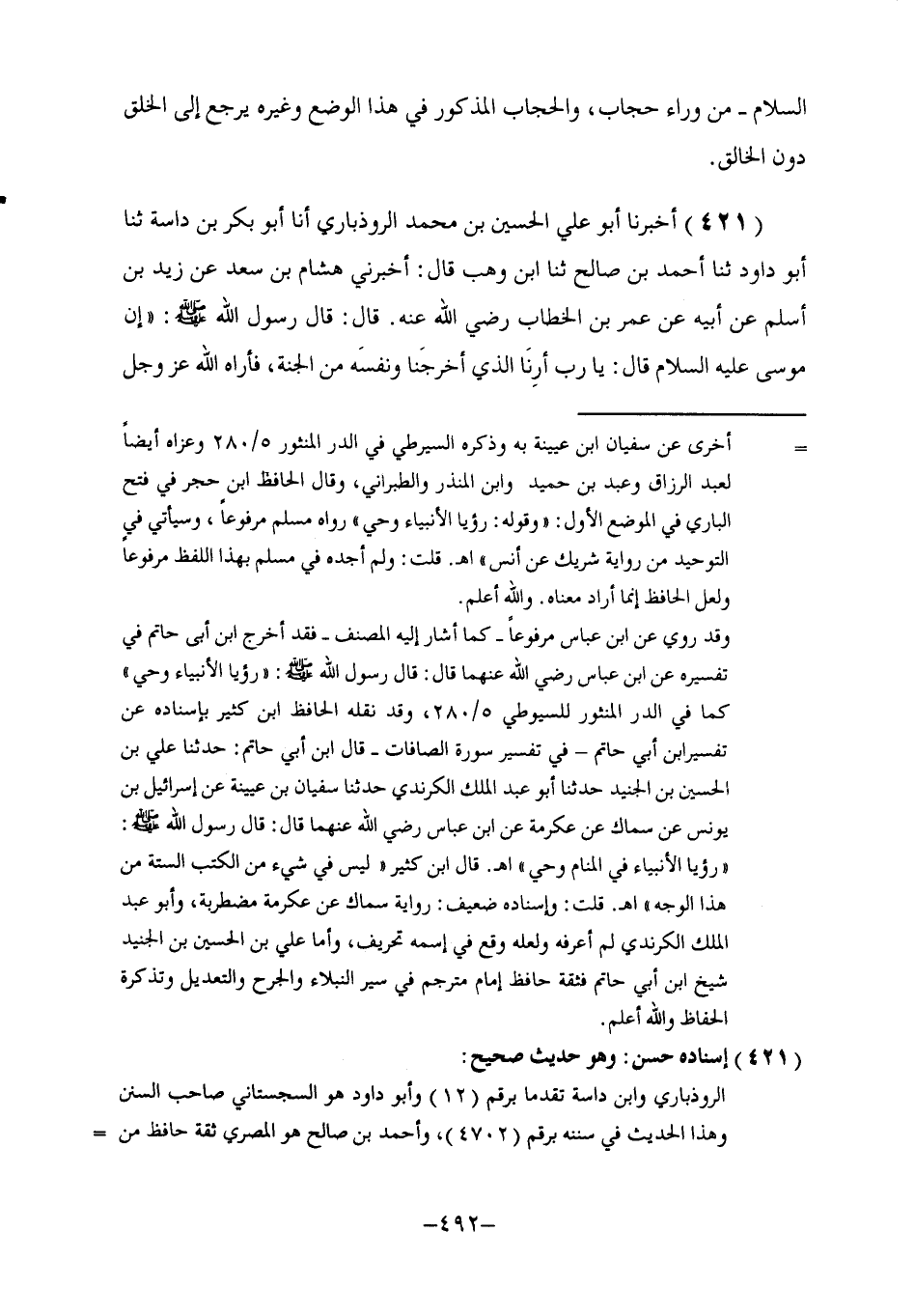 421 - أَخْبَرَنَا أَبُو عَلِيٍّ الْحُسَيْنُ بْنُ مُحَمَّدٍ الرُّوذْبَارِيُّ , أنا أَبُو بَكْرِ بْنُ دَاسَةَ , ثنا أَبُو دَاوُدَ , ثنا أَحْمَدُ بْنُ صَالِحٍ , ثنا ابْنُ وَهْبٍ , قَالَ: أَخْبَرَنِي هِشَامُ بْنُ سَعْدٍ , عَنْ زَيْدِ بْنِ أَسْلَمَ , عَنْ أَبِيهِ , عَنْ عُمَرَ بْنِ الْخَطَّابِ , رَضِيَ اللَّهُ عَنْهُ , قَالَ: قَالَ رَسُولُ اللَّهِ صَلَّى اللهُ عَلَيْهِ وَسَلَّمَ: " §إِنَّ مُوسَى عَلَيْهِ السَّلَامُ , قَالَ: يَا رَبِّ , أَرِنَا الَّذِي أَخْرَجَنَا وَنَفْسَهَ مِنَ الْجَنَّةِ , فَأَرَاهُ اللَّهُ عَزَّ وَجَلَّ -[493]- آدَمَ عَلَيْهِ السَّلَامُ , فَقَالَ: أَنْتَ أَبُونَا آدَمُ؟ فَقَالَ لَهُ آدَمُ: نَعَمْ , قَالَ: أَنْتَ الَّذِي نَفَخَ اللَّهُ فِيكَ مِنْ رُوحِهِ , وَعَلَّمَكَ الْأَسْمَاءَ كُلَّهَا , وَأَمَرَ الْمَلَائِكَةَ؛ فَسَجَدُوا لَكَ؟ قَالَ: نَعَمْ , قَالَ: فَمَا حَمَلَكَ عَلَى أَنْ أَخْرَجْتَنَا وَنَفْسَكَ مِنَ الْجَنَّةِ؟ قَالَ لَهُ آدَمُ: وَمَنْ أَنْتَ؟ , قَالَ: أَنَا مُوسَى , قَالَ: أَنْتَ مُوسَى نَبِيُّ بَنِي إِسْرَائِيلَ الَّذِي كَلَّمَكَ اللَّهُ مِنْ وَرَاءِ حِجَابٍ لَمْ يَجْعَلِ اللَّهُ َبَيْنَك وبَيْنَهُ رَسُولًا مِنْ خَلْقِهِ؟ قَالَ: نَعَمْ , قَالَ: فَمَا وَجَدْتَ أَنْ ذَلِكَ كَانَ فِي كِتَابِ اللَّهِ عَزَّ وَجَلَّ قَبْلَ أَنْ أُخْلَقَ؟ قَالَ: نَعَمْ قَالَ: فِيمَ تَلُومُنِي فِي شَيْءٍ سَبَقَ مِنَ اللَّهِ عَزَّ وَجَلَّ فِيهِ الْقَضَاءُ قَبْلِي؟ قَالَ رَسُولُ اللَّهِ صَلَّى اللهُ عَلَيْهِ وَسَلَّمَ: عِنْدَ ذَلِكَ فَحَجَّ آدَمُ مُوسَى , فَحَجَّ آدَمُ مُوسَى " وَأَمَّا الْكَلَامُ بِالرِّسَالَةِ , فَهُوَ إِرْسَالُهُ الرُّوحَ الْأَمِينَ بِالرِّسَالَةِ إِلَى مِنْ شَاءَ مِنْ عِبَادِهِ , قَالَ اللَّهُ عَزَّ وَجَلَّ: {وَإِنَّهُ لَتَنْزِيلُ رَبِّ الْعَالَمِينَ نَزَلَ بِهِ الرُّوحُ الْأَمِينُ عَلَى قَلْبِكَ لِتَكُونَ مِنَ الْمُنْذِرِينَ} [الشعراء: 193]