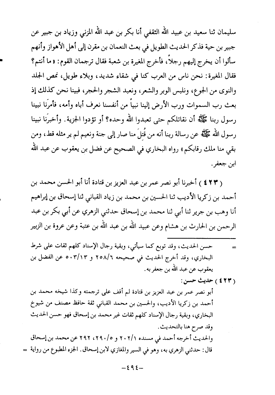 423 - أَخْبَرَنَا أَبُو نَصْرٍ عُمَرُ بْنُ عَبْدِ الْعَزِيزِ بْنِ قَتَادَةَ , أنا أَبُو الْحَسَنِ مُحَمَّدُ بْنُ أَحْمَدَ بْنِ زَكَرِيَّا الْأَدِيبُ , ثنا الْحُسَيْنُ بْنُ مُحَمَّدِ بْنِ زِيَادٍ الْقُبَّانِيُّ , ثنا إِسْحَاقُ بْنُ إِبْرَاهِيمَ , أنا وَهْبُ بْنُ جَرِيرٍ , ثنا أَبِي , ثنا مُحَمَّدُ بْنُ إِسْحَاقَ , حَدَّثَنِي الزُّهْرِيُّ , عَنْ أَبِي بَكْرِ بْنِ عَبْدِ الرَّحْمَنِ بْنِ الْحَارِثِ بْنِ هِشَامِ , وَعَنْ عُبَيْدِ اللَّهِ بْنِ عَبْدِ اللَّهِ بْنِ عُتْبَةَ , وَعَنْ عُرْوَةَ بْنِ الزُّبَيْرِ -[495]- , وَصُلْبُ الْحَدِيثِ , عَنْ أَبِي بَكْرِ بْنِ عَبْدِ الرَّحْمَنِ , عَنْ أُمِّ سَلَمَةَ , زَوْجِ النَّبِيِّ صَلَّى اللهُ عَلَيْهِ وَسَلَّمَ «أَنَّ رَسُولَ اللَّهِ صَلَّى اللهُ عَلَيْهِ وَسَلَّمَ §لَمَّا فُتِنَ أَصْحَابُهُ بِمَكَّةَ أَشَارَ عَلَيْهِمْ أَنْ يَلْحَقُوا بِأَرْضِ الْحَبَشَةِ» , فَذَكَرَ الْحَدِيثَ , وَقَالَ فِيهِ: فَقَالَ جَعْفَرُ بْنُ أَبِي طَالِبٍ رَضِيَ اللَّهُ عَنْهُ لِلنَّجَاشِيِّ: بَعَثَ اللَّهُ عَزَّ وَجَلَّ إِلَيْنَا رَسُولًا نَعْرِفُ نَسَبَهُ , وَصِدْقَهُ , وَعَفَافَهُ , فَدَعَا إِلَى أَنْ نَعْبُدَ اللَّهَ وَحْدَهُ لَا نُشْرِكُ بِهِ شَيْئًا , وَنَخْلَعَ مِنْ يَعْبُدُ قَوْمُهُ وَغَيْرُهُمْ مِنْ دُونِهِ , وَأَمَرَنَا بِالْمَعْرُوفِ , وَنَهَانَا عَنِ الْمُنْكَرِ , وَأَمَرَنَا بِإِقَامِ الصَّلَاةِ وَالصِّيَامِ وَالصَّدَقَةِ وَصِلَةِ الرَّحِمِ , وَكُلِّ مَا نَعْرِفُ مِنَ الْأَخْلَاقِ الْحَسَنَةِ , وَتَلَا عَلَيْنَا تَنْزِيلًا لَا يُشْبِهُهُ شَيْءٌ غَيْرُهُ , فَصَدَّقْنَاهُ , وَآمَنَّا بِهِ , وَعَرَفْنَا أَنَّ مَا جَاءَ بِهِ هُوَ الْحَقُّ مِنْ عِنْدِ اللَّهِ وَذَكَرَ الْحَدِيثَ قُلْتُ: وَقَدْ كَانَ لِنَبِّينَا صَلَّى اللهُ عَلَيْهِ وَسَلَّمَ جَمِيعُ هَذِهِ الْأَنْوَاعِ , أَمَّا الرِّسَالَةُ فَقَدْ كَانَ جِبْرِيلُ - عَلَيْهِ الصَّلَاةُ وَالسَّلَامُ - يَأْتِيهِ بِهَا مِنْ عِنْدِ اللَّهِ عَزَّ وَجَلَّ , وَأَمَّا الرُّؤْيَا فِي الْمَنَامِ , فَقَدْ قَالَ اللَّهُ عَزَّ وَجَلَّ: {لَقَدْ صَدَقَ اللَّهُ رَسُولَهُ الرُّؤْيَا بِالْحَقِّ لَتَدْخُلُنَّ الْمَسْجِدَ الْحَرَامَ إِنْ شَاءَ اللَّهُ آمِنِينَ} [الفتح: 27] وَذَلِكَ أَنَّ رَسُولَ اللَّهِ صَلَّى اللهُ عَلَيْهِ وَسَلَّمَ أُرِيَ وَهُوَ بِالْحُدَيْبِيَةِ أَنَّهُ يَدْخُلُ مَكَّةَ هُوَ وَأَصْحَابُهُ آمِنِينَ مُحَلِّقِينَ رُؤُوسَهُمْ وَمُقَصِّرِينَ , فَقَالَ لَهُ أَصْحَابُهُ حِينَ نَحَرَ بِالْحُدَيْبِيَةِ: أَيْنَ رُؤْيَاكَ يَا رَسُولَ اللَّهِ؟ فَأَنْزَلَ اللَّهُ تَبَارَكَ وَتَعَالَى: {لَقَدْ صَدَقَ اللَّهُ رَسُولَهَ الرُّؤْيَا بِالْحَقِّ} [الفتح: 27] إِلَى قَوْلِهِ تَعَالَى: {فَجَعَلَ مِنْ دُونِ ذَلِكَ فَتْحًا قَرِيبًا} [الفتح: 27] يَعْنِي النَّحْرَ بِالْحُدَيْبِيَةِ , ثُمَّ رَجَعُوا فَفَتَحُوا خَيْبَرَ , ثُمَّ اعْتَمَرَ بَعْدَ ذَلِكَ , فَكَانَ تَصْدِيقُ رُؤْيَاهُ صَلَّى اللهُ عَلَيْهِ وَسَلَّمَ فِي السَّنَةِ الْمُقْبِلَةِ «-[496]-»