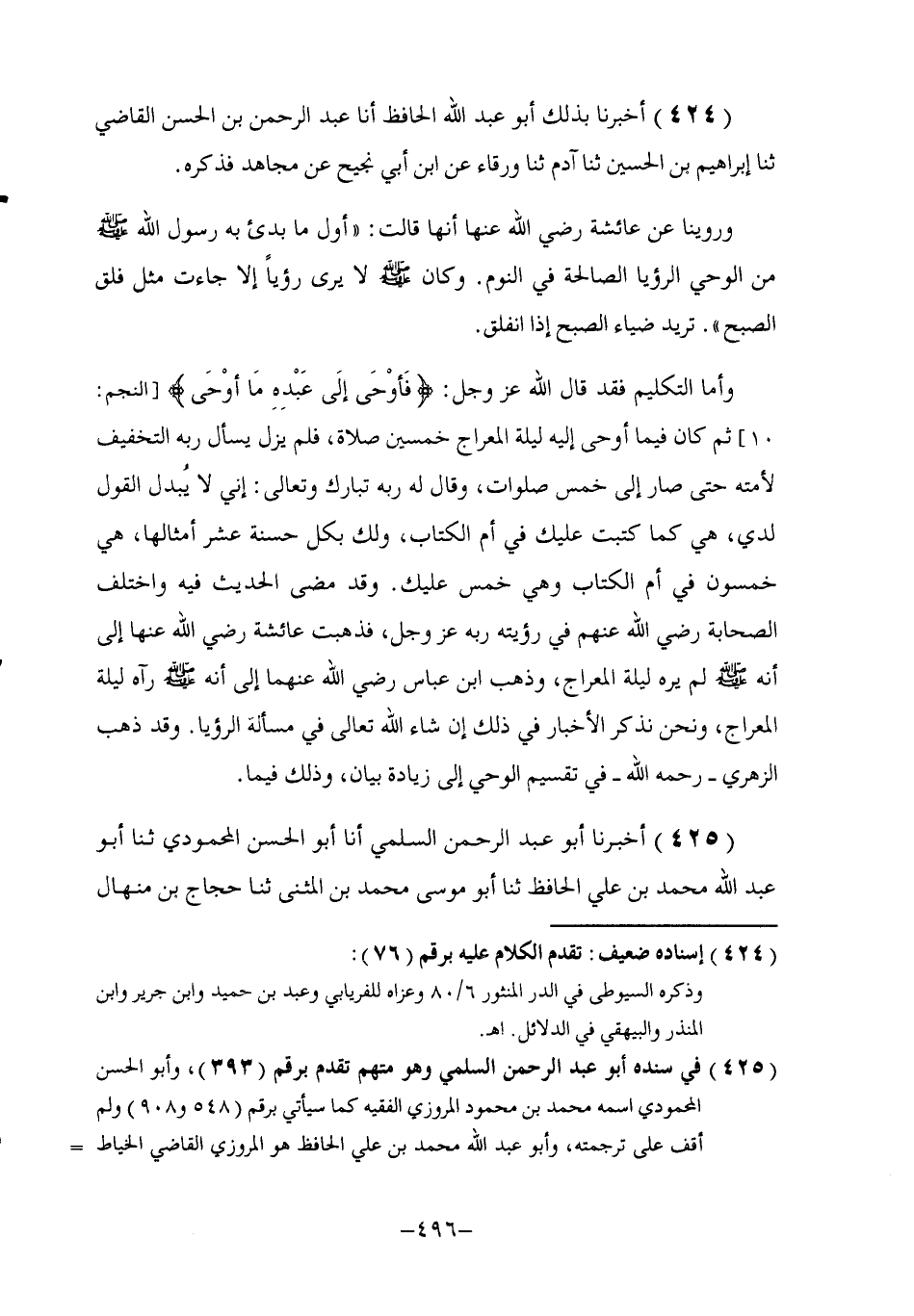 425 - أَخْبَرَنَا أَبُو عَبْدِ الرَّحْمَنِ السُّلَمِيُّ , أنا أَبُو الْحَسَنِ الْمَحْمُودِيُّ , ثنا أَبُو عَبْدِ اللَّهِ مُحَمَّدِ بْنِ عَلِيٍّ الْحَافِظُ , ثنا أَبُو مُوسَى مُحَمَّدُ بْنُ الْمُثَنَّى , ثنا حَجَّاجُ بْنُ مِنْهَالٍ -[497]- , ثنا عَبْدُ اللَّهِ بْنُ عُمَرَ , عَنْ يُونُسَ بْنِ يَزِيدَ , سَمِعْتُ الزُّهْرِيَّ , حِينَ سُئِلَ عَنْ قَوْلِ اللَّهِ , عَزَّ وَجَلَّ: {§وَمَا كَانَ لِبَشَرٍ أَنْ يُكَلِّمَهُ اللَّهُ إِلَّا وَحْيًا أَوْ مِنْ وَرَاءِ حِجَابٍ} [الشورى: 51] الْآيَةَ قَالَ: نَزَلَتْ هَذِهِ الْآيَةُ تَعُمُّ مَنْ أَوْحَى اللَّهُ إِلَيْهِ مِنَ النَّبِيِّينَ " , قَالَ: فَالْكَلَامُ كَلَامُ اللَّهِ تَعَالَى الَّذِي كَلَّمَ بِهِ مُوسَى مِنْ وَرَاءِ حِجَابٍ , وَالْوَحْيُ مَا يُوحِي اللَّهُ بِهِ إِلَى النَّبِيِّ مِنْ أَنْبِيَائِهِ , فَيُثَبِّتُ اللَّهُ تَعَالَى مَا أَرَادَ مِنْ وَحَيِّهِ فِي قَلْبِ النَّبِيِّ , فَيَتَكَلَّمُ بِهِ النَّبِيُّ عَلَيْهِ الصَّلَاةُ وَالسَّلَامُ , وَيُبَيِّنُهُ وَهُوَ كَلَامُ اللَّهِ وَوَحْيُهُ , وَمِنْهُ مَا يَكُونُ بَيْنَ اللَّهِ وَرُسُلِهِ لَا يُكَلِّمُ بِهِ أَحَدٌ مِنَ الْأَنْبِيَاءِ أَحَدًا مِنَ النَّاسِ , وَلَكِنَّهُ سِرُّ غَيْبٍ بَيْنَ اللَّهِ وَرُسُلِهِ , وَمِنْهُ مَا يَتَكَلَّمُ بِهِ الْأَنْبِيَاءُ , وَلَا يَكُتُبُونَهُ لِأَحَدٍ , وَلَا يَأْمُرُونَ بِكِتَابَتِهِ , وَلَكِنَّهُمْ يُحَدِّثُونَ بِهِ النَّاسَ حَدِيثًا , وَيُبَيِّنُونَ لَهُمْ أَنَّ اللَّهَ تَعَالَى أَمَرَهُمْ أَنْ يُبَيِّنُوهُ لِلنَّاسِ وَيُبَلِّغُوهُمْ وَمِنَ الْوَحْيِ مَا يُرْسِلُ اللَّهُ بِهِ مَنْ يَشَاءُ مَنِ اصْطَفَى مِنْ مَلَائِكَتِهِ؛ فَيُكَلِّمُونَ أَنْبِيَاءَهُ مِنَ النَّاسِ , وَمِنَ الْوَحْيِ مَا يُرْسِلُ اللَّهُ بِهِ مَنْ يَشَاءُ؛ فَيُوحُونَ بِهِ وَحْيًا فِي قُلُوبِ مَنْ يَشَاءُ مِنْ رُسُلِهِ , وَقَدْ بَيَّنَ اللَّهُ عَزَّ وَجَلَّ لَنَا فِي كِتَابِهِ أَنَّهُ يُرْسِلُ جِبْرِيلَ عَلَيْهِ السَّلَامُ إِلَى مُحَمَّدٍ صَلَّى اللهُ عَلَيْهِ وَسَلَّمَ , قَالَ اللَّهُ عَزَّ وَجَلَّ فِي كِتَابِهِ: {قُلْ مَنْ كَانَ عَدُوًّا لِجِبْرِيلَ فَإِنَّهُ نَزَّلَهُ عَلَى قَلْبِكَ بِإِذْنِ اللَّهِ مُصَدِّقًا لِمَا بَيْنَ يَدَيْهِ وَهُدًى وَبُشْرَى لِلْمُؤْمِنِينَ} [البقرة: 97] , وَذَكَرَ أَنَّهُ الرُّوحُ الْأَمِينُ , فَقَالَ: {وَإِنَّهُ لَتَنْزِيلُ رَبِّ الْعَالَمِينَ نَزَلَ بِهِ الرُّوحُ الْأَمِينُ عَلَى قَلْبِكَ} [الشعراء: 193] الْآيَةَ، فَذَهَبَ فِي الْوَحْيِ الْأَوَّلِ إِلَى أَنَّهُ مَا يُوحِي اللَّهُ بِهِ إِلَى النَّبِيِّ فَيُثَبِّتُ مَا أَرَادَ مِنْ وَحْيِهِ فِي قَلْبِهِ , فَيَتَكَلَّمُ بِهِ النَّبِيُّ , وَهَذَا يَجْمَعُ حَالَ الْيَقَظَةِ وَالنَّوْمِ وَذَهَبَ فِيمَا يُوحِي اللَّهُ تَعَالَى إِلَى النَّبِيِّ بِإِرْسَالِ الْمَلَكِ إِلَيْهِ إِلَى أَنَّهُ يَكُونُ عَلَى نَوْعَيْنِ: -[498]- «أَحَدُهُمَا» : أَنْ يَأْتِيَهُ الْمَلَكُ فَيُكَلِّمَهُ بِأَمْرِ اللَّهِ تَكْلِيمًا , «وَالْآخَرُ» : أَنَّهُ يَأْتِيهِ فَيُلْقِي فِي رَوْعِهِ مَا أَمَرَهُ اللَّهُ عَزَّ وَجَلَّ , وَكُلُّ ذَلِكَ بَيِّنٌ فِي الْأَخْبَارِ