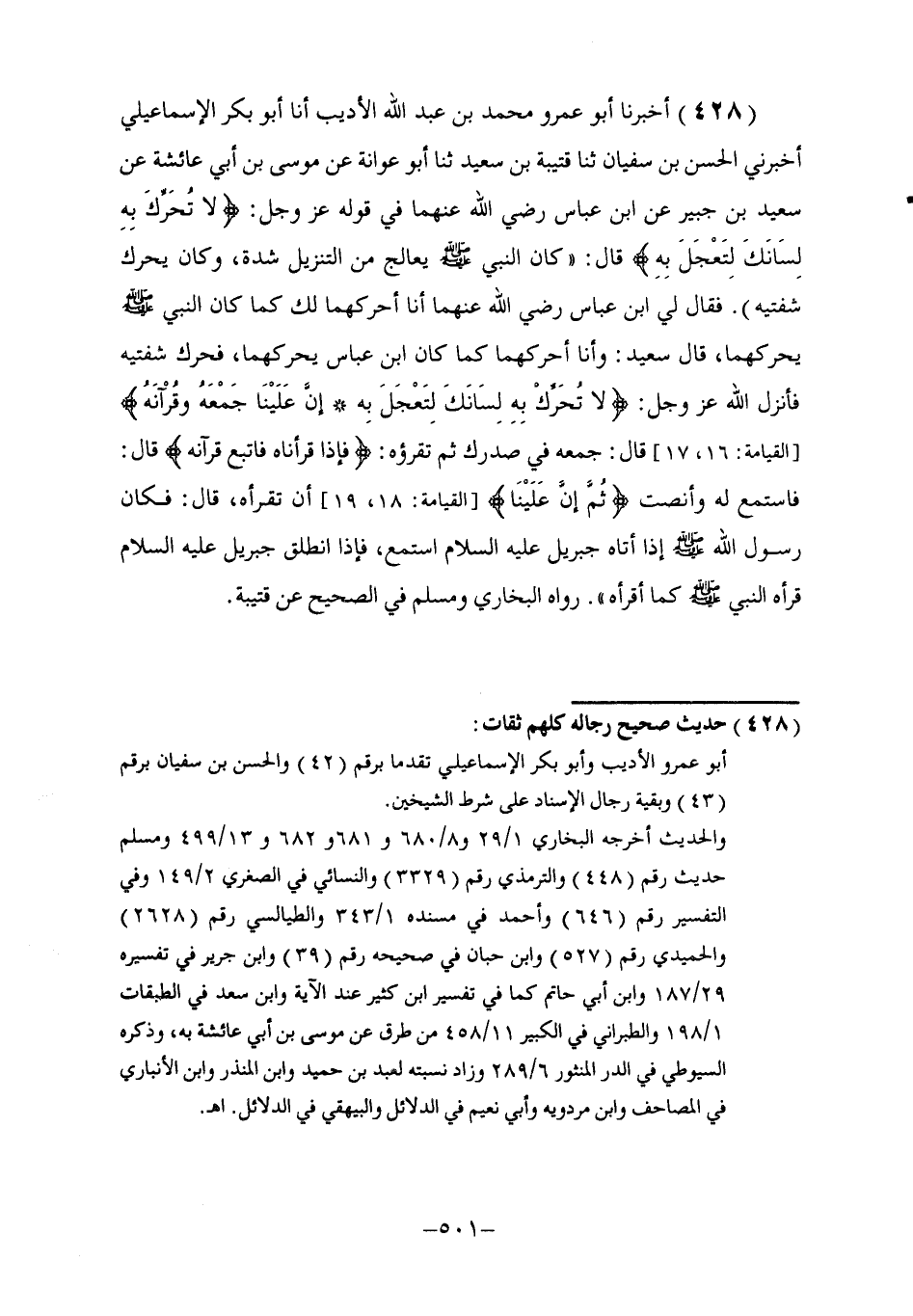 428 - أَخْبَرَنَا أَبُو عَمْرٍو مُحَمَّدُ بْنُ عَبْدِ اللَّهِ الْأَدِيبُ , أنا أَبُو بَكْرٍ الْإِسْمَاعِيلِيُّ , أَخْبَرَنِي الْحَسَنُ بْنُ سُفْيَانَ , ثنا قُتَيْبَةُ بْنُ سَعِيدٍ , ثنا أَبُو عَوَانَةَ , عَنْ مُوسَى بْنِ أَبِي عَائِشَةَ , عَنْ سَعِيدِ بْنِ جُبَيْرٍ , عَنِ ابْنِ عَبَّاسٍ , رَضِيَ اللَّهُ عَنْهُمَا فِي قَوْلِهِ عَزَّ وَجَلَّ: {§لَا تُحَرِّكْ بِهِ لِسَانَكَ لِتَعْجَلَ بِهِ} [القيامة: 16] قَالَ: كَانَ النَّبِيُّ صَلَّى اللهُ عَلَيْهِ وَسَلَّمَ يُعَالِجُ مِنَ التَّنْزِيلِ شِدَّةً , وَكَانَ يُحَرِّكُ شَفَتَيْهِ فَقَالَ لِي ابْنُ عَبَّاسٍ رَضِيَ اللَّهُ عَنْهُمَا , أَنَا أُحَرِّكُهُمَا لَكَ كَمَا كَانَ النَّبِيُّ صَلَّى اللهُ عَلَيْهِ وَسَلَّمَ يُحَرِّكُهُمَا , قَالَ سَعِيدٌ: وَأَنَا أُحَرِّكُهُمَا كَمَا كَانَ ابْنُ عَبَّاسٍ يُحَرِّكُهُمَا , فَحَرَّكُ شَفَتَيْهِ فَأَنْزَلَ اللَّهُ عَزَّ وَجَلَّ: {لَا تُحَرِّكْ بِهِ لِسَانَكَ لِتَعْجَلَ بِهِ إِنَّ عَلَيْنَا جَمَعَهُ وَقُرْآنَهُ} [القيامة: 17] , قَالَ: جَمْعُهُ فِي صَدْرِكَ , ثُمَّ تَقْرَؤُهُ: {فَإِذَا قَرَأْنَاهُ فَاتَّبِعْ قُرْآنَهُ} [القيامة: 18] قَالَ: فَاسْتَمِعْ لَهُ وَأَنْصِتْ , {ثُمَّ إِنَّ عَلَيْنَا} [القيامة: 19] أَنْ تَقْرَأَهُ , قَالَ: فَكَانَ رَسُولُ اللَّهِ صَلَّى اللهُ عَلَيْهِ وَسَلَّمَ إِذَا أَتَاهُ جِبْرِيلُ عَلَيْهِ السَّلَامُ اسْتَمَعَ , فَإِذَا انْطَلَقَ جِبْرِيلُ عَلَيْهِ السَّلَامُ قَرَأَهُ النَّبِيُّ صَلَّى اللهُ عَلَيْهِ وَسَلَّمَ كَمَا أَقَرَأَهُ رَوَاهُ الْبُخَارِيُّ وَمُسْلِمٌ فِي الصَّحِيحِ , عَنْ قُتَيْبَةَ
