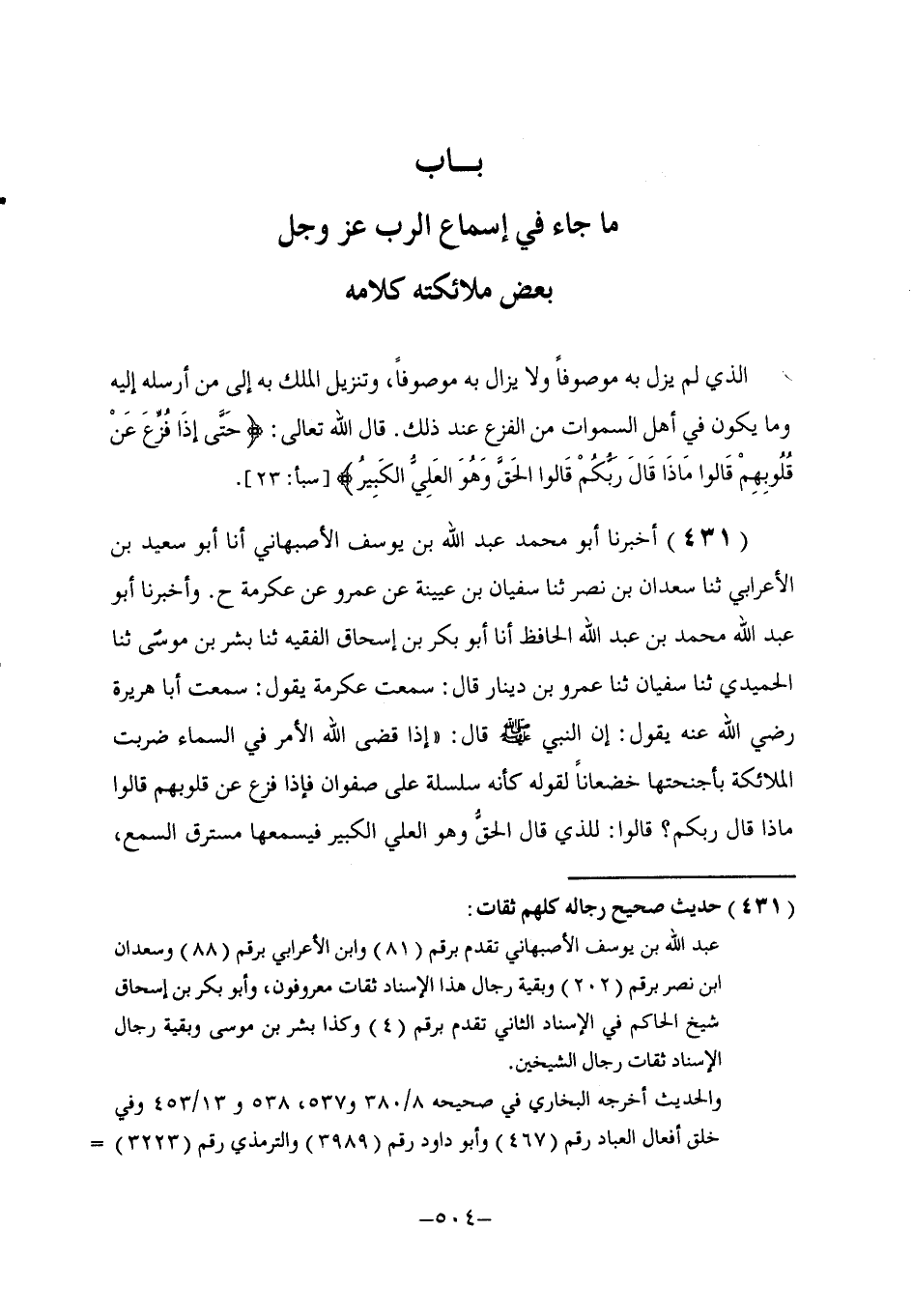 §بَابُ مَا جَاءَ فِي إِسْمَاعِ الرَّبِّ عَزَّ وَجَلَّ بَعْضَ مَلَائِكَتِهِ كَلَامَهُ الَّذِي لَمْ يَزَلْ بِهِ مَوْصُوفًا وَلَا يَزَالُ بِهِ مَوْصُوفًا , وَتَنْزِيلُ الْمَلَكِ بِهِ إِلَى مَنْ أُرْسِلَهُ إِلَيْهِ , وَمَا يَكُونُ فِي أَهْلِ السَّمَاوَاتِ مِنَ الْفَزَعِ عِنْدَ ذَلِكَ، قَالَ اللَّهُ تَعَالَى: " {حَتَّى إِذَا فُزِّعَ عَنْ قُلُوبِهِمْ قَالُوا مَاذَا قَالَ رَبُّكُمْ قَالُوا الْحَقَّ وَهُوَ الْعَلِيُّ الْكَبِيرُ} [سبأ: 23]