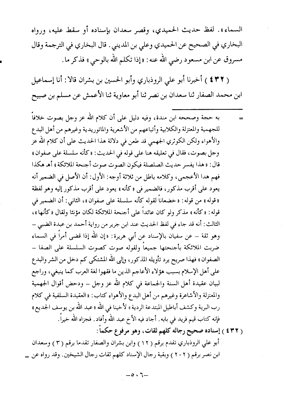 432 - أَخْبَرَنَا أَبُو عَلِيٍّ الرُّوذْبَارِيُّ , وَأَبُو الْحُسَيْنِ بْنُ بِشْرَانَ , قَالَا: أنا إِسْمَاعِيلُ بْنُ مُحَمَّدٍ الصَّفَّارُ , ثنا سَعْدَانُ بْنُ نَصْرٍ , ثنا أَبُو مُعَاوِيَةَ , ثنا الْأَعْمَشُ , عَنْ مُسْلِمِ بْنِ صُبَيْحٍ , -[507]- عَنْ مَسْرُوقٍ , عَنْ عَبْدِ اللَّهِ , رَضِيَ اللَّهُ عَنْهُ , قَالَ: " إِنَّ §اللَّهَ عَزَّ وَجَلَّ إِذَا تَكَلَّمَ بِالْوَحْيِ سَمِعَ أَهْلُ السَّمَاءِ لِلسَّمَاءِ صَلْصَلَةً كَجَرِّ السِّلْسِلَةِ عَلَى الصَّفَا , فَيُصْعَقُونَ , فَلَا يَزَالُونَ كَذَلِكَ حَتَّى يَأْتِيَهُمْ جِبْرِيلُ عَلَيْهِ السَّلَامُ , فَإِذَا جَاءَهُمْ جِبْرِيلُ فُزِّعَ عَنْ قُلُوبِهِمْ , قَالَ: فَيَقُولُونَ: يَا جِبْرِيلُ مَاذَا قَالَ رَبُّكَ؟ قَالَ: فَيَقُولُ الْحَقَّ , قَالَ: فَيُنَادُونَ الْحَقَّ الْحَقَّ " -[510]-