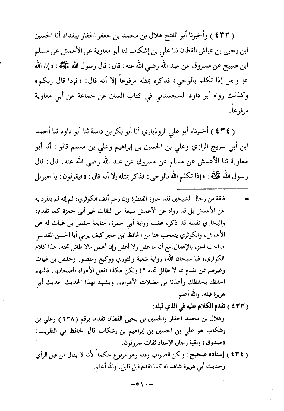 434 - أَخْبَرَنَاهُ أَبُو عَلِيٍّ الرُّوذْبَارِيُّ , أنا أَبُو بَكْرِ بْنُ دَاسَةَ , ثنا أَبُو دَاوُدَ , ثنا أَحْمَدُ بْنُ أَبِي سُرَيْجِ الرَّازِيُّ , وَعَلِيُّ بْنُ الْحُسَيْنِ بْنِ إِبْرَاهِيمَ , وَعَلِيُّ بْنُ مُسْلِمٍ , قَالُوا: أنا أَبُو مُعَاوِيَةَ , ثنا الْأَعْمَشُ , عَنْ مُسْلِمٍ , عَنْ مَسْرُوقٍ , عَنْ عَبْدِ اللَّهِ , رَضِيَ اللَّهُ عَنْهُ , قَالَ: قَالَ رَسُولُ اللَّهِ صَلَّى اللهُ عَلَيْهِ وَسَلَّمَ: §«إِذَا تَكَلَّمَ اللَّهُ بِالْوَحْيِ» فَذَكَرَ بِمِثْلِهِ إِلَّا أَنَّهُ قَالَ: " فَيَقُولُونَ: يَا جِبْرِيلُ -[511]- مَاذَا قَالَ رَبِّكَ؟ , فَيَقُولُ: الْحَقَّ , قَالَ: فَيَقُولُونَ: الْحَقَّ الْحَقَّ " وَرَوَاهُ شُعْبَةُ عَنِ الْأَعْمَشِ مَوْقُوفًا , وَقِيلَ عَنْهُ أَيْضًا مَرْفُوعًا , وَرُوِيَ مِنْ وَجْهَيْنِ آخَرِينَ مَرْفُوعًا