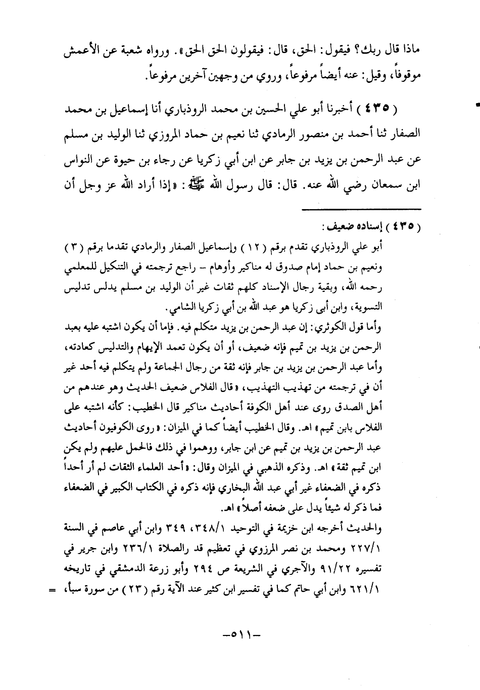 435 - أَخْبَرَنَا أَبُو عَلِيٍّ الْحُسَيْنُ بْنُ مُحَمَّدٍ الرُّوذْبَارِيُّ , أنا إِسْمَاعِيلُ بْنُ مُحَمَّدٍ الصَّفَّارُ , ثنا أَحْمَدُ بْنُ مَنْصُورٍ الرَّمَادِيُّ , ثنا نُعَيْمُ بْنُ حَمَّادٍ الْمَرْوَزِيُّ , ثنا الْوَلِيدُ بْنُ مُسْلِمٍ , عَنْ عَبْدِ الرَّحْمَنِ بْنِ يَزِيدَ بْنِ جَابِرٍ , عَنْ ابْنِ أَبِي زَكَرِيَّا , عَنْ رَجَاءِ بْنِ حَيْوَةَ , عَنِ النَّوَّاسِ بْنِ سَمْعَانَ , رَضِيَ اللَّهُ عَنْهُ , قَالَ: قَالَ رَسُولُ اللَّهِ صَلَّى اللهُ عَلَيْهِ وَسَلَّمَ: §" إِذَا أَرَادَ اللَّهُ عَزَّ وَجَلَّ أَنْ -[512]- يُوحِيَ بِأَمْرِهِ تَكَلَّمَ بِالْوَحْيِ , فَإِذَا تَكَلَّمَ أَخَذْتِ السَّماَوَاتُ رَجْفَةً - أَوْ قَالَ رَعْدَةً - شَدِيدَةً خَوْفًا مِنَ اللَّهِ عَزَّ وَجَلَّ , فَإِذَا سَمِعَ بِذَلِكَ أَهْلُ السَّمَاوَاتِ صُعِقُوا , وَخَرُّوا لِلَّهِ سُجَّدًا , فَيَكُونُ أَوَّلُ مَنْ يَرْفَعُ رَأْسَهُ جِبْرِيلُ عَلَيْهِ الصَّلَاةُ وَالسَّلَامُ , فَيُكَلِّمُهُ اللَّهُ تَعَالَى مِنْ وَحَيِّهِ مَا أَرَادَ فَيَمْضِي جِبْرِيلُ عَلَيْهِ السَّلَامُ عَلَى الْمَلَائِكَةِ كُلَّمَا مَرَّ بِسَمَاءٍ يَسْأَلُهُ مَلَائِكَتُهَا: مَاذَا قَالَ رَبُّنَا يَا جِبْرِيلُ؟ فَيَقُولُ جِبْرِيلُ: قَالَ الْحَقَّ وَهُوَ الْعَلِيُّ الْكَبِيرُ , قَالَ: فَيَقُولُونَ كُلُّهُمْ مِثْلَ مَا قَالَ جِبْرِيلُ , فَيَنْتَهِي جِبْرِيلُ بِالْوَحْيِ حَيْثُ أَمَرَهُ اللَّهُ عَزَّ وَجَلَّ مِنَ السَّمَاءِ وَالْأَرْضِ "