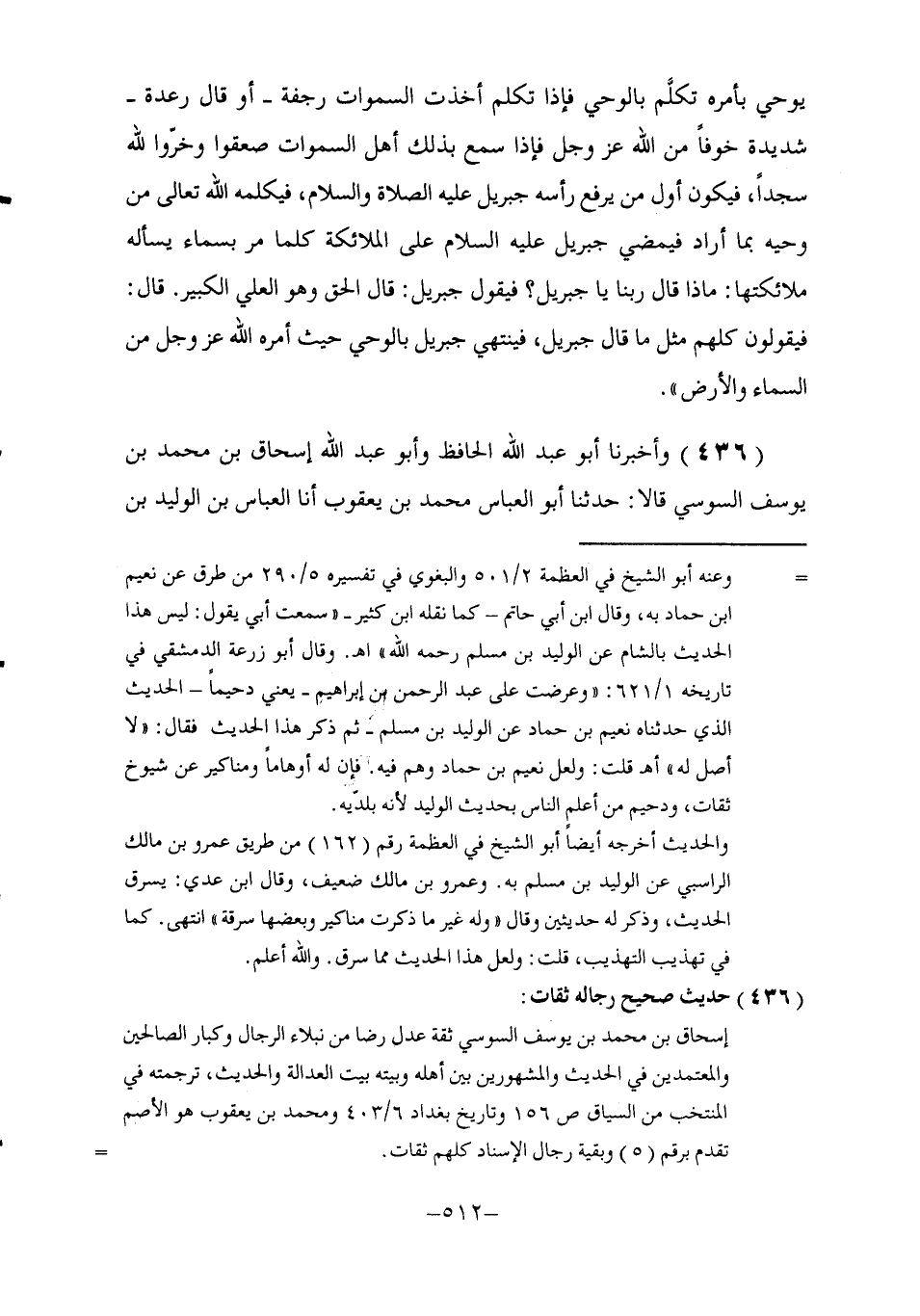 436 - وَأَخْبَرَنَا أَبُو عَبْدِ اللَّهِ الْحَافِظُ , وَأَبُو عَبْدِ اللَّهِ إِسْحَاقُ بْنُ مُحَمَّدِ بْنِ يُوسُفَ السُّوسِيُّ , قَالَا: حَدَّثَنَا أَبُو الْعَبَّاسِ مُحَمَّدُ بْنُ يَعْقُوبَ , أنا الْعَبَّاسُ بْنُ الْوَلِيدِ بْنِ -[513]- مَزْيَدٍ , أَخْبَرَنِي أَبِي , ثنا الْأَوْزَاعِيُّ , قَالَ: حَدَّثَنِي ابْنُ شِهَابٍ , عَنْ عَلِيِّ بْنِ حُسَيْنٍ , عَنْ عَبْدِ اللَّهِ بْنِ عَبَّاسٍ , رَضِيَ اللَّهُ عَنْهُمَا , قَالَ: حَدَّثَنِي رَجُلٌ , مِنَ الْأَنْصَارِ أَنَّهُمْ بَيْنَا هُمْ جُلُوسٌ، ح وَأَخْبَرَنَا أَبُو عَبْدِ اللَّهِ الْحَافِظُ , وَأَبُو عَبْدِ اللَّهِ إِسْحَاقُ , قَالَا: ثنا أَبُو الْعَبَّاسِ ثنا مُحَمَّدُ بْنُ عَوْفٍ , ثنا أَبُو الْمُغِيرَةِ , ثنا الْأَوْزَاعِيُّ , عَنِ الزُّهْرِيِّ , قَالَ: أَخْبَرَنِي عَلِيُّ بْنُ الْحُسَيْنِ، أُرَاهُ عَنِ ابْنِ عَبَّاسٍ رَضِيَ اللَّهُ عَنْهُمْ , قَالَ: أَخْبَرَنِي رَجُلٌ مِنْ أَصْحَابِ رَسُولِ اللَّهِ صَلَّى اللهُ عَلَيْهِ وَسَلَّمَ مِنَ الْأَنْصَارِ , قَالَ: بَيْنَا هُمْ جُلُوسٌ مَعَ رَسُولِ اللَّهِ صَلَّى اللهُ عَلَيْهِ وَسَلَّمَ , قَالَ: §رُمِيَ بِنَجْمٍ فَاسْتَنَارَ , فَقَالَ رَسُولُ اللَّهِ صَلَّى اللهُ عَلَيْهِ وَسَلَّمَ: «مَا كُنْتُمْ تَقُولُونَ فِي الْجَاهِلِيَّةِ إِذَا رُمِيَ بِمِثْلِ هَذَا؟» قَالُوا: اللَّهُ وَرَسُولُهُ أَعْلَمُ , كُنَّا نَقُولُ: وُلِدَ اللَّيْلَةَ رَجُلٌ عَظِيمٌ مَاتَ اللَّيْلَةَ رَجُلٌ عَظِيمٌ، فَقَالَ رَسُولُ اللَّهِ صَلَّى اللهُ عَلَيْهِ وَسَلَّمَ: " فَإِنَّهَا لَا تُرْمَى لِمَوْتِ أَحَدٍ , وَلَا لِحَيَاتِهِ؛ وَلَكِنَّ رَبَّنَا تَبَارَكَ وَتَعَالَى إِذَا قَضَى أَمْرًا سَبَّحَهُ حَمَلَةُ الْعَرْشِ ثُمَّ سَبَّحَهُ أَهْلُ السَّمَاءِ الَّذِينَ يَلُونَهُمْ , حَتَّى يَبْلُغَ التَّسْبِيحُ أَهْلَ السَّمَاءِ الدُّنْيَا , ثُمَّ يَقُولُ الَّذِينَ يَلُونَ حَمَلَةَ الْعَرْشِ لِحَمَلَةِ الْعَرْشِ: مَاذَا قَالَ رَبُّكُمْ؟ فَيُخْبِرُونَهُمْ , فَيَسْتَخْبِرُ أَهْلُ الْسَّمَاوَاتِ بَعْضُهُمْ بَعْضًا، حَتَّى يَبْلُغَ الْخَبَرُ هَذِهِ السَّمَاءَ فَتَخْطَفُ الْجِنُّ السَّمْعَ فَيُلْقُونَهُ إِلَى أَوْلِيَائِهِمْ , فَمَا جَاءُوا بِهِ عَلَى وَجْهِهِ فَهُوَ الْحَقُّ , وَلَكِنَّهُمْ يَقْرِفُونَ فِيهِ وَيَزِيدُونَ فِيهِ " أَخْرَجَهُ مُسْلِمٌ فِي الصَّحِيحِ مِنْ حَدِيثِ صَالِحِ بْنِ كَيْسَانَ وَالْأَوْزَاعِيِّ , وَيُونُسَ بْنِ يَزِيدَ , وَمَعْقِلِ بْنِ عُبَيْدِ اللَّهِ الْجَزَرِيِّ , عَنِ ابْنِ شِهَابٍ الزُّهْرِيِّ , وَزَادَ يُونُسَ فِي رِوَايَتِهِ , قَالَ: " وَقَالَ اللَّهُ عَزَّ وَجَلَّ {حَتَّى إِذَا فُزِّعَ عَنْ قُلُوبِهِمْ قَالُوا مَاذَا قَالَ رَبُّكُمْ قَالُوا الْحَقَّ} [سبأ: 23] وَقَالَ: وَلَكِنَّهُمْ يَرْقُونَ فِيهِ يَعْنِي يَزِيدُونَ