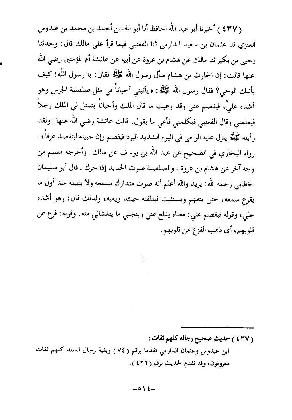 437 - أَخْبَرَنَا أَبُو عَبْدِ اللَّهِ الْحَافِظُ , أنا أَبُو الْحَسَنِ أَحْمَدُ بْنُ مُحَمَّدِ بْنِ عَبْدُوسٍ الْعَنَزِيُّ , ثنا عُثْمَانُ بْنُ سَعِيدِ الدَّارِمِيُّ , ثنا الْقَعْنَبِيُّ , فِيمَا قَرَأَ عَلَى مَالِكٍ , قَالَ: وَحَدَّثَنَا يَحْيَى بْنُ بُكَيْرٍ , ثنا مَالِكٌ , عَنْ هِشَامِ بْنِ عُرْوَةَ , عَنْ أَبِيهِ , عَنْ عَائِشَةَ أُمِّ الْمُؤْمِنِينَ , رَضِيَ اللَّهُ عَنْهَا , قَالَتْ: إِنَّ الْحَارِثَ بْنَ هِشَامٍ سَأَلَ رَسُولَ اللَّهِ صَلَّى اللهُ عَلَيْهِ وَسَلَّمَ , فَقَالَ: يَا رَسُولَ اللَّهِ , §كَيْفَ يَأْتِيكَ الْوَحْيُ؟ فَقَالَ رَسُولُ اللَّهِ صَلَّى اللهُ عَلَيْهِ وَسَلَّمَ: " يَأْتِينِي أَحْيَانًا فِي مِثْلِ صَلْصَلَةِ الْجَرَسِ وَهُوَ أَشَدُّهُ عَلَيَّ , فَيَفْصِمُ عَنِّي وَقَدْ وَعَيْتُ مَا قَالَ الْمَلِكُ وَأَحْيَانًا يَتَمَثَّلُ لِيَ الْمَلَكُ رَجُلًا فَيُعَلِّمُنِي , وَقَالَ الْقَعْنَبِيُّ فَيُكَلِّمُنِي فَأَعِي مَا يَقُولُ قَالَتْ عَائِشَةُ رَضِيَ اللَّهُ عَنْهَا: وَلَقَدْ رَأَيْتُهُ صَلَّى اللهُ عَلَيْهِ وَسَلَّمَ يَنْزِلُ عَلَيْهِ الْوَحْيُ فِي الْيَوْمِ الشَّدِيدِ الْبَرْدِ فَيُفْصَمَ , وَإِنَّ جَبِينَهُ لَيَتَفَصَّدُ عَرَقًا رَوَاهُ الْبُخَارِيُّ فِي الصَّحِيحِ , عَنْ عَبْدِ اللَّهِ بْنِ يُوسُفَ , عَنْ مَالِكٍ وَأَخْرَجَهُ مُسْلِمٌ مِنْ وَجْهٍ آخَرَ عَنْ هِشَامِ بْنِ عُرْوَةَ وَالصَّلْصَلَةُ: صَوْتُ الْحَدِيدِ إِذَا حُرِّكَ قَالَ أَبُو سُلَيْمَانَ الْخَطَّابِيُّ رَحِمَهُ اللَّهُ: يُرِيدُ - وَاللَّهُ أَعْلَمُ - أَنَّهُ صَوْتٌ مُتَدَارَكٌ يَسْمَعُهُ وَلَا يَتَبَيَّنَهُ عِنْدَ أَوَّلِ مَا يَقْرَعُ سَمْعَهُ , حَتَّى يَتَفَهَّمَ وَيَسْتَثْبِتَ فَيَتَلَقَّنَهُ حِينَئِذٍ وَيَعِيَهُ , وَلِذَلِكَ قَالَ: «وَهُوَ أَشَدُّهُ عَلَيَّ» , وَقَوْلُهُ فَيَفْصِمُ عَنِّي: مَعْنَاهُ يَقْلِعُ عَنِّي وَيَنْجَلِي مَا يَتَغَشَّانِي مِنْهُ وَقَوْلُهُ: فُزِّعَ عَنْ قُلُوبِهِمْ , أَيْ ذَهَبَ الْفَزَعُ عَنْ قُلُوبِهِمْ