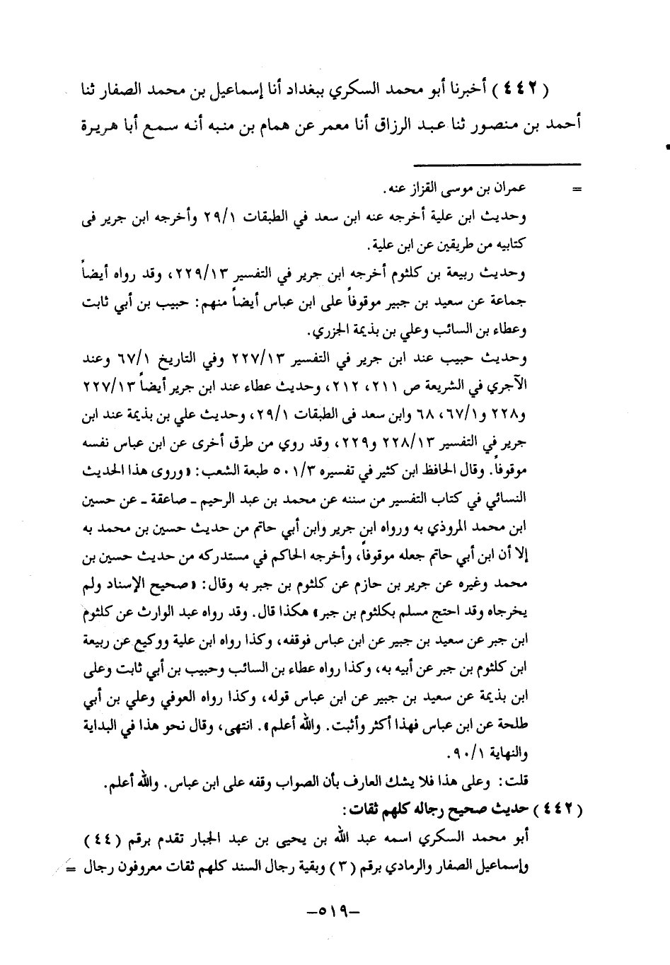 442 - أَخْبَرَنَا أَبُو مُحَمَّدٍ السُّكَّرِيُّ , بِبَغْدَادَ , أنا إِسْمَاعِيلُ بْنُ مُحَمَّدٍ الصَّفَّارُ , ثنا أَحْمَدُ بْنُ مَنْصُورٍ , ثنا عَبْدُ الرَّزَّاقِ , أنا مَعْمَرٌ , عَنْ هَمَّامِ بْنِ مُنَبِّهٍ , أَنَّهُ سَمِعَ أَبَا هُرَيْرَةَ , -[520]- رَضِيَ اللَّهُ عَنْهُ يَقُولُ: قَالَ رَسُولُ اللَّهِ صَلَّى اللهُ عَلَيْهِ وَسَلَّمَ: §" بَيْنَمَا أَيُّوبُ يَغْتَسِلُ عُرْيَانًا , خَرَّ عَلَيْهِ رِجْلُ جَرَادٍ مِنْ ذَهَبٍ؛ فَجَعَلَ أَيُّوبُ يَحْثِي فِي ثَوْبَهُ , قَالَ: فَنَادَاهُ رَبُهُ: أَلَمْ أَكُ أَغْنَيْتُكَ عَمَّا تَرَى؟ , قَالَ: بَلَى يَا رَبِّ , وَلَكِنْ لَا غِنًى لِي عَنْ بَرَكَتِكَ أَوْ قَالَ: عَنْ فَضْلِكَ " رَوَاهُ الْبُخَارِيُّ فِي الصَّحِيحِ , عَنْ عَبْدِ اللَّهِ بْنِ مُحَمَّدٍ , عَنْ عَبْدِ الرَّزَّاقِ