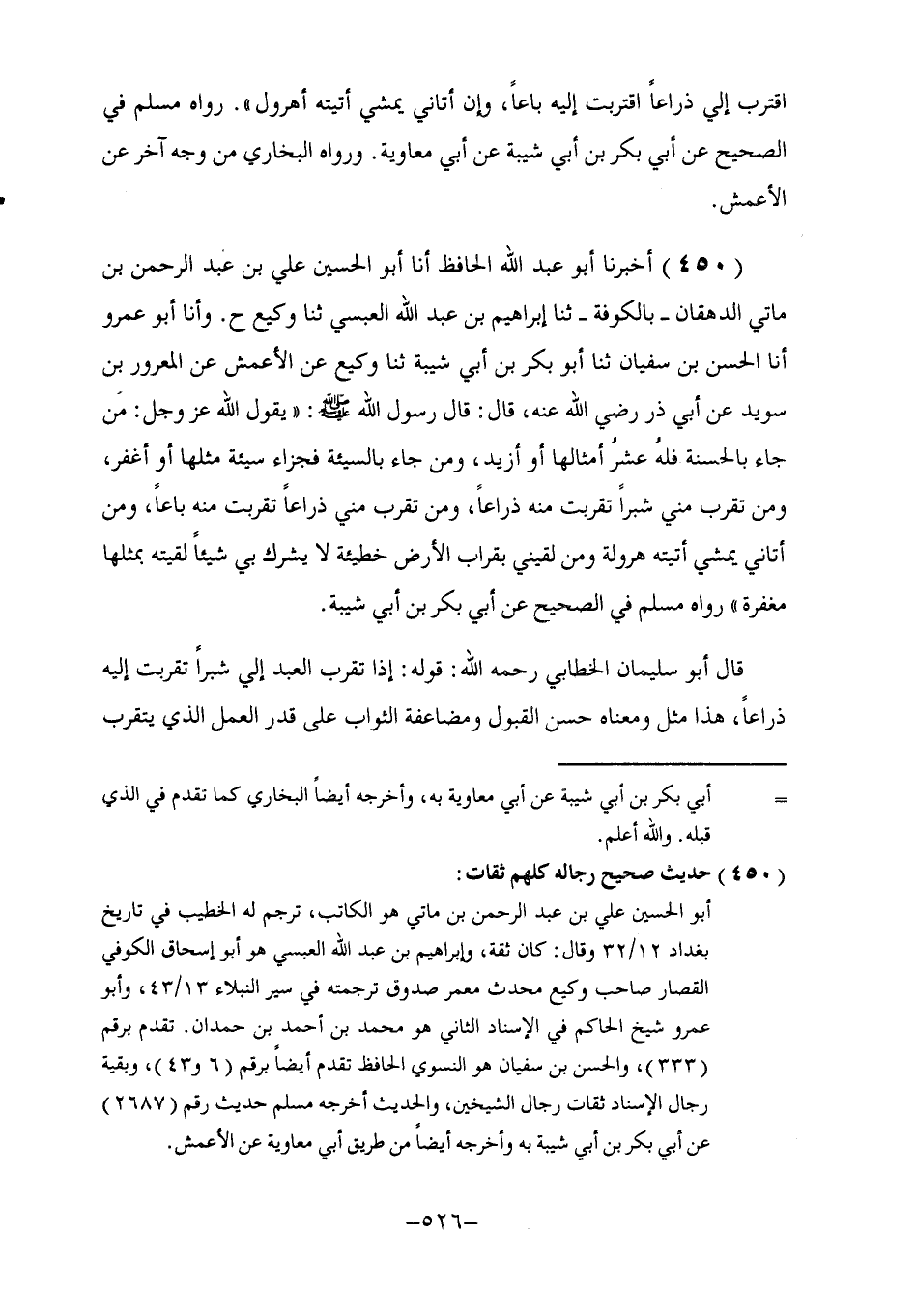 450 - أَخْبَرَنَا أَبُو عَبْدِ اللَّهِ الْحَافِظُ , أنا أَبُو الْحُسَيْنِ عَلِيُّ بْنُ عَبْدِ الرَّحْمَنِ بْنِ مَاتِي الدِّهْقَانُ بِالْكُوفَةِ ثنا إِبْرَاهِيمُ بْنُ عَبْدِ اللَّهِ الْعَبْسِيُّ , ثنا وَكِيعٌ , ح وَأنا أَبُو عَمْرٍو , أنا الْحَسَنُ بْنُ سُفْيَانَ , ثنا أَبُو بَكْرِ بْنُ أَبِي شَيْبَةَ , ثنا وَكِيعٌ , عَنِ الْأَعْمَشِ , عَنِ الْمَعْرُورِ بْنِ سُوَيْدٍ , عَنْ أَبِي ذَرٍّ , رَضِيَ اللَّهُ عَنْهُ , قَالَ: قَالَ رَسُولُ اللَّهِ صَلَّى اللهُ عَلَيْهِ وَسَلَّمَ: " يَقُولُ اللَّهُ عَزَّ وَجَلَّ: §مَنْ جَاءَ بِالْحَسَنَةِ فَلَهُ عَشَرُ أَمْثَالِهَا أَوْ أَزِيدُ , وَمَنْ جَاءَ بِالسَّيِّئَةِ فَجَزَاءُ سَيِّئَةٍ مِثْلُهَا أَوْ أَغْفِرُ , وَمَنْ تَقَرَّبَ مِنِّي شِبْرًا؛ تَقَرَّبْتُ مِنْهُ ذِرَاعًا , وَمَنْ تَقَرَّبَ مني ذِرَاعًا؛ تَقَرَّبْتُ مِنْهُ بَاعًا , وَمَنْ أَتَانِي يَمْشِي؛ أَتَيْتُهُ هَرْوَلَةً , وَمَنْ لَقِيَنِي بِقُرَابِ الْأَرْضِ خَطِيئَةً لَا يُشْرِكُ بِي شَيْئًا؛ لَقِيتُهُ بِمِثْلِهَا مَغْفِرَةً " رَوَاهُ مُسْلِمٌ فِي الصَّحِيحِ عَنْ أَبِي بَكْرِ بْنِ أَبِي شَيْبَةَ قَالَ أَبُو سُلَيْمَانَ الْخَطَّابِيُّ رَحِمَهُ اللَّهُ: قَوْلُهُ: إِذَا تَقَرَّبَ الْعَبْدُ إِلَيَّ شِبْرًا تَقَرَّبْتُ إِلَيْهِ ذِرَاعًا , هَذَا مَثَلٌ وَمَعْنَاهُ حُسْنُ الْقَبُولِ وَمُضَاعَفَةُ الثَّوَابِ عَلَى قَدْرِ الْعَمَلِ الَّذِي يَتَقَرَّبُ -[527]- بِهِ الْعَبْدُ إِلَى رَبِّهِ , حَتَّى يَكُونَ ذَلِكَ مُمَثَّلًا بِفِعْلِ مَنْ أَقْبَلَ نَحْوَ صَاحِبِهِ قَدْرَ شِبْرٍ فَاسْتَقْبَلَهُ صَاحِبُهُ ذِرَاعًا , وَكَمَنْ مَشَى إِلَيْهِ فَهَرْوَلَ إِلَيْهِ صَاحِبُهُ قَبُولًا لَهُ , وَزِيَادَةً فِي إِكْرَامِهِ , وَقَدْ يَكُونُ مَعْنَاهُ التَّوْفِيقَ لَهُ , وَالتَّيْسِيرَ لِلْعَمَلِ الَّذِي يُقَرِّبُهُ مِنْهُ وَاللَّهُ أَعْلَمُ