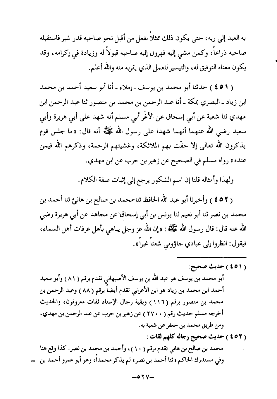 451 - حَدَّثَنَا أَبُو مُحَمَّدِ بْنُ يُوسُفَ إِمْلَاءً أنا أَبُو سَعِيدٍ أَحْمَدُ بْنُ مُحَمَّدِ بْنِ زِيَادٍ الْبَصْرِيُّ بِمَكَّةَ أنا عَبْدُ الرَّحْمَنِ بْنُ مُحَمَّدِ بْنِ مَنْصُورٍ , ثنا عَبْدُ الرَّحْمَنِ بْنُ مَهْدِيٍّ , ثنا شُعْبَةُ , عَنْ أَبِي إِسْحَاقَ , عَنِ الْأَغَرِّ أَبِي مُسْلِمٍ , أَنَّهُ شَهِدَ عَلَى أَبِي هُرَيْرَةَ وَأَبِي سَعِيدٍ رَضِيَ اللَّهُ عَنْهُمَا؛ أَنَّهُمَا شَهِدَا عَلَى رَسُولِ اللَّهِ صَلَّى اللهُ عَلَيْهِ وَسَلَّمَ , أَنَّهُ قَالَ: §«مَا جَلَسَ قَوْمٌ يَذْكُرُونَ اللَّهَ تَعَالَى إِلَّا حَفَّتْ بِهِمُ الْمَلَائِكَةُ , وَغَشِيَتْهُمُ الرَّحْمَةُ , وَذَكَرَهُمُ اللَّهُ فِيمَنْ عِنْدَهُ» رَوَاهُ مُسْلِمٌ فِي الصَّحِيحِ عَنْ زُهَيْرِ بْنِ حَرْبٍ , عَنِ ابْنِ مَهْدِيٍّ وَلِهَذَا وَأَمْثَالِهِ قُلْنَا: إِنَّ اسْمَ الشَّكُورِ يَرْجِعُ إِلَى إِثْبَاتِ صِفَةِ الْكَلَامِ