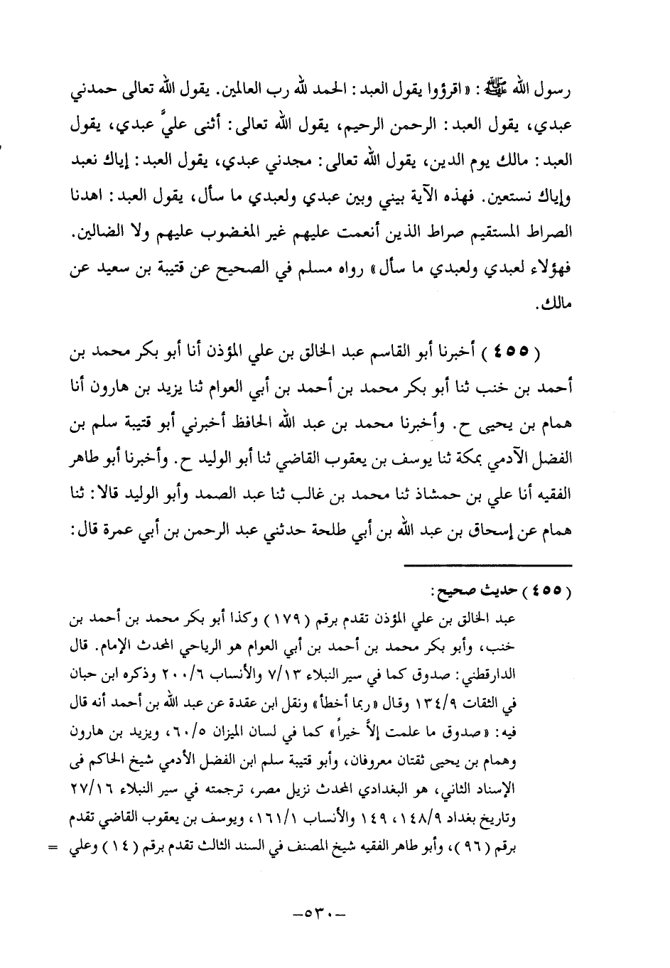 455 - أَخْبَرَنَا أَبُو الْقَاسِمِ عَبْدُ الْخَالِقِ بْنِ عَلِيٍّ الْمُؤَذِّنُ , أنا أَبُو بَكْرٍ مُحَمَّدُ بْنُ أَحْمَدَ بْنِ خَنْبٍ , ثنا أَبُو بَكْرٍ مُحَمَّدُ بْنُ أَحْمَدَ بْنِ أَبِي الْعَوَّامِ , ثنا يَزِيدُ بْنُ هَارُونَ , أنا هَمَّامُ بْنُ يَحْيَى ح , وَأَخْبَرَنَا مُحَمَّدُ بْنُ عَبْدِ اللَّهِ الْحَافِظُ , أَخْبَرَنِي أَبُو قُتَيْبَةَ سَلَمُ بْنَ الْفَضْلِ الْآدَمِيُّ بِمَكَّةَ , ثنا يُوسُفُ بْنُ يَعْقُوبَ الْقَاضِي , ثنا أَبُو الْوَلِيدِ ح , وَأَخْبَرَنَا أَبُو طَاهِرٍ الْفَقِيهُ , أنا عَلِيُّ بْنُ حَمْشَاذٍ , ثنا مُحَمَّدُ بْنُ غَالِبٍ , ثنا عَبْدُ الصَّمَدِ , وَأَبُو الْوَلِيدِ , قَالَا: ثنا هَمَّامُ , عَنْ إِسْحَاقَ بْنِ عَبْدِ اللَّهِ بْنِ أَبِي طَلْحَةَ , حَدَّثَنِي عَبْدُ الرَّحْمَنِ بْنُ أَبِي عَمْرَةَ , قَالَ: -[531]- سَمِعْتُ أَبَا هُرَيْرَةَ , رَضِيَ اللَّهُ عَنْهُ , يَقُولُ: سَمِعْتُ رَسُولَ اللَّهِ صَلَّى اللهُ عَلَيْهِ وَسَلَّمَ , يَقُولُ: " §إِنَّ رَجُلًا أَصَابَ ذَنْبًا , فَقَالَ: رَبِّ , إِنِّي أَصَبْتُ ذَنْبًا وَرُبَّمَا قَالَ: أَذْنَبْتُ ذَنْبًا فَاغْفِرْهُ لِي , فَقَالَ رَبُّهُ: عِلْمَ عَبْدِي أَنَّ لَهُ رَبًّا يَغْفِرُ الْذَّنْبَ , وَيَأْخُذُ بِهِ , قَدْ غَفَرْتُ لِعَبْدِي , قَالَ: ثُمَّ مَكَثَ مَا شَاءَ اللَّهُ , ثُمَّ أَذْنَبَ ذَنْبًا آخَرَ , فَقَالَ: رَبِّ , إِنِّي أَذْنَبْتُ ذَنْبًا وَرُبَّمَا قَالَ: أَصَبْتُ ذَنْبًا فَاغْفِرْهُ لِي , فَقَالَ رَبُّهُ: عَلِمَ عَبْدِي أَنَّ لَهُ رِبًا يَغْفِرُ الذَّنْبَ , وَيَأْخُذُ بِهِ , فَقَدْ غَفَرْتُ لِعَبْدِي , ثُمَّ مَكَثَ مَا شَاءَ اللَّهُ , ثُمَّ أَذْنَبَ ذَنْبًا آخَرَ , فَقَالَ: رَبِّ , إِنِّي أَذْنَبْتُ ذَنْبًا وَرُبَّمَا قَالَ: أَصَبْتُ ذَنْبًا , فَاغْفِرْهُ لِي , فَقَالَ رَبُّهُ تَبَارَكَ وَتَعَالَى: عَلِمَ عَبْدِي أَنَّ لَهُ رَبًّا يَغْفِرُ الذَّنْبَ , وَيَأْخُذُ بِهِ؛ قَدْ غَفَرْتُ لِعَبْدِي فَلْيَعْمَلْ مَا شَاءَ " لَفْظُ حَدِيثِ أَبِي الْوَلِيدِ , رَوَاهُ مُسْلِمٌ فِي الصَّحِيحِ , عَنْ عَبْدِ بْنِ حُمَيْدٍ , عَنْ أَبِي الْوَلِيدِ , وَأَخْرَجَهُ الْبُخَارِيُّ مِنْ وَجْهٍ آخَرَ , عَنْ هَمَّامٍ