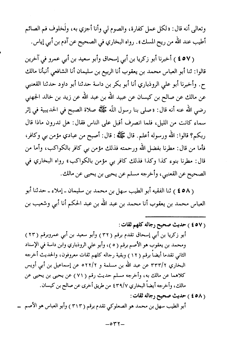 457 - أَخْبَرَنَا أَبُو زَكَرِيَّا بْنُ أَبِي إِسْحَاقَ , وَأَبُو سَعِيدِ بْنُ أَبِي عَمْرٍو فِي آخَرِينَ , قَالُوا: ثنا أَبُو الْعَبَّاسِ مُحَمَّدُ بْنُ يَعْقُوبَ , أنا الرَّبِيعُ بْنُ سُلَيْمَانَ , أنا الشَّافِعِيُّ , أَنْبَأَنَا مَالِكٌ ح , وَأَخْبَرَنَا أَبُو عَلِيٍّ الرُّوذْبَارِيُّ , أنا أَبُو بَكْرِ بْنُ دَاسَةَ , حَدَّثَنَا أَبُو دَاوُدَ , حَدَّثَنَا الْقَعْنَبِيُّ , عَنْ مَالِكٍ , عَنْ صَالِحِ بْنِ كَيْسَانَ , عَنْ عُبَيْدِ اللَّهِ بْنِ عَبْدِ اللَّهِ , عَنْ زَيْدِ بْنِ خَالِدِ الْجُهَنِيِّ , رَضِيَ اللَّهُ عَنْهُ , أَنَّهُ قَالَ: صَلَّى بِنَا رَسُولُ اللَّهِ صَلَّى اللهُ عَلَيْهِ وَسَلَّمَ صَلَاةَ الصُّبْحِ فِي الْحُدَيْبِيَةِ فِي إِثْرِ سَمَاءٍ كَانَتْ مِنَ اللَّيْلِ , فَلَمَّا انْصَرَفَ أَقْبَلَ عَلَى النَّاسِ , فَقَالَ: «هَلْ تَدْرُونَ مَاذَا قَالَ رَبُّكُمْ؟» , قَالُوا: اللَّهُ وَرَسُولُهُ أَعْلَمُ قَالَ صَلَّى اللهُ عَلَيْهِ وَسَلَّمَ: قَالَ: §" أَصْبَحَ مِنْ عِبَادِي مُؤْمِنٌ بِي , وَكَافِرٌ , فَأَمَّا مَنْ قَالَ: مُطِرْنَا بِفَضْلِ اللَّهِ وَرَحْمَتِهِ , فَذَلِكَ مُؤْمِنٌ بِي كَافِرٌ بِالْكَوَاكِبِ , وَأَمَّا مَنْ قَالَ: مُطِرْنَا بِنَوْءِ كَذَا وَكَذَا , فَذَلِكَ كَافِرٌ بِي مُؤْمِنٌ بِالْكَوَاكِبِ " رَوَاهُ الْبُخَارِيُّ فِي الصَّحِيحِ عَنِ الْقَعْنَبِيِّ , وَأَخْرَجَهُ مُسْلِمٌ , عَنْ يَحْيَى بْنِ يَحْيَى , عَنْ مَالِكٍ