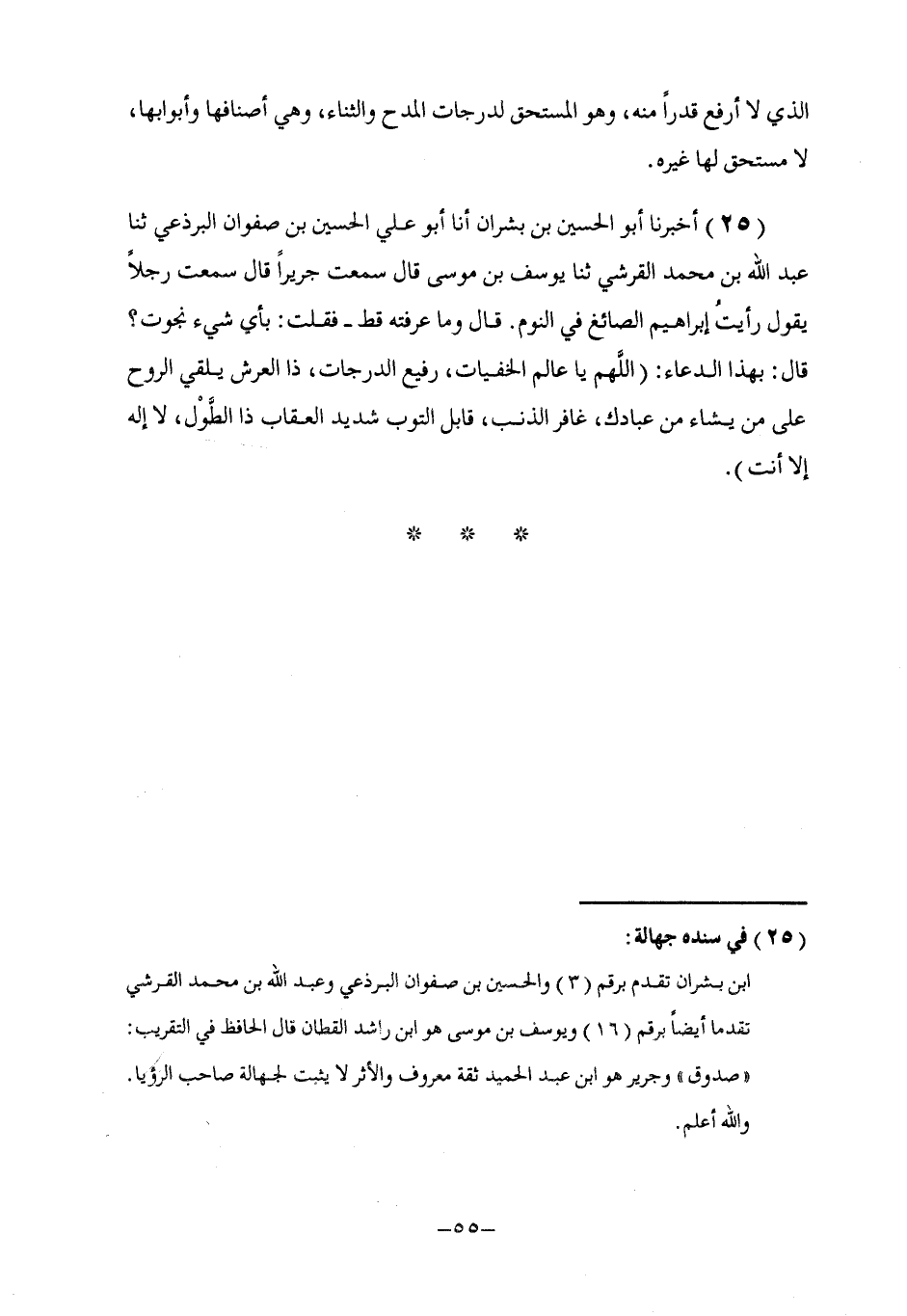 25 - أَخْبَرَنَا أَبُو الْحُسَيْنِ بْنُ بِشْرَانَ , أنا أَبُو عَلِيٍّ الْحُسَيْنُ بْنُ صَفْوَانَ الْبَرْذَعِيُّ , ثَنَا عَبْدُ اللَّهِ بْنُ مُحَمَّدٍ الْقُرَشِيُّ , ثَنَا يُوسُفُ بْنُ مُوسَى , قَالَ: سَمِعْتُ جَرِيرًا , قَالَ , سَمِعْتُ رَجُلًا , يَقُولُ: رَأَيْتُ إِبْرَاهِيمَ الصَّائِغَ فِي النَّوْمِ قَالَ: §وَمَا عَرَفْتُهُ قَطُّ , فَقُلْتُ: بِأَيِّ شَيْءٍ نَجَوْتَ؟ , قَالَ: بِهَذَا الدُّعَاءِ: «اللَّهُمَّ يَا عَالِمَ الْخَفِيَّاتِ , رَفِيعَ الدَّرَجَاتِ , ذَا الْعَرْشِ يُلْقِي الرُّوحَ عَلَى مَنْ يَشَاءُ مِنْ عِبَادِكَ , غَافِرَ الذَّنْبِ , قَابِلَ التَّوْبِ شَدِيدَ الْعِقَابِ ذَا الطُّوَلِ , لَا إِلَهَ إِلَّا أَنْتَ»
