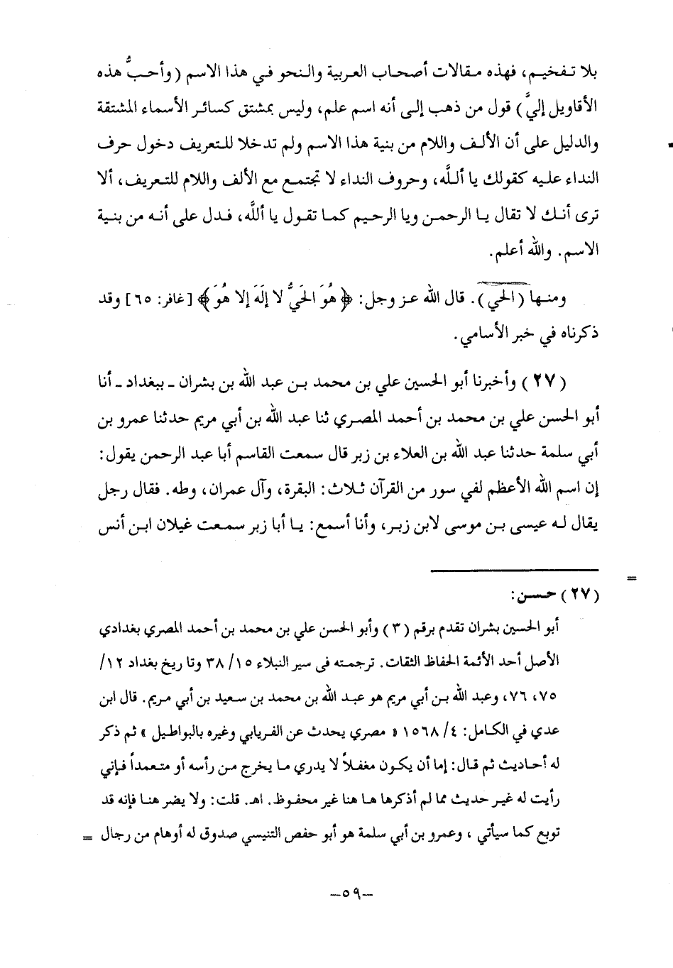 27 - وَأَخْبَرَنَا أَبُو الْحُسَيْنِ عَلِيُّ بْنُ مُحَمَّدِ بْنِ عَبْدِ اللَّهِ بْنِ بِشْرَانِ بِبَغْدَادَ أنا أَبُو الْحَسَنِ عَلِيُّ بْنُ مُحَمَّدِ بْنِ أَحْمَدَ الْمِصْرِيُّ , ثَنَا عَبْدُ اللَّهِ بْنُ أَبِي مَرْيَمَ , حَدَّثَنَا عَمْرُو بْنُ أَبِي سَلَمَةَ , حَدَّثَنَا عَبْدُ اللَّهِ بْنُ الْعَلَاءِ بْنِ زَبْرٍ , قَالَ: سَمِعْتُ الْقَاسِمَ أَبَا عَبْدِ الرَّحْمَنِ , يَقُولُ: §إِنَّ اسْمَ اللَّهِ الْأَعْظَمِ لَفِي سُوَرٍ مِنَ الْقُرْآنِ ثَلَاثٍ: الْبَقَرَةِ , وَآلِ عِمْرَانَ , وَطه , فَقَالَ رَجُلٌ يُقَالُ لَهُ: عِيسَى بْنُ مُوسَى لِابْنِ زَبْرٍ , وَأَنَا أَسْمَعُ: يَا أَبَا زَبْرٍ سَمِعْتُ غَيْلَانَ بْنَ أَنَسٍ -[60]- يُحَدِّثُ قَالَ: سَمِعْتُ الْقَاسِمَ أَبَا عَبْدِ الرَّحْمَنِ يُحَدِّثُ عَنْ أَبِي أُمَامَةَ الْبَاهِلِيِّ رَضِيَ اللَّهُ عَنْهُ عَنِ النَّبِيِّ صَلَّى اللهُ عَلَيْهِ وَسَلَّمَ أَنَّهُ قَالَ: " إِنَّ اسْمَ اللَّهِ الْأَعْظَمِ لَفِي سُوَرٍ مِنَ الْقُرْآنِ ثَلَاثٍ: الْبَقَرَةِ , -[61]- وَآلِ عِمْرَانَ , وَطه " , قَالَ أَبُو حَفْصٍ , عَمْرُو بْنُ أَبِي سَلَمَةَ: فَنَظَرْتُ أَنَا فِي هَذِهِ السُّوَرِ فَرَأَيْتُ فِيهَا شَيْئًا لَيْسَ فِي شَيْءٍ مِنَ الْقُرْآنِ مِثْلُهُ آيَةُ الْكُرْسِي {اللَّهُ لَا إِلَهَ إِلَّا هُوَ الْحَيُّ الْقَيُّومُ} [البقرة: 255] , وَفِي آلِ عِمْرَانَ {الم اللَّهُ لَا إِلَهَ إِلَّا هُوَ الْحَيُّ الْقَيُّومُ} [آل عمران: 2] , وَفِي طه {وَعَنَتِ الْوُجُوهُ لِلْحَيِّ الْقَيُّومِ} [طه: 111]