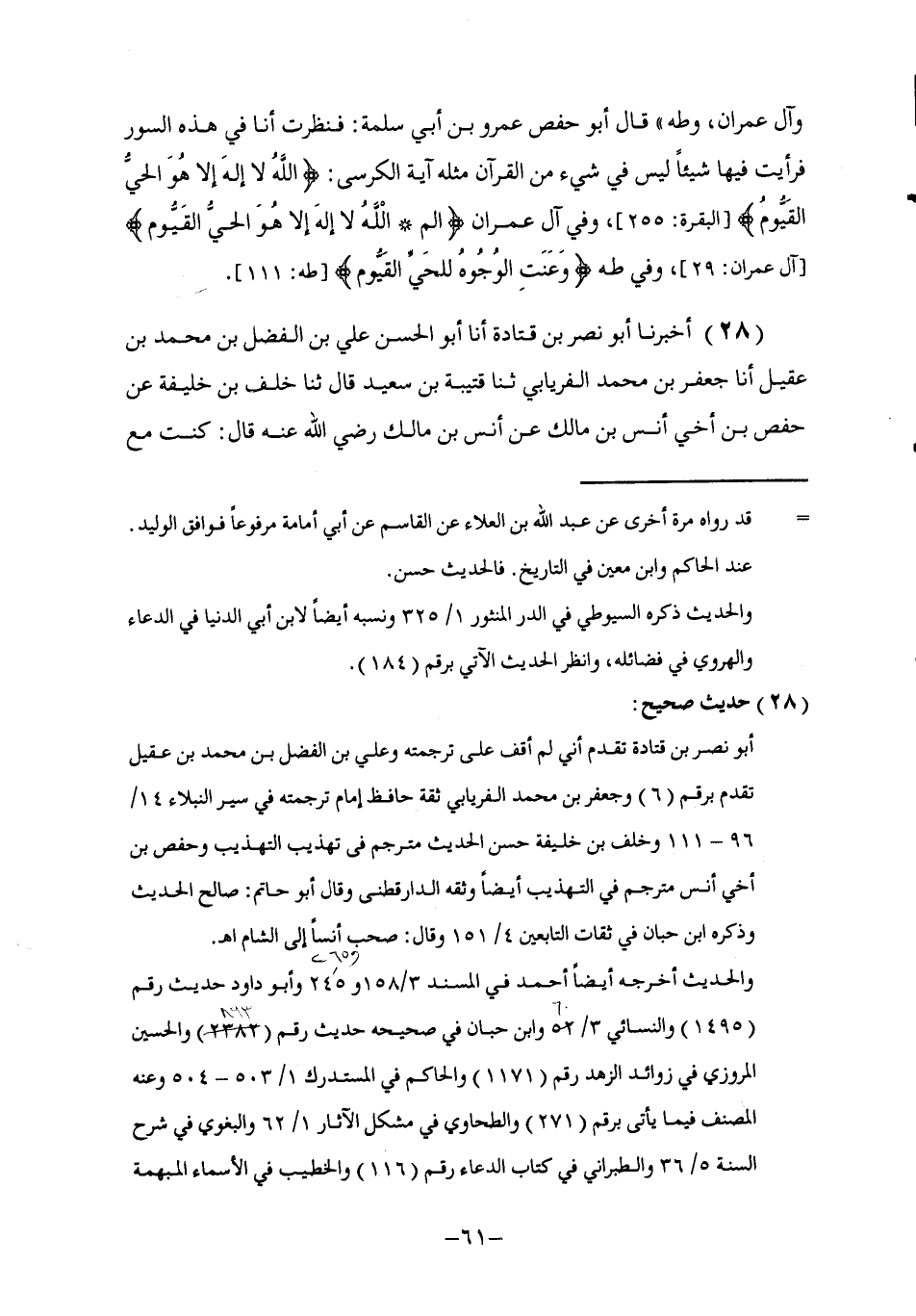 28 - أَخْبَرَنَا أَبُو نَصْرِ بْنُ قَتَادَةَ , أنا أَبُو الْحَسَنِ عَلِيُّ بْنُ الْفَضْلِ بْنِ مُحَمَّدِ بْنِ عَقِيلٍ أنا جَعْفَرُ بْنُ مُحَمَّدٍ الْفِرْيَابِيُّ , ثَنَا قُتَيْبَةُ بْنُ سَعِيدٍ , قَالَ: حَدَّثَنَا خَلَفُ بْنُ خَلِيفَةَ , عَنْ حَفْصِ ابْنِ أَخِي , أَنَسِ بْنِ مَالِكٍ عَنْ أَنَسِ بْنِ مَالِكٍ رَضِيَ اللَّهُ عَنْهُ , قَالَ: كُنْتُ مَعَ -[62]- رَسُولِ اللَّهِ صَلَّى اللهُ عَلَيْهِ وَسَلَّمَ جَالِسًا فِي الْحَلَقَةٍ وَرَجُلٌ قَائِمٌ يُصَلِّي , §فَلَمَّا رَكَعَ وَسَجَدَ تَشَهَّدَ وَدَعَا، فَقَالَ فِي دُعَائِهِ: «اللَّهُمَّ إِنِّي أَسْأَلُكُ بِأَنَّ لَكَ الْحَمْدَ لَا إِلَهَ إِلَّا أَنْتَ الْمَنَّانُ بَدِيعُ السَّمَاوَاتِ وَالْأَرْضِ , يَا ذَا الْجَلَالِ وَالْإِكْرَامِ , يَا حَيُّ يَا قَيُّومُ , إِنِّي أَسْأَلُكُ. . .» فَقَالَ النَّبِيُّ صَلَّى اللهُ عَلَيْهِ وَسَلَّمَ: «لَقَدْ دَعَا اللَّهَ بِاسْمِهِ الْعَظِيمِ , الَّذِي إِذَا دُعِيَ بِهِ أَجَابَ , وَإِذَا سُئِلَ بِهِ أَعْطَى» وَرَوَاهُ أَبُو دَاوُدَ السِّجِسْتَانِيُّ فِي كِتَابِ السُّنَنِ عَنْ عَبْدِ الرَّحْمَنِ بْنِ عُبَيْدِ اللَّهِ الْحَلَبِيِّ عَنْ خَلَفِ بْنِ خَلِيفَةَ -[63]- قَالَ الْحَلِيمِيُّ: وَإِنَّمَا يُقَالُ ذَلِكَ لِأَنَّ الْفِعْلَ عَلَى سَبِيلِ الِاخْتِيَارِ لَا يُوجَدُ إِلَّا مِنْ حَيٍّ , وَأَفْعَالُ اللَّهِ جَلَّ ثَنَاؤُهُ كُلُّهَا صَادِرَةٌ عَنْهُ بِاخْتِيَارِهِ , فَإِذَا أَثْبَتْنَاهَا لَهُ فَقَدْ أَثْبَتْنَا أَنَّهُ حَيٌّ , قَالَ أَبُو سُلَيْمَانَ: الْحَيُّ فِي صِفَةِ اللَّهِ سُبْحَانَهُ هُوَ الَّذِي لَمْ يَزَلْ مَوْجُودًا وَبِالْحَيَاةِ مَوْصُوفًا , لَمْ تَحْدُثْ لَهُ الْحَيَاةُ بَعْدَ مَوْتٍ , وَلَا يَعْتَرِضُهُ الْمَوْتُ بَعْدَ الْحَيَاةِ , وَسَائِرُ الْأَحْيَاءِ يَعْتَوِرُهُمُ الْمَوْتُ وَالْعَدَمُ فِي أَحَدِ طَرَفَيِ الْحَيَاةِ أَوْ فِيهِمَا مَعًا {كُلُّ شَيْءٍ هَالِكٌ إِلَّا وَجْهَهُ} [القصص: 88] وَمِنْهَا «الْعَالِمُ» قَالَ اللَّهُ عَزَّ وَجَلَّ {عَالِمُ الْغَيْبِ وَالشَّهَادَةِ} [الأنعام: 73]
