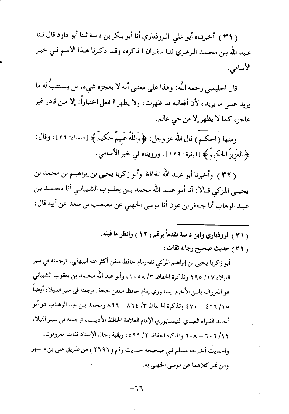 32 - وَأَخْبَرَنَا أَبُو عَبْدِ اللَّهِ الْحَافِظُ , وَأَبُو زَكَرِيَّا يَحْيَى بْنُ إِبْرَاهِيمَ بْنِ مُحَمَّدِ بْنِ يَحْيَى الْمُزَكِّي قَالَا: أنا أَبُو عَبْدِ اللَّهِ مُحَمَّدُ بْنُ يَعْقُوبَ الشَّيْبَانِيُّ أنا مُحَمَّدُ بْنُ عَبْدِ الْوَهَّابِ , أنا جَعْفَرُ بْنُ عَوْنٍ , أنا مُوسَى الْجُهَنِيُّ , عَنْ مُصْعَبِ بْنِ سَعْدٍ , عَنْ أَبِيهِ , قَالَ: -[67]- جَاءَ إِلَى رَسُولِ اللَّهِ أَعْرَابِيٌّ فَقَالَ: §عَلِّمْنِي كَلَامًا أَقُولُهُ: قَالَ: «قُلْ لَا إِلَهَ إِلَّا اللَّهُ وَحْدَهُ لَا شَرِيكَ لَهُ اللَّهُ أَكْبَرُ كَبِيرًا وَالْحَمْدُ لِلَّهِ كَثِيرًا وَسُبْحَانَ اللَّهِ رَبِّ الْعَالَمِينَ وَلَا حَوْلَ وَلَا قُوَّةَ إِلَّا بِاللَّهِ الْعَزِيزِ الْحَكِيمِ» , قَالَ: هَذَا لِرَبِّي فَمَا لِي؟ قَالَ رَسُولُ اللَّهِ صَلَّى اللهُ عَلَيْهِ وَسَلَّمَ: «قُلِ اللَّهُمَّ اغْفِرْ لِي وَارْحَمْنِي وَاهْدِنِي وَعَافِنِي وَارْزُقْنِي» أَخْرَجَهُ مُسْلِمٌ فِي الصَّحِيحِ مِنْ وَجْهَيْنِ آخَرِينَ عَنْ مُوسَى الْجُهَنِيِّ قَالَ الْحَلِيمِيُّ فِي مَعْنَى الْحَكِيمِ: الَّذِي لَا يَقُولُ وَلَا يَفْعَلُ إِلَّا الصَّوَابُ , وَإِنَّمَا يَنْبَغِي أَنْ يُوصَفَ بِذَلِكَ لِأَنَّ أَفْعَالَهُ سَدِيدَةٌ , وَصُنْعَهُ مُتْقَنٌ , وَلَا يَظْهَرُ الْفِعْلُ الْمُتْقَنُ السَّدِيدُ إِلَّا مِنْ حَكِيمٍ , كَمَا لَا يَظْهَرُ الْفِعْلُ عَلَى وَجْهِ الِاخْتِيَارِ إِلَّا مِنْ حَيٍّ عَالِمٍ قَدِيرٍ , قَالَ أَبُو سُلَيْمَانَ: الْحَكِيمُ هُوَ الْمُحْكِمُ لِخَلْقِ الْأَشْيَاءِ صُرِّفَ عَنْ مِفْعَلٍ إِلَى فَعِيلٍ , وَمَعْنَى الْإِحْكَامِ لِخَلْقِ الْأَشْيَاءِ إِنَّمَا يَنْصَرِفُ إِلَى إِتْقَانِ التَّدْبِيرِ فِيهَا , وَحُسْنِ التَّقْدِيرِ لَهَا , إِذْ لَيْسَ كُلُّ الْخَلِيقَةِ مَوْصُوفًا بِوَثَاقَةِ الْبِنْيَةِ وَشِدَّةِ الْأَسْرِ كَالْبَقَّةِ وَالنَّمْلَةِ , وَمَا أَشْبَهَهُمَا مِنْ ضِعَافِ الْخَلْقِ , إِلَّا أَنَّ التَّدْبِيرَ فِيهِمَا وَالدَّلَالَةُ بِهِمَا عَلَى وُجُودِ الصَّانِعِ وَإِثْبَاتِهِ , لَيْسَ بِدُونِ الدَّلَالَةِ عَلَيْهِ بِخَلْقِ السَّمَاءِ وَالْأَرْضِ وَالْجِبَالِ , وَسَائِرِ مَعَاظِمِ الْخَلِيقَةِ , وَكَذَلِكَ هَذَا فِي قَوْلِهِ عَزَّ وَجَلَّ: {الَّذِي أَحْسَنَ كُلَّ شَيْءٍ خَلَقَهُ} [السجدة: 7] , لَمْ تَقَعِ الْإِشَارَةُ بِهِ إِلَى الْحُسْنِ الرَّائِقِ فِي الْمَنْظَرِ , فَإِنَّ هَذَا الْمَعْنَى مَعْدُومٌ فِي الْقِرْدِ وَالْخِنْزِيرِ وَالدُّبِّ وَأَشْكَالِهَا مِنَ الْحَيَوَانِ , وَإِنَّمَا يَنْصَرِفُ الْمَعْنَى فِيهِ إِلَى حُسْنِ التَّدْبِيرِ فِي إِنْشَاءِ كُلِّ خَلْقٍ مِنْ خَلْقِهِ عَلَى مَا أَحَبَّ أَنْ يُنْشِئَهٌ عَلَيْهِ , وَإِبْرَازِهِ عَلَى الْهَيْئَةِ الَّتِي أَرَادَ أَنْ يُهَيِّئَهُ عَلَيْهَا كَقَوْلِهِ عَزَّ وَجَلَّ: {وَخَلَقَ كُلَّ شَيْءٍ فَقَدَّرَهُ تَقْدِيرًا} [الفرقان: 2] وَمِنْهَا «السَّيِّدُ» وَهَذَا اسْمٌ لَمْ يَأْتِ بِهِ الْكِتَابُ وَلَكِنَّهُ مَاثُورٌ عَنِ الرَّسُولِ صَلَّى اللهُ عَلَيْهِ وَسَلَّمَ