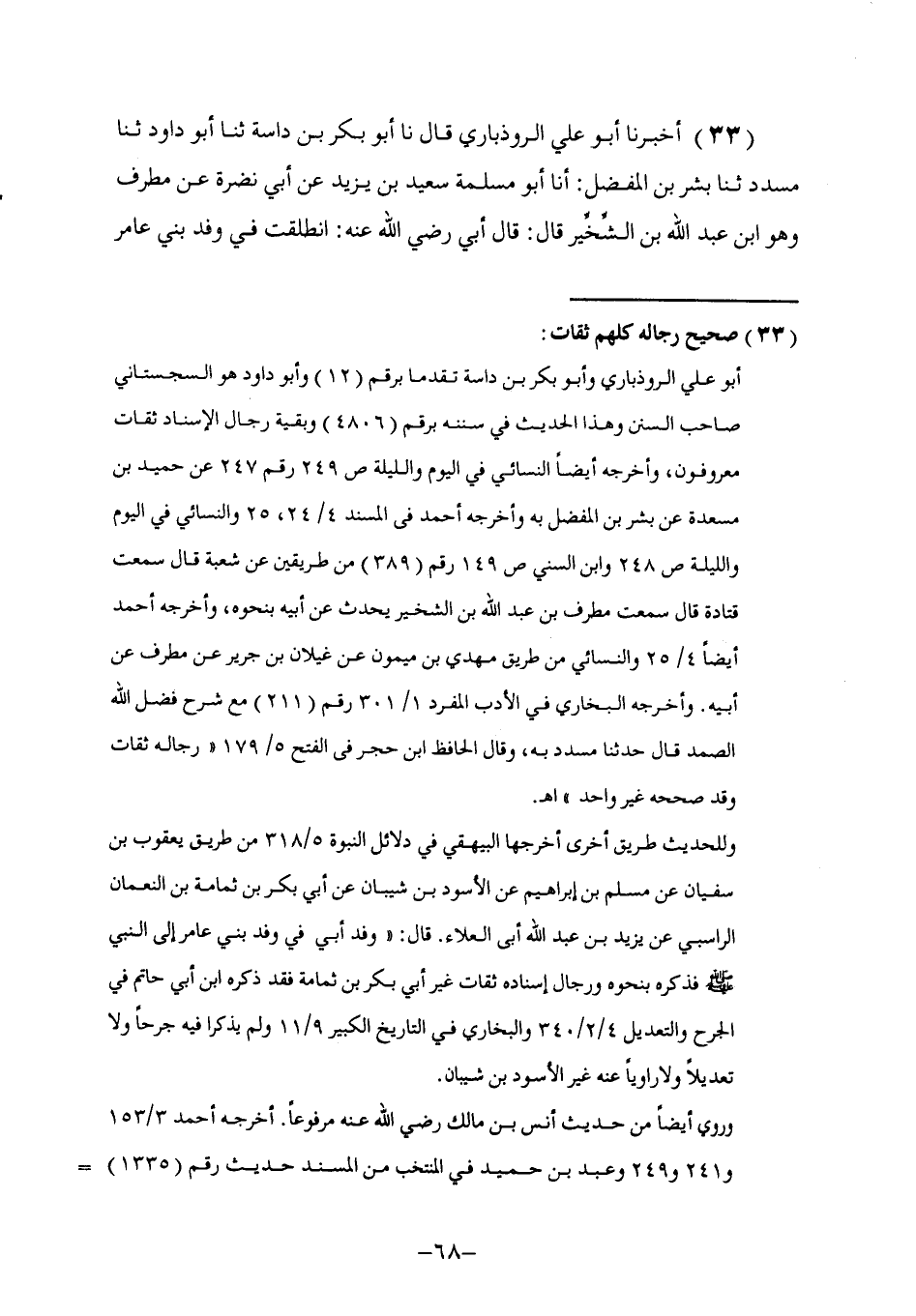 33 - أَخْبَرَنَا أَبُو عَلِيٍّ الرُّوذْبَارِيُّ , قَالَ: نا أَبُو بَكْرِ بْنُ دَاسَةَ , ثنا أَبُو دَاوُدَ , ثنا مُسَدَّدٌ ثنا بِشْرُ بْنُ الْمُفَضَّلِ , أنا أَبُو مَسْلَمَةَ , سَعِيدُ بْنُ يَزِيدَ عَنْ أَبِي نَضْرَةَ , عَنْ مُطَرِّفٍ , وَهُوَ ابْنُ عَبْدِ اللَّهِ بْنُ الشِّخِّيرِ , قَالَ: قَالَ أَبِي رَضِيَ اللَّهُ عَنْهُ: انْطَلَقْتُ فِي وَفْدِ بَنِي عَامِرٍ -[69]- إِلَى رَسُولِ اللَّهِ صَلَّى اللهُ عَلَيْهِ وَسَلَّمَ فَقُلْنَا: أَنْتَ سَيِّدُنَا فَقَالَ رَسُولُ اللَّهِ صَلَّى اللهُ عَلَيْهِ وَسَلَّمَ: «§السَّيِّدُ اللَّهُ» قُلْنَا: فَأَفْضَلُنَا فَضْلًا وَأَعْظَمُنَا طَوْلًا فَقَالَ صَلَّى اللهُ عَلَيْهِ وَسَلَّمَ: «قُولُوا بِقَوْلِكُمْ أَوْ بِبَعْضِ قَوْلِكُمْ , وَلَا يَسْتَجْرِيَنَّكُمُ الشَّيْطَانُ» قَالَ الْحَلِيمِيُّ: وَمَعْنَاهُ الْمُحْتَاجُ إِلَيْهِ بِالْإِطْلَاقِ فَإِنَّ سَيِّدَ النَّاسِ إِنَّمَا هُوَ رَأْسُهُمُ الَّذِي إِلَيْهِ يَرْجِعُونَ , وَبِأَمْرِهِ يَعْمَلُونَ , وَعَنْ رَأْيِهِ يَصْدُرُونَ وَمِنْ قَوْلِهِ يَسْتَهْدُونُ , فَإِذَا كَانَتِ الْمَلَائِكَةُ وَالْإِنْسُ وَالْجِنُّ خَلْقًا لِلْبَارِي جَلَّ ثَنَاؤُهُ وَلَمْ يَكُنْ بِهِمْ غِنْيَةٌ عَنْهُ فِي بَدْءِ أَمْرِهِمْ وَهُوَ الْوُجُودُ , إِذْ لَوْ لَمْ يُوجِدْهُمْ لَمْ يُوجَدُوا , وَلَا فِي الْإِبْقَاءِ بَعْدَ الْإِيجَادِ , وَلَا فِي الْعَوَارِضِ الْعَارِضَةِ أَثْنَاءَ الْبَقَاءِ , كَانَ حَقًّا لَهُ جَلَّ ثَنَاؤُهُ أَنْ يَكُونَ سَيِّدًا , وَكَانَ حَقًا عَلَيْهِمْ أَنْ يَدْعُوهُ بِهَذَا الِاسْمِ. وَمِنْهَا «الْجَلِيلُ» وَذَلِكَ مِمَّا وَرَدَ بِهِ الْأَثَرُ عَنِ النَّبِيِّ صَلَّى اللهُ عَلَيْهِ وَسَلَّمَ فِي خَبَرِ الْأَسَامِي وَفِي الْكِتَابِ {ذُو الْجَلَالِ وَالْإِكْرَامِ} [الرحمن: 27] وَمَعْنَاهُ الْمُسْتَحِقُّ لِلْأَمْرِ وَالنَّهْيِ , فَإِنَّ -[70]- جَلَالَ الْوَاحِدِ فِيمَا بَيْنَ النَّاسِ إِنَّمَا يَظْهَرُ بِأَنْ يَكُونَ لَهُ عَلَى غَيْرِهِ أَمْرٌ نَافِذٌ لَا يَجِدُ مِنْ طَاعَتِهِ فِيهِ بُدًّا , فَإِذَا كَانَ مِنْ حَقِّ الْبَارِي جَلَّ ثَنَاؤُهُ عَلَى مَنْ أَبْدَعَهُ أَنْ يَكُونَ أَمْرُهُ عَلَيْهِ نَافِذًا , وَطَاعَتُهُ لَهُ لَازِمَةً , وَجَبَ لَهُ اسْمُ الْجَلِيلِ حَقًّا , وَكَانَ لِمَنْ عَرَفَهُ أَنْ يَدْعُوهُ بِهَذَا الِاسْمِ , وَبِمَا يَجْرِي مَجْرَاهُ , وَيُؤَدِّي مَعْنَاهُ قَالَ أَبُو سُلَيْمَانِ: هُوَ مِنَ الْجَلَالِ وَالْعَظَمَةِ , وَمَعْنَاهُ مُنْصَرِفٌ إِلَى جَلَالِ الْقَدْرِ , وَعِظَمِ الشَّأْنِ , فَهُوَ الْجَلِيلُ الَّذِي يَصْغُرُ دُونَهُ كُلُّ جَلِيلٍ , وَيَتَّضِعُ مَعَهُ كُلُّ رَفِيعٍ. وَمِنْهَا «الْبَدِيعُ» قَالَ اللَّهُ جَلَّ ثَنَاؤُهُ: {بَدِيعُ السَّمَاوَاتِ وَالْأَرْضِ} [البقرة: 117] وَقَدْ رُوِّينَاهُ فِي خَبَرِ الْأَسَامِي