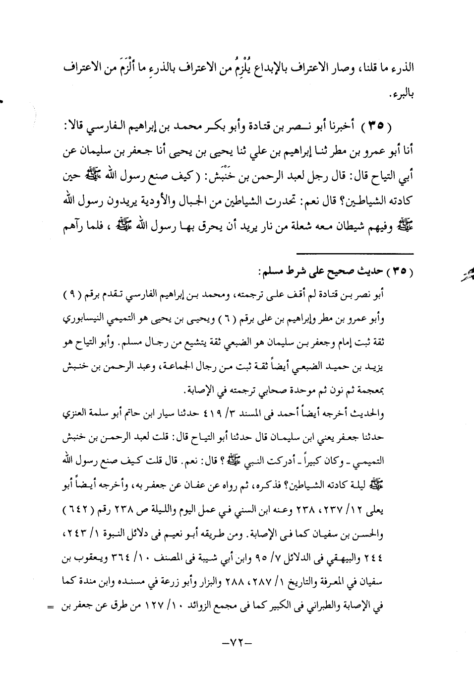 35 - أَخْبَرَنَا أَبُو نَصْرِ بْنُ قَتَادَةَ , وَأَبُو بَكْرٍ مُحَمَّدُ بْنُ إِبْرَاهِيمَ الْفَارِسِيُّ , قَالَا: أنا أَبُو عَمْرٍو بْنُ مَطَرٍ , ثنا إِبْرَاهِيمُ بْنُ عَلِيٍّ , ثنا يَحْيَى بْنُ يَحْيَى , أنا جَعْفَرُ بْنُ سُلَيْمَانَ , عَنْ أَبِي التَّيَّاحِ , قَالَ: قَالَ رَجُلٌ لِعَبْدِ الرَّحْمَنِ بْنِ خَنْبَشٍ: كَيْفَ صَنَعَ رَسُولُ اللَّهِ صَلَّى اللهُ عَلَيْهِ وَسَلَّمَ حِينَ كَادَتْهُ الشَّيَاطِينُ؟ قَالَ: نَعَمْ تَحَدَّرَتِ الشَّيَاطِينُ مِنَ الْجِبَالِ وَالْأَوْدِيَةِ يُرِيدُونَ رَسُولَ اللَّهِ صَلَّى اللهُ عَلَيْهِ وَسَلَّمَ وَفِيهِمْ شَيْطَانٌ مَعَهُ شُعْلَةٌ مِنْ نَارٍ يُرِيدُ أَنْ يَحْرِقَ بِهَا رَسُولَ اللَّهِ صَلَّى اللهُ عَلَيْهِ وَسَلَّمَ , فَلَمَّا رَآهُمْ -[73]- رَسُولُ اللَّهِ صَلَّى اللهُ عَلَيْهِ وَسَلَّمَ فَزِعَ مِنْهُمْ وَجَاءَهُ جِبْرِيلُ عَلَيْهِ السَّلَامُ فَقَالَ: قُلْ يَا مُحَمَّدُ , قَالَ: «مَا أَقُولُ؟» , قَالَ: " §قُلْ: أَعُوذُ بِكَلِمَاتِ اللَّهِ التَّامَّاتِ الَّتِي لَا يُجَاوِزُهُنَّ بُرٌّ وَلَا فَاجِرٌ , مِنْ شَرِّ مَا خَلَقَ وَبَرَأَ وَذَرَأَ , وَمِنْ شَرِّ مَا يَنْزِلُ مِنَ السَّمَاءِ وَمِنْ شَرِّ مَا يَعْرُجُ فِيهَا , وَمِنْ شَرِّ مَا ذَرَأَ فِي الْأَرْضِ وَمَا يَخْرُجُ مِنْهَا , وَمِنْ شَرِّ فِتَنِ اللَّيْلِ وَالنَّهَارِ , وَمِنْ شَرِّ كُلِّ طَارِقٍ إِلَّا طَارِقًا يَطْرُقُ بِخَيْرٍ يَا رَحْمَنُ" قَالَ: فَطُفِئَتْ نَارُ الشَّيَاطِينِ وَهَزَمَهُمُ اللَّهُ عَزَّ وَجَلَّ وَمِنْهَا «الْخَالِقُ» قَالَ اللَّهُ عَزَّ وَجَلَّ: {هَلْ مِنْ خَالِقٍ غَيْرُ اللَّهِ} [فاطر: 3] , قَالَ الْحَلِيمِيُّ: وَمَعْنَاهُ الَّذِي صَنَّفَ الْمُبْدَعَاتِ , وَجَعَلَ لِكُلِّ صِنْفٍ مِنْهَا قَدْرًا فَوَجَدَ فِيهَا الصَّغِيرَ وَالْكَبِيرَ وَالطَّوِيلَ وَالْقَصِيرَ وَالْإِنْسَانَ وَالْبَهِيمَةَ وَالدَّابَّةَ وَالطَّائِرَ وَالْحَيَوَانَ وَالْمَوَاتَ , وَلَا شَكَّ فِي أَنَّ الِاعْتِرَافَ بِالْإِبْدَاعِ يَقْتَضِي الِاعْتِرَافَ بِالْخَلْقِ , إِذْ أَنَّ الْخَلْقَ هَيْئَةُ الْإِبْدَاعِ , فَلَا يُعَرَّى أَحَدُهُمَا عَنِ الْآخَرِ , وَهُوَ فِي خَبَرِ الْأَسَامِي مَذْكُورٌ
