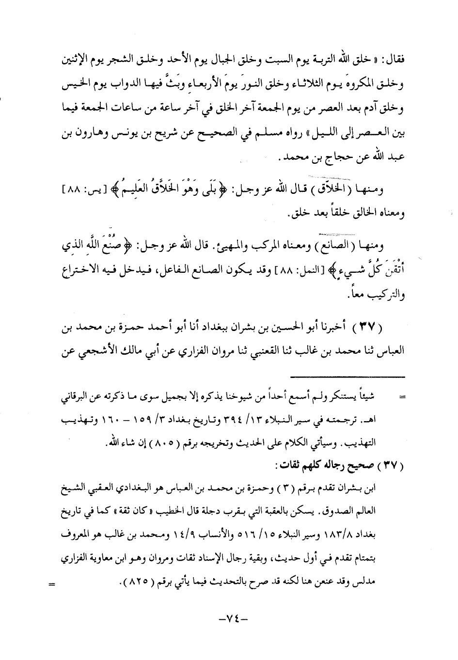 37 - أَخْبَرَنَا أَبُو الْحُسَيْنِ بْنُ بِشْرَانَ , بِبَغْدَادَ , أنا أَبُو أَحْمَدَ حَمْزَةُ بْنُ مُحَمَّدِ بْنِ الْعَبَّاسِ , ثنا مُحَمَّدُ بْنُ غَالِبٍ , ثنا الْقَعْنَبِي , ثنا مَرْوَانُ الْفَزَارِيُّ , عَنْ أَبِي مَالِكٍ الْأَشْجَعِيِّ , عَنْ -[75]- رِبْعِيِّ بْنِ حِرَاشِ , عَنْ حُذَيْفَةَ , رَضِيَ اللَّهُ عَنْهُ قَالَ: قَالَ رَسُولُ اللَّهِ صَلَّى اللهُ عَلَيْهِ وَسَلَّمَ: §«إِنَّ اللَّهَ عَزَّ وَجَلَّ صَنَعَ كُلَّ صَانِعٍ وَصَنْعَتِهِ» وَمِنْهَا «الْفَاطِرُ» قَالَ اللَّهُ جَلَّ ثَنَاؤُهُ: {الْحَمْدُ لِلَّهِ فَاطِرِ السَّمَاوَاتِ الْأَرْضِ} وَذَكَرْنَاهُ فِي خَبَرِ الْأَسَامِي فِي رِوَايَةِ عَبْدِ الْعَزِيزِ بْنِ الْحُصَيْنِ