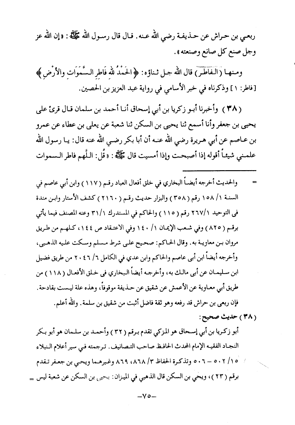 38 - وَأَخْبَرَنَا أَبُو زَكَرِيَّا بْنُ إِسْحَاقَ , أنا أَحْمَدُ بْنُ سلْمَانَ , قَالَ: قُرِئَ عَلَى يَحْيَى بْنِ جَعْفَرٍ وَأَنَا أَسْمَعُ , ثنا يَحْيَى بْنُ السَّكَنِ , ثنا شُعْبَةُ , عَنْ يَعْلَى بْنِ عَطَاءٍ , عَنْ عَمْرِو بْنِ عَاصِمٍ , عَنْ أَبِي هُرَيْرَةَ , رَضِيَ اللَّهُ عَنْهُ أَنَّ أَبَا بَكْرٍ رَضِيَ اللَّهُ عَنْهُ قَالَ: يَا رَسُولَ اللَّهِ عَلِّمْنِي §شَيْئًا أَقُولُهُ إِذَا أَصْبَحْتُ وَإِذَا أَمْسَيْتُ , قَالَ صَلَّى اللهُ عَلَيْهِ وَسَلَّمَ: " قُلِ: اللَّهُمَّ فَاطِرَ السَّمَاوَاتِ -[76]- وَالْأَرْضِ عَالِمَ الْغَيْبِ وَالشَّهَادَةِ رَبَّ كُلِّ شَيْءٍ وَمَلِيكَهُ , أَشْهَدُ أَنْ لَا إِلَهَ إِلَّا اللَّهُ , أَعُوذُ بِكَ مِنْ شَرِّ نَفْسِي وَشَرِّ الشَّيْطَانِ وَشِرْكِهِ قُلْهُ إِذَا أَصْبَحْتَ وَإِذَا أَمْسَيْتَ وَإِذَا أَخَذْتَ مَضْجِعَكَ " قَالَ الْحَلِيمِيُّ فِي مَعْنَى الْفَاطِرِ: إنَّهُ فَاتِقِ الْمُرْتَتَقِ مِنَ السَّمَاءِ وَالْأَرْضِ قَالَ اللَّهُ عَزَّ وَجَلَّ: {أَوَ لَمْ يَرَ الَّذِينَ كَفَرُوا أَنَّ السَّمَاوَاتِ وَالْأَرْضَ كَانَتَا رَتْقًا فَفَتَقْنَاهُمَا} فَقَدْ يَكُونُ الْمَعْنَى كَانَتِ السَّمَاءُ دُخَانًا فَسَوَّاهَا: {وَأَغْطَشَ لَيْلَهَا وَأَخْرَجَ ضُحَاهَا} [النازعات: 29] , وَكَانَتِ الْأَرْضُ غَيْرَ مَدْحُوَّةٍ فَدَحَاهَا , {أَخْرَجَ مِنْهَا مَاءَهَا وَمَرْعَاهَا} [النازعات: 31] , وَمَنْ قَالَ هَذَا قَالَ: {أَوَ لَمْ يَرَ الَّذِينَ كَفَرُوا} , مَعْنَاهُ أَوَ لَمْ يَعْلَمُوا وَقَدْ يَكُونُ الْمَعْنَى مَا رُوِيَ فِي بَعْضِ الْآثَارِ: فَتَقْنَا السَّمَاءَ بِالْمَطَرِ وَالْأَرْضَ بِالنَّبَاتِ