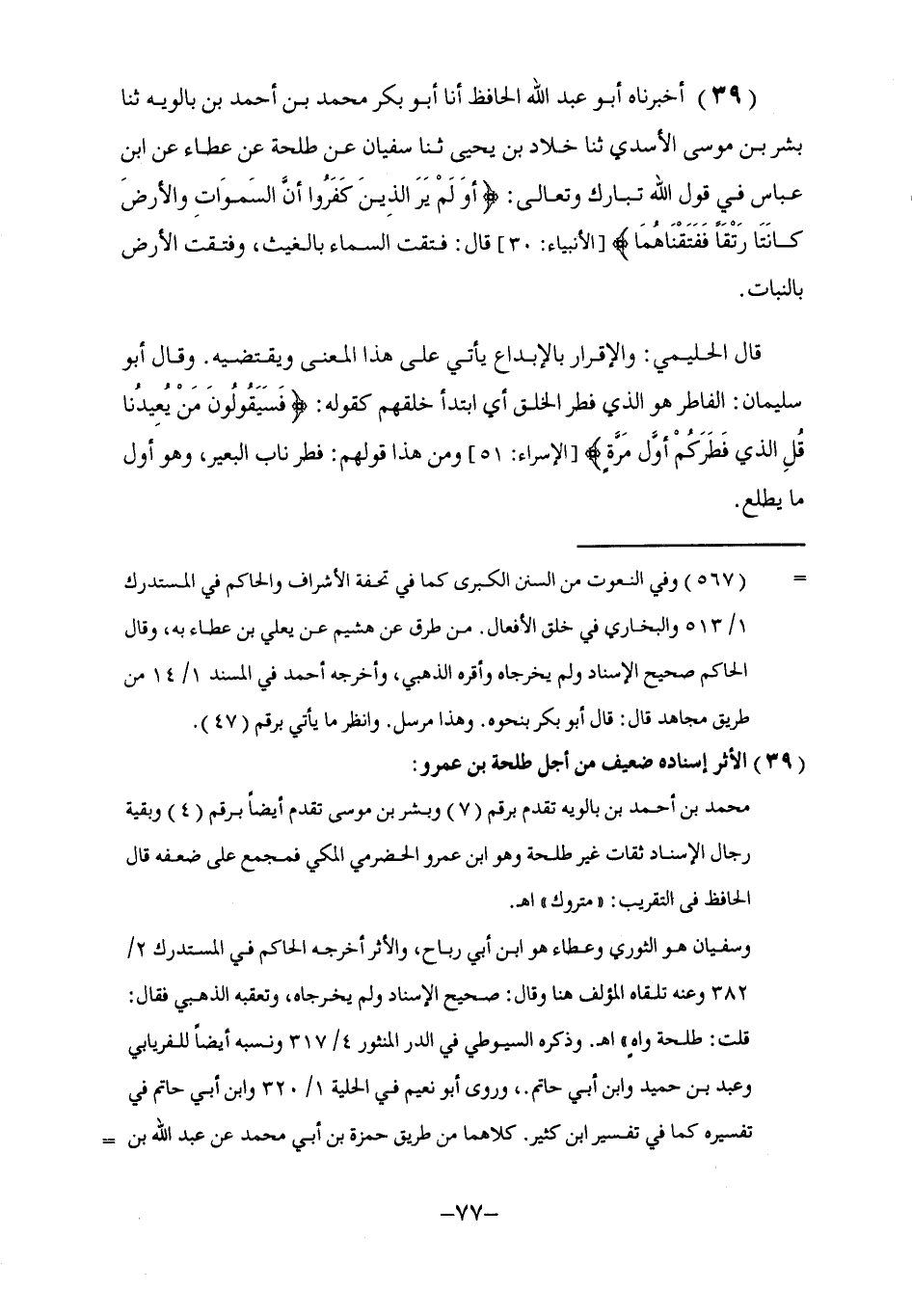 39 - أَخْبَرَنَاه أَبُو عَبْدِ اللَّهِ الْحَافِظُ , أنا أَبُو بَكْرٍ مُحَمَّدُ بْنُ أَحْمَدَ بْنِ بَالَوَيْهِ , ثنا بِشْرُ بْنُ مُوسَى الْأَسَدِيُّ , ثنا خَلَّادُ بْنُ يَحْيَى , ثنا سُفْيَانُ , عَنْ طَلْحَةَ , عَنْ عَطَاءٍ , عَنِ ابْنِ عَبَّاسٍ , فِي قَوْلِ اللَّهِ تَبَارَكَ وَتَعَالَى: {§أَوَ لَمْ يَرَ الَّذِينَ كَفَرُوا أَنَّ السَّمَاوَاتِ وَالْأَرْضَ كَانَتَا رَتْقًا} فَفَتَقْنَاهُمَا , قَالَ: فُتِقَتِ السَّمَاءُ بِالْغَيْثِ , وَفُتِقَتِ الْأَرْضُ بِالنَّبَاتِ، قَالَ الْحَلِيمِيُّ: وَالْإِقْرَارُ بِالْإِبْدَاعِ يَأْتِي عَلَى هَذَا الْمَعْنَى وَيَقْتَضِيهِ وَقَالَ أَبُو سُلَيْمَانَ: الْفَاطِرُ هُوَ الَّذِي فَطَرَ الْخَلْقَ أَيِ ابْتَدَأَ خَلَقَهُمْ كَقَوْلِهِ: {فَسَيَقُولُونَ مَنْ يُعِيدُنَا قُلِ الَّذِي فَطَرَكُمْ أَوَّلَ مَرَّةٍ} [الإسراء: 51] وَمِنْ هَذَا قَوْلُهُمْ: فَطَرَ نَابُ الْبَعِيرِ , وَهُوَ أَوَّلُ مَا يَطْلُعُ