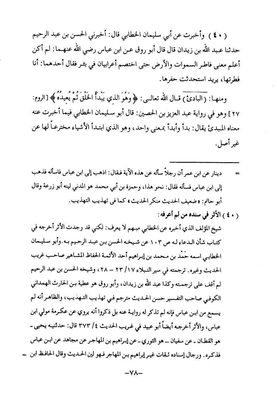 40 - أُخْبِرْتُ عَنْ أَبِي سُلَيْمَانَ الْخَطَّابِيِّ , قَالَ: أَخْبَرَنِي الْحَسَنُ بْنُ عَبْدِ الرَّحِيمِ , ثنا عَبْدُ اللَّهِ بْنُ زَيْدَانَ , قَالَ: قَالَ أَبُو رَوْقٍ عَنِ ابْنِ عَبَّاسٍ , رَضِيَ اللَّهُ عَنْهُمَا§: لَمْ أَكُنْ أَعْلَمُ مَعْنَى فَاطِرِ السَّمَاوَاتِ وَالْأَرْضِ حَتَّى اخْتَصَمَ أَعْرَابِيَّانِ فِي بِئْرٍ فَقَالَ أَحَدُهُمَا: أَنَا فَطَرْتُهَا , يُرِيدُ اسْتَحْدَثْتُ حَفْرَهَا وَمِنْهَا «الْبَادِئُ» قَالَ اللَّهُ تَعَالَى: {وَهُوَ الَّذِي يَبْدَأُ الْخَلْقَ ثُمَّ يُعِيدُهُ} [الروم: 27] وَهُوَ فِي رِوَايَةِ عَبْدِ الْعَزِيزِ بْنِ الْحُصَيْنِ: قَالَ أَبُو سُلَيْمَانَ الْخَطَّابِيُّ فِيمَا أُخْبِرْتُ عَنْهُ مَعْنَاهُ الْمُبْدِئُ يُقَالُ: بَدَأَ وَأَبْدَأَ بِمَعْنًى وَاحِدٍ , وَهُوَ الَّذِي ابْتَدَأَ الْأَشْيَاءَ مُخْتَرِعًا لَهَا عَنْ غَيْرِ أَصْلٍ -[79]- وَمِنْهَا «الْمُصَوِّرُ» قَالَ اللَّهُ جَلَّ ثَنَاؤُهُ: {هُوَ اللَّهُ الْخَالِقُ الْبَارِئُ الْمُصَوِّرُ} [الحشر: 24] وَرُوِّينَاهُ فِي خَبَرِ الْأَسَامِي قَالَ الْحَلِيمِيُّ: مَعْنَاهُ الْمُهَيِّئُ لِمَنَاظِرِ الْأَشْيَاءِ عَلَى مَا أَرَادَهُ مِنْ تَشَابُهٍ أَوْ تَخَالُفٍ , وَالِاعْتِرَافُ بِالْإِبْدَاعِ يَقْتَضِي الِاعْتِرَافَ بِمَا هُوَ مِنْ لَوَاحِقِهِ قَالَ الْخَطَّابِيُّ: الْمُصَوِّرُ الَّذِي أَنْشَأَ خَلْقَهُ عَلَى صُوَرٍ مُخْتَلِفَةٍ لِيَتَعَارَفُوا بِهَا , وَمَعْنَى التَّصْوِيرِ التَّخْطِيطُ وَالتَّشْكِيلُ , وَخَلَقَ اللَّهُ عَزَّ وَجَلَّ الْإِنْسَانَ فِي أَرْحَامِ الْأُمَّهَاتِ ثَلَاثَ خَلْقٍ يُعْرَفُ بِهَا وَيَتَمَيَّزُ عَنْ غَيْرِهِ بِسِمَتِهَا , جَعَلَهُ عَلَقَةً , ثُمَّ مُضْغَةً , ثُمَّ جَعَلَهُ صُورَةً , وَهُوَ التَّشْكِيلُ الَّذِي يَكُونُ بِهِ ذَا صُورَةٍ وَهَيْئَةٍ: {فَتَبَارَكَ اللَّهُ أَحْسَنُ الْخَالِقِينَ} [المؤمنون: 14]