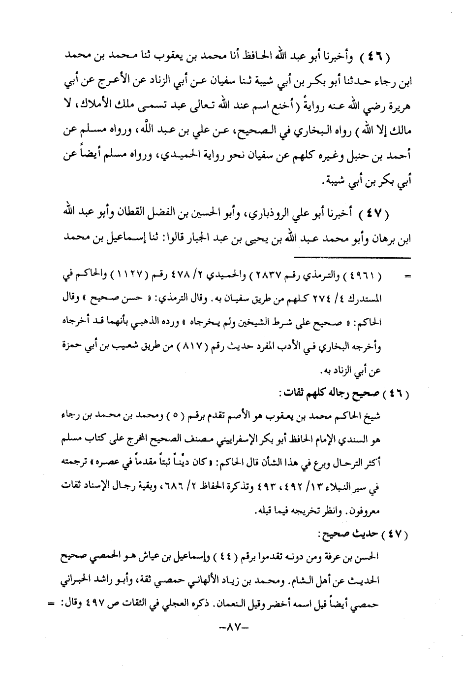 46 - وَأَخْبَرَنَا أَبُو عَبْدِ اللَّهِ الْحَافِظُ , أنا مُحَمَّدُ بْنُ يَعْقُوبَ , ثنا مُحَمَّدُ بْنُ مُحَمَّدِ بْنِ رَجَاءٍ , حَدَّثَنَا أَبُو بَكْرِ بْنُ أَبِي شَيْبَةَ , ثنا سُفْيَانُ , عَنْ أَبِي الزِّنَادِ , عَنِ الْأَعْرَجِ , عَنْ أَبِي هُرَيْرَةَ , رَضِيَ اللَّهُ عَنْهُ رِوَايَةً: §" أَخْنَعُ اسْمٍ عِنْدَ اللَّهِ تَعَالَى عَبْدٌ تَسَمَّى مَلِكَ الْأَمْلَاكِ , لَا مَالِكَ إِلَّا اللَّهُ رَوَاهُ الْبُخَارِيُّ فِي الصَّحِيحِ , عَنْ عَلِيِّ بْنِ عَبْدِ اللَّهِ , وَرَوَاهُ مُسْلِمٌ عَنْ أَحْمَدَ بْنِ حَنْبَلٍ وَغَيْرِهِ كُلُّهُمْ عَنْ سُفْيَانَ نَحْوَ رِوَايَةِ الْحُمَيْدِيِّ , وَرَوَاهُ مُسْلِمٌ أَيْضًا عَنْ أَبِي بَكْرِ بْنِ أَبِي شَيْبَةَ