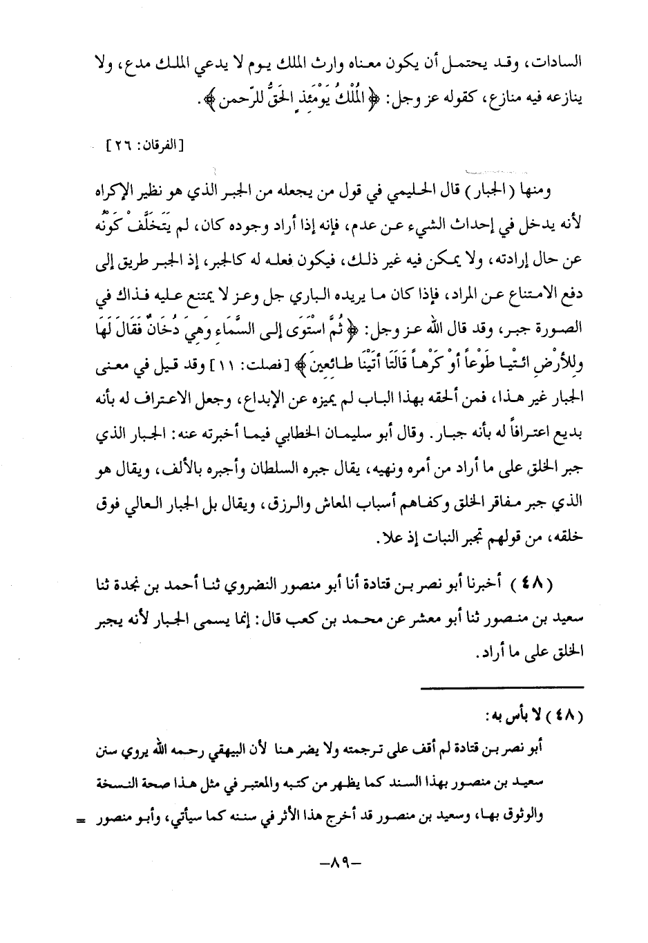 48 - أَخْبَرَنَا أَبُو نَصْرِ بْنُ قَتَادَةَ , أنا أَبُو مَنْصُورٍ النَّضْرَوِيُّ , ثنا أَحْمَدُ بْنُ نَجْدَةَ , ثنا سَعِيدُ بْنُ مَنْصُورٍ , ثنا أَبُو مَعْشَرٍ , عَنْ مُحَمَّدِ بْنِ كَعْبٍ , قَالَ: §«إِنَّمَا يُسَمَّى الْجَبَّارُ لِأَنَّهُ يَجْبُرُ الْخَلْقَ عَلَى مَا أَرَادَ»