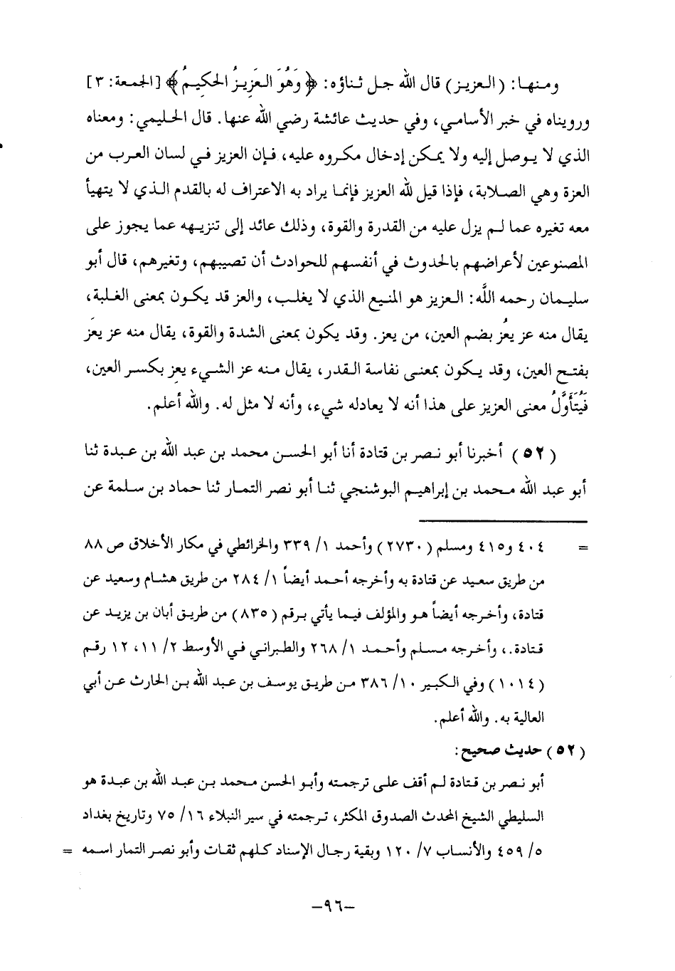 52 - أَخْبَرَنَا أَبُو نَصْرِ بْنُ قَتَادَةَ , أنا أَبُو الْحَسَنِ مُحَمَّدُ بْنُ عَبْدِ اللَّهِ بْنِ عَبْدَةَ , ثنا أَبُو عَبْدِ اللَّهِ مُحَمَّدُ بْنُ إِبْرَاهِيمَ الْبُوشَنْجِيُّ , ثنا أَبُو نَصْرٍ التَّمَّارُ , ثنا حَمَّادُ بْنُ سَلَمَةَ , عَنْ -[97]- إِسْحَاقَ بْنِ عَبْدِ اللَّهِ , عَنْ عُبَيْدِ اللَّهِ بْنِ مِقْسَمٍ , عَنْ عَبْدِ اللَّهِ بْنِ عُمَرَ , رَضِيَ اللَّهُ عَنْهُمَا قَالَ: قَرَأَ رَسُولُ اللَّهِ صَلَّى اللهُ عَلَيْهِ وَسَلَّمَ عَلَى مِنْبَرِهِ: {§وَمَا قَدَرُوا اللَّهَ حَقَّ قَدْرِهِ وَالْأَرْضُ جَمِيعًا قَبْضَتُهُ يَوْمَ الْقِيَامَةِ} [الزمر: 67] فَجَعَلَ رَسُولُ اللَّهِ صَلَّى اللهُ عَلَيْهِ وَسَلَّمَ يَقُولُ: «هَكَذَا يُمَجِّدُ نَفْسَهُ أَنَا الْعَزِيزُ أَنَا الْجَبَّارُ , أَنَا الْمُتَكَبِّرُ» فَرَجَفَ بِهِ صَلَّى اللهُ عَلَيْهِ وَسَلَّمَ الْمِنْبَرُ حَتَّى قُلْنَا: لَيَخِرَّنَّ بِهِ الْأَرْضَ وَمِنْهَا «الْمُتَعَالِي» قَالَ اللَّهُ عَزَّ وَجَلَّ: {الْكَبِيرُ الْمُتَعَالِ} وَرُوِّينَاهُ فِي خَبَرِ الْأَسَامِي قَالَ الْحَلِيمِيُّ: وَمَعْنَاهُ الْمُرْتَفِعُ عَنْ أَنْ يَجُوزَ عَلَيْهِ مَا يَجُوزُ عَلَى الْمُحْدَثِينَ , مِنَ الْأَزْوَاجِ وَالْأَوْلَادِ وَالْجَوَارِحِ وَالْأَعْضَاءِ وَاتِّخَاذِ السَّرِيرِ لِلْجُلُوسِ عَلَيْهِ , وَالِاحْتِجَابِ بِالسُّتُورِ عَنْ أَنْ تَنْفُذَ الْأَبْصَارُ إِلَيْهِ وَالِانْتِقَالُ مِنْ مَكَانٍ إِلَى مَكَانٍ، وَنَحْوِ ذَلِكَ , فَإِنَّ إِثْبَاتَ بَعْضِ هَذِهِ الْأَشْيَاءِ يُوجِبُ النِّهَايَةَ , وَبَعْضُهَا يُوجِبُ الْحَاجَةَ وَبَعْضُهَا يُوجِبُ التَّغَيُّرَ وَالِاسْتِحَالَةَ , وَشَيْءٌ مِنْ ذَلِكَ غَيْرُ لَائِقٍ بِالْقَدِيمِ وَلَا جَائِزٌ عَلَيْهِ وَمِنْهَا «الْبَاطِنُ» قَالَ اللَّهُ عَزَّ وَجَلَّ: {هُوَ الْأَوَّلُ وَالْآخِرُ وَالظَّاهِرُ وَالْبَاطِنُ} [الحديد: 3] وَرُوِّينَاهُ فِي خَبَرِ الْأَسَامِي وَغَيْرِهِ