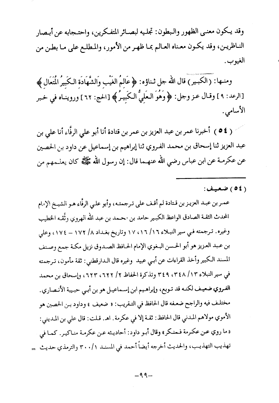 54 - أَخْبَرَنَا عُمَرُ بْنُ عَبْدِ الْعَزِيزِ بْنِ عُمَرَ بْنِ قَتَادَةَ , أنا أَبُو عَلِيٍّ الرَّفَّاءُ , أنا عَلِيُّ بْنُ عَبْدِ الْعَزِيزِ , ثَنَا إِسْحَاقُ بْنُ مُحَمَّدٍ الْفَرْوِيُّ , ثَنَا إِبْرَاهِيمُ بْنُ إِسْمَاعِيلَ , عَنْ دَاوُدَ بْنِ الْحُصَيْنِ , عَنْ عِكْرِمَةَ , عَنِ ابْنِ عَبَّاسٍ رَضِيَ اللَّهُ عَنْهُمَا قَالَ: إِنَّ رَسُولَ اللَّهِ صَلَّى اللهُ عَلَيْهِ وَسَلَّمَ كَانَ §يُعَلِّمُهُمْ مِنَ -[100]- الْأَوْجَاعِ كُلِّهَا وَمِنَ الْحُمَّى: «بِاسْمِ اللَّهِ الْكَبِيرِ نَعُوذُ بِاللَّهِ الْعَظِيمِ مِنْ شَرِّ كُلِّ عِرْقٍ نَعَّارٍ وَشَرِّ حَرِّ النَّارِ» قَالَ الْحَلِيمِيُّ فِي مَعْنَى الْكَبِيرِ: إِنَّهُ الْمُصَرِّفُ عِبَادَهُ عَلَى مَا يُرِيدُهُ مِنْهُمْ مِنْ غَيْرِ أَنْ يَرَوْهُ وَكَبِيرُ الْقَوْمِ هُوَ الَّذِي يَسْتَغْنِي عَنِ التَّبَذُّلِ لَهُمْ وَلَا يَحْتَاجُ فِي أَنْ يُطَاعَ إِلَى إِظْهَارِ نَفْسِهِ , وَالْمُشَافَهَةِ بِأَمْرِهِ وَنَهْيِهِ , إِلَّا أَنَّ ذَلِكَ فِي صِفَةِ اللَّهِ تَعَالَى جَدُّهُ إِطْلَاقُ حَقِيقَةٍ , وَفِيمَنْ دُونَهُ مَجَازٌ لِأَنَّ مَنْ يُدْعَى كَبِيرَ الْقَوْمِ قَدْ يَحْتَاجُ مَعَ بَعْضِ النَّاسِ وَفِي بَعْضِ الْأُمُورِ إِلَى الِاسْتِظْهَارِ عَلَى الْمَأْمُورِ بِإِبْدَاءِ نَفْسِهِ لَهُ وَمُخَاطَبَتِهِ كِفَاحًا لِخَشْيَةِ أَنْ لَا يُطِيعَهُ إِذَا سَمِعَ أَمْرَهُ مِنْ غَيْرِهِ , وَاللَّهُ سُبْحَانَهُ وَتَعَالَى جَلَّ ثَنَاؤُهُ لَا يَحْتَاجُ إِلَى شَيْءٍ وَلَا يُعْجِزُهُ شَيْءٌ قَالَ أَبُو سُلَيْمَانَ: الْكَبِيرُ الْمَوْصُوفُ بِالجْلَالِ وَكِبَرِ الشَّأنِ , فَصَغُرَ دُونَ جَلَالِهِ كُلُّ كَبِيرٍ وَيُقَالُ: هُوَ الَّذِي كَبُرَ عَنْ شَبَهِ الْمَخْلُوقِينَ وَمِنْهَا «السَّلَامُ» قَالَ اللَّهُ عَزَّ وَجَلَّ: {هُوَ اللَّهُ الَّذِي لَا إِلَهَ إِلَّا هُوَ الْمَلِكُ الْقُدُّوسُ السَّلَامُ الْمُؤْمِنُ الْمُهَيْمِنُ الْعَزِيزُ الْجَبَّارُ الْمُتَكَبِّرُ سُبْحَانَ اللَّهِ عَمَّا يُشْرِكُونَ} [الحشر: 23]-[101]- وَرُوِّينَاهُ فِي خَبَرِ الْأَسَامِي