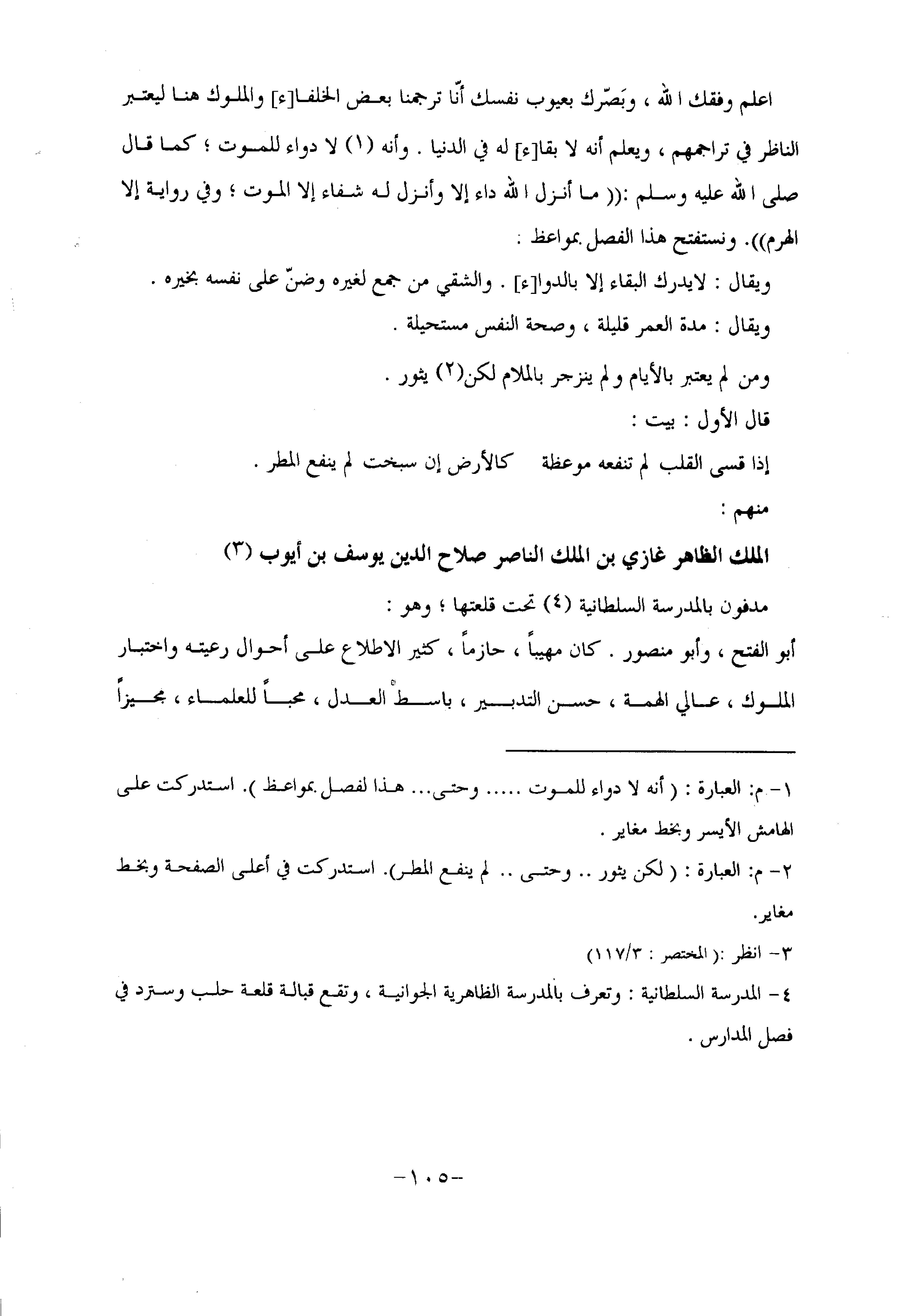 اعلم وفقك الله، وبصّرك بعيوب نفسك أنّا ترجمنا بعض الخلفا [ء] والملوك هنا ليعتبر الناظر في تراجمهم، ويعلم أنه لا بقا [ء] له في الدنيا. وأنه «1» لا دواء للموت؛ كما قال صلى الله عليه وسلم: «ما أنزل الله داء إلا وأنزل له شفاء إلا الموت؛ وفي رواية إلا الهرم» . ونستفتح هذا الفصل بمواعظ.