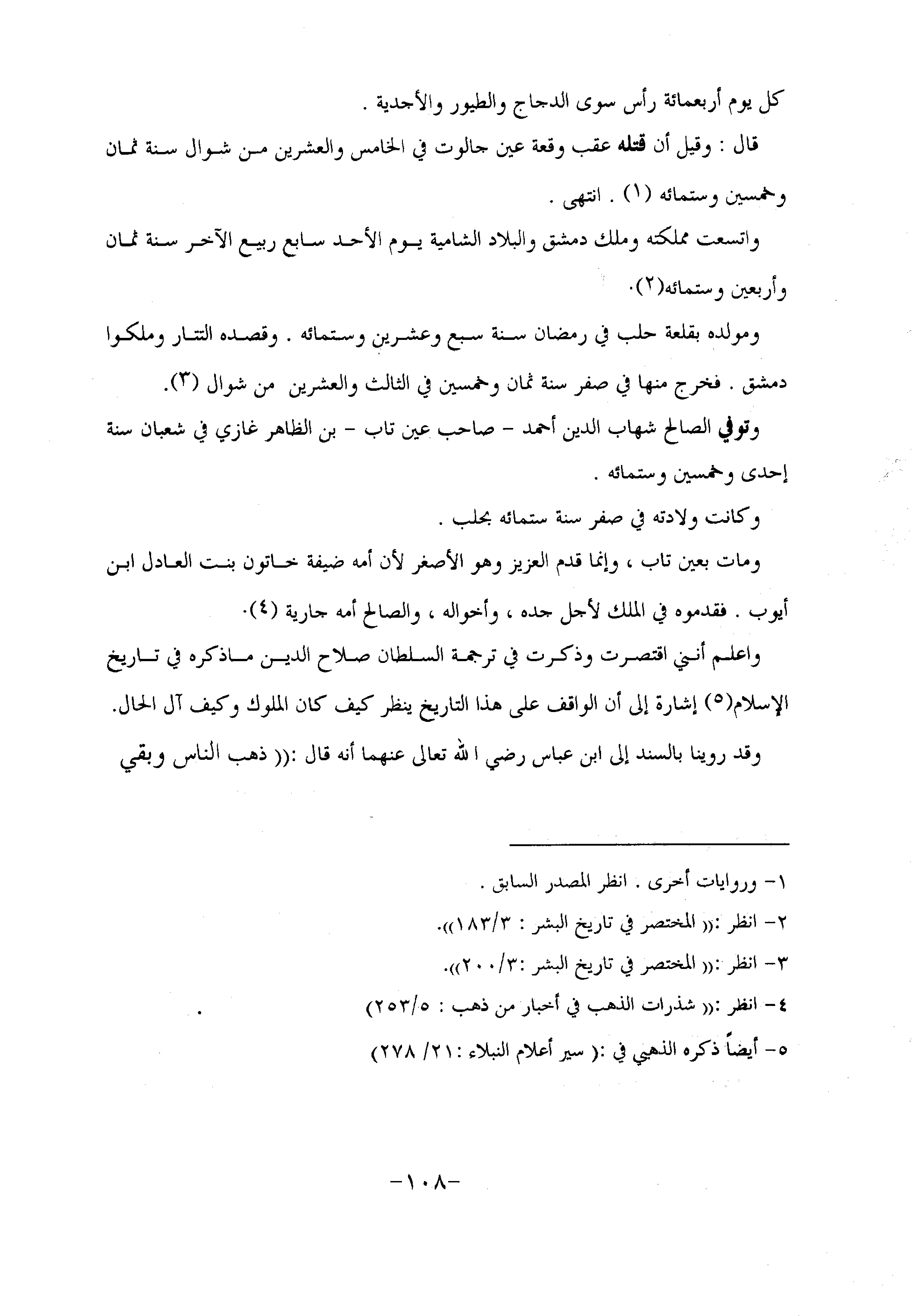 واعلم أنني اقتصرت وذكرت في ترجمة السلطان صلاح الدين ما ذكره في تاريخ الإسلام «5» إشارة إلى أن الواقف على هذا التاريخ ينظر كيف كان الملوك وكيف آل الحال.