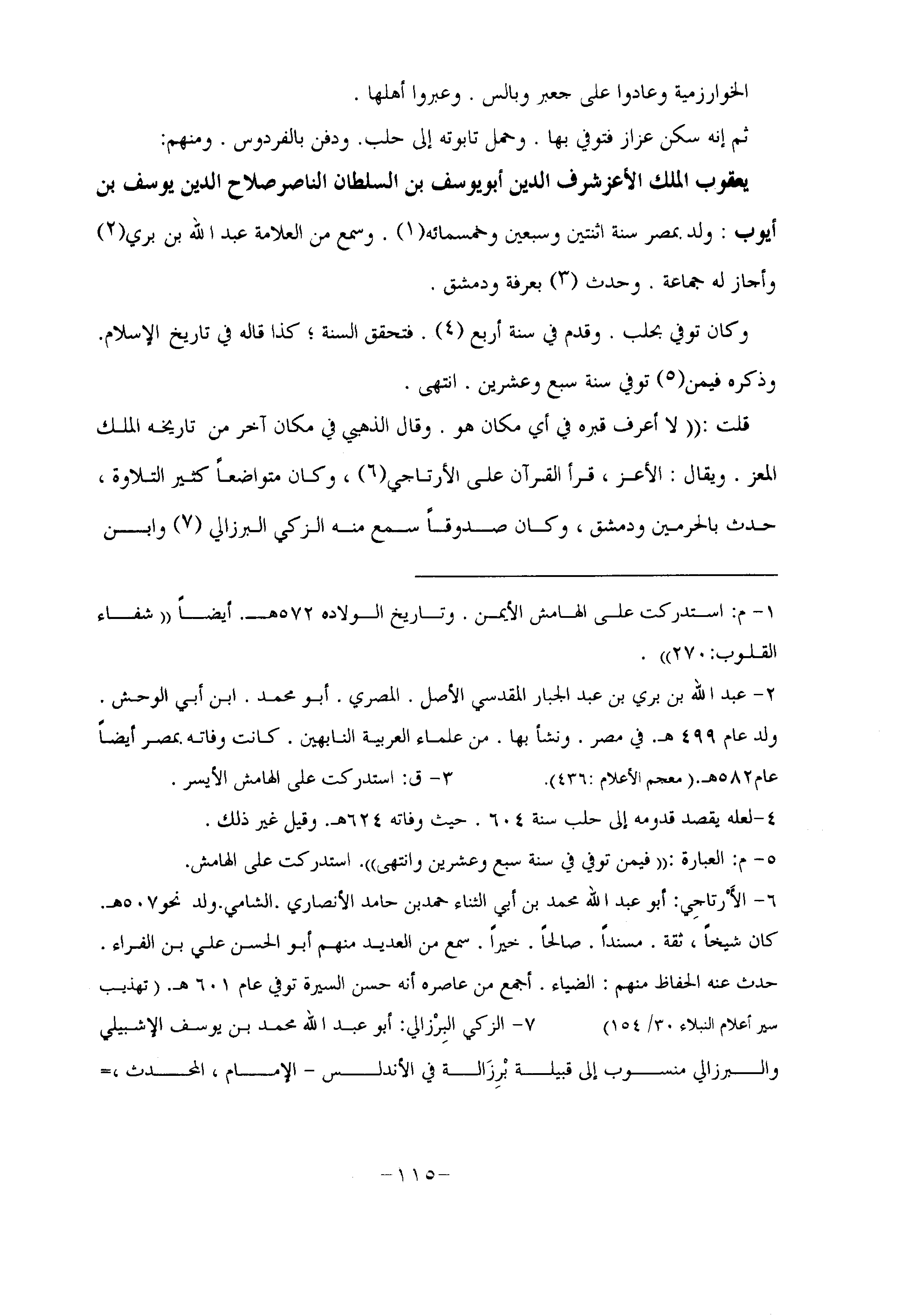قلت: «لا أعرف قبره في أي مكان هو. وقال الذهبي في مكان آخر من تاريخه الملك المعز. ويقال: الأعز، قرأ القرآن على الأرتاجي «6» ، وكان متواضعا كثير التلاوة، حدث بالحرمين ودمشق، وكان صدوقا سمع منه الزكي البرزالي «7» وابن