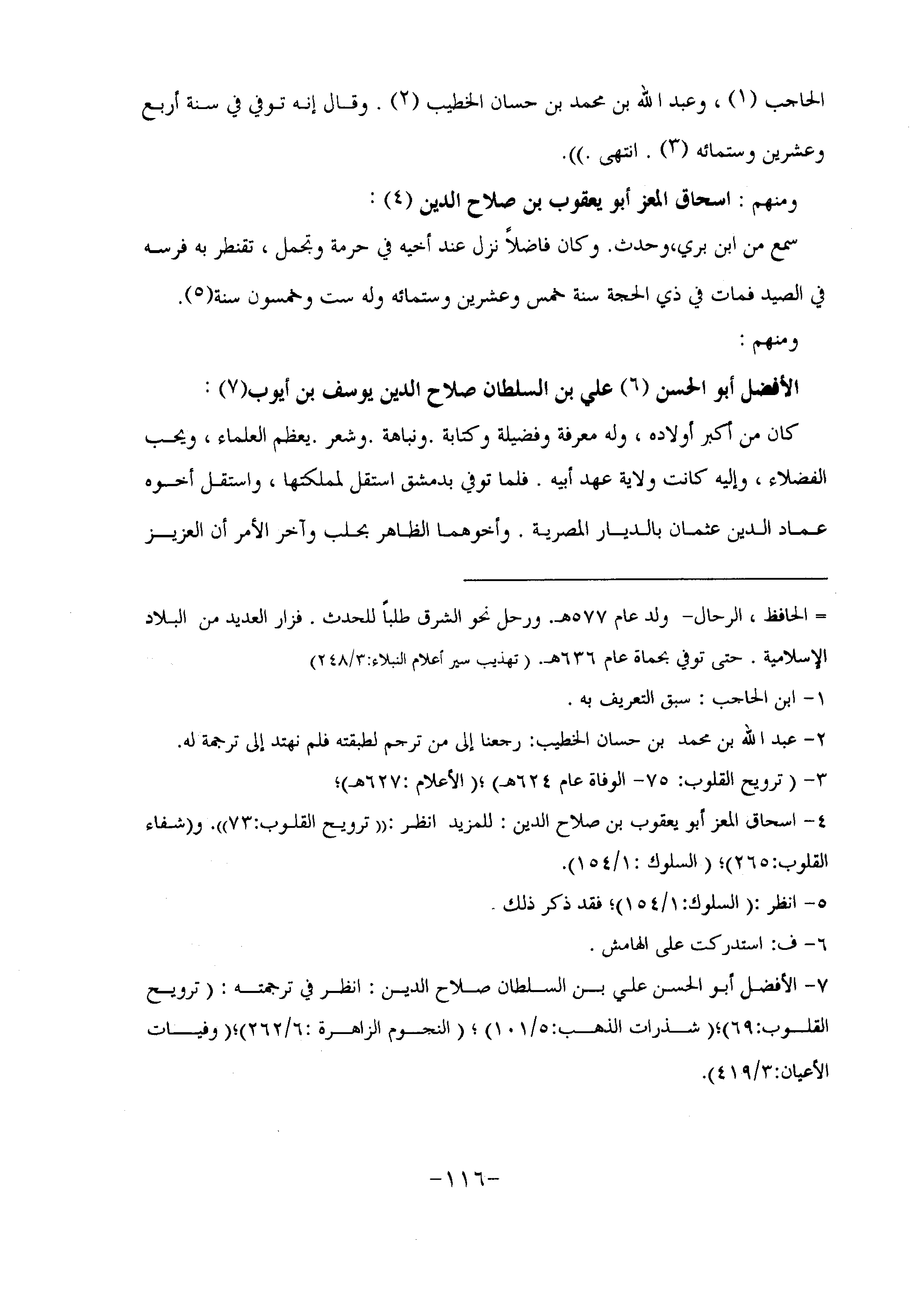 : كان من أكبر أولاده، وله معرفة وفضيلة وكتابة. ونباهة. وشعر. يعظم العلماء، ويحب الفضلاء، وإليه كانت ولاية عهد أبيه. فلما توفي بدمشق استقل لمملكتها، واستقل أخوه عماد الدين عثمان بالديار المصرية. وأخوهما الظاهر بحلب وآخر الأمر أن العزيز