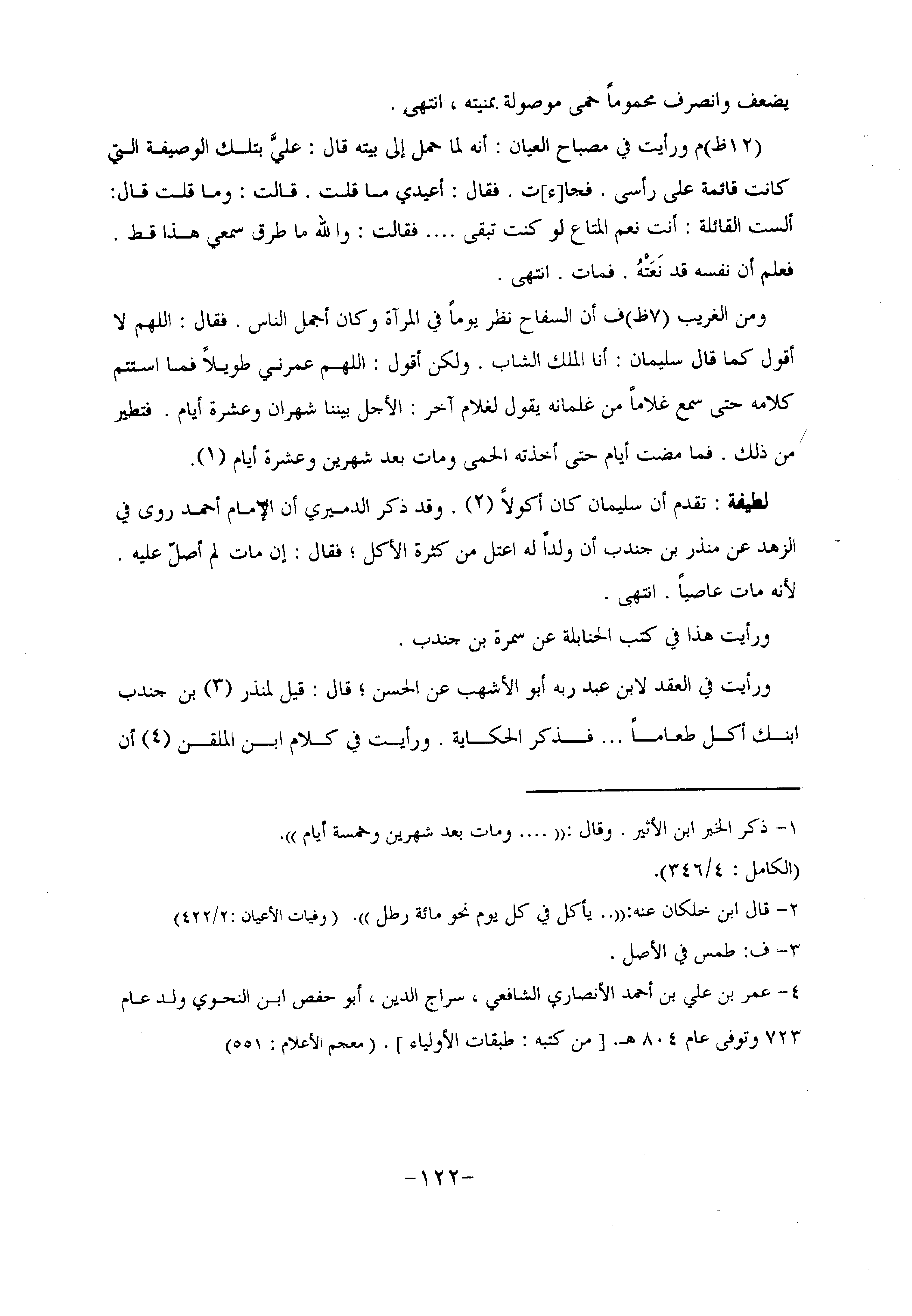 تقدم أن سليمان كان أكولا «2» . وقد ذكر الدميري أن الإمام أحمد روى في الزهد عن منذر بن جندب أن ولدا له اعتل من كثرة الأكل؛ فقال: إن مات لم أصلّ عليه.
