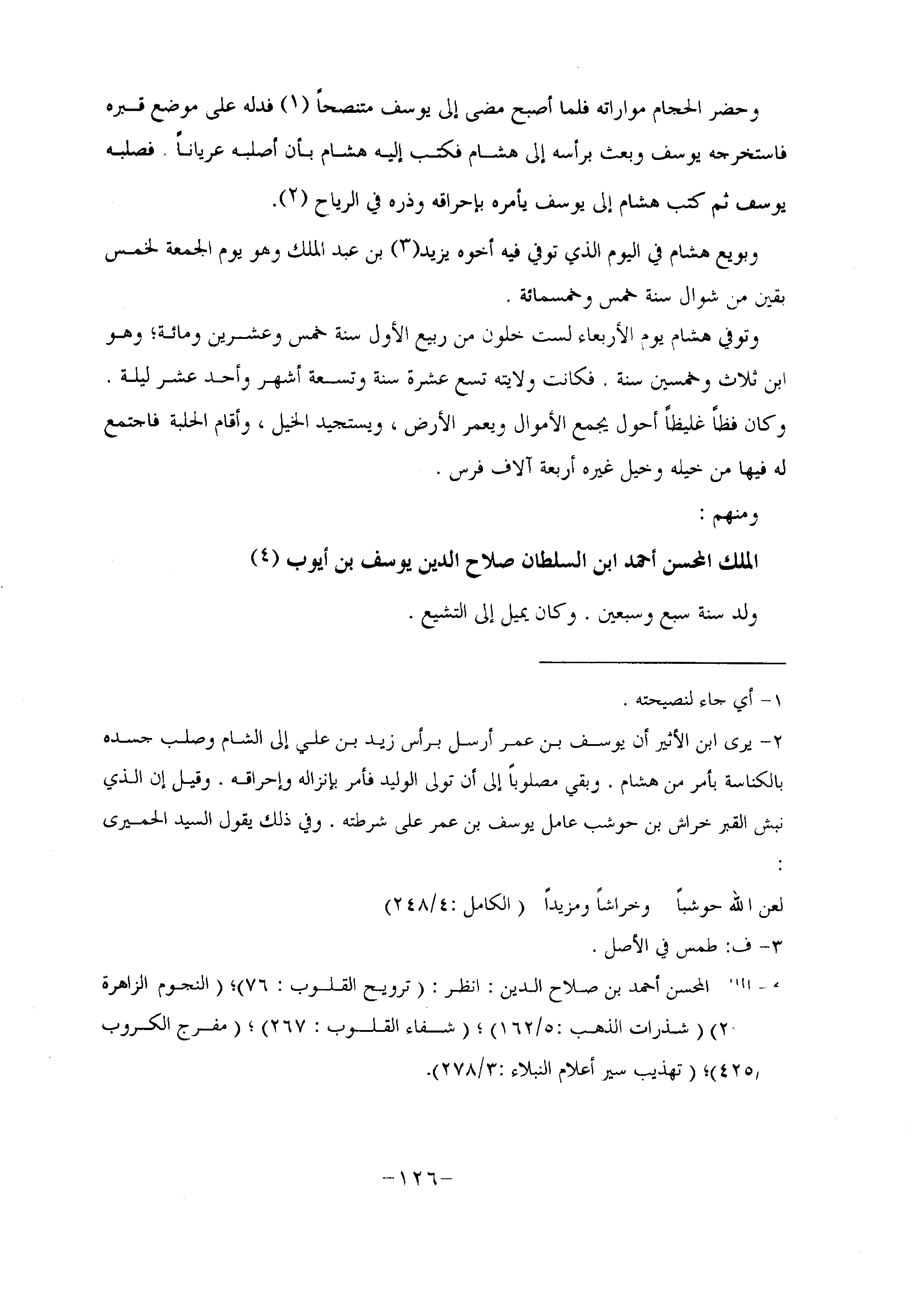 وحضر الحجام مواراته فلما أصبح مضى إلى يوسف متنصحا «1» فدله على موضع قبره فاستخرجه يوسف وبعث برأسه إلى هشام فكتب إليه هشام بأن أصلبه عريانا. فصلبه يوسف ثم كتب هشام إلى يوسف يأمره بإحراقه وذره في الرياح «2» .