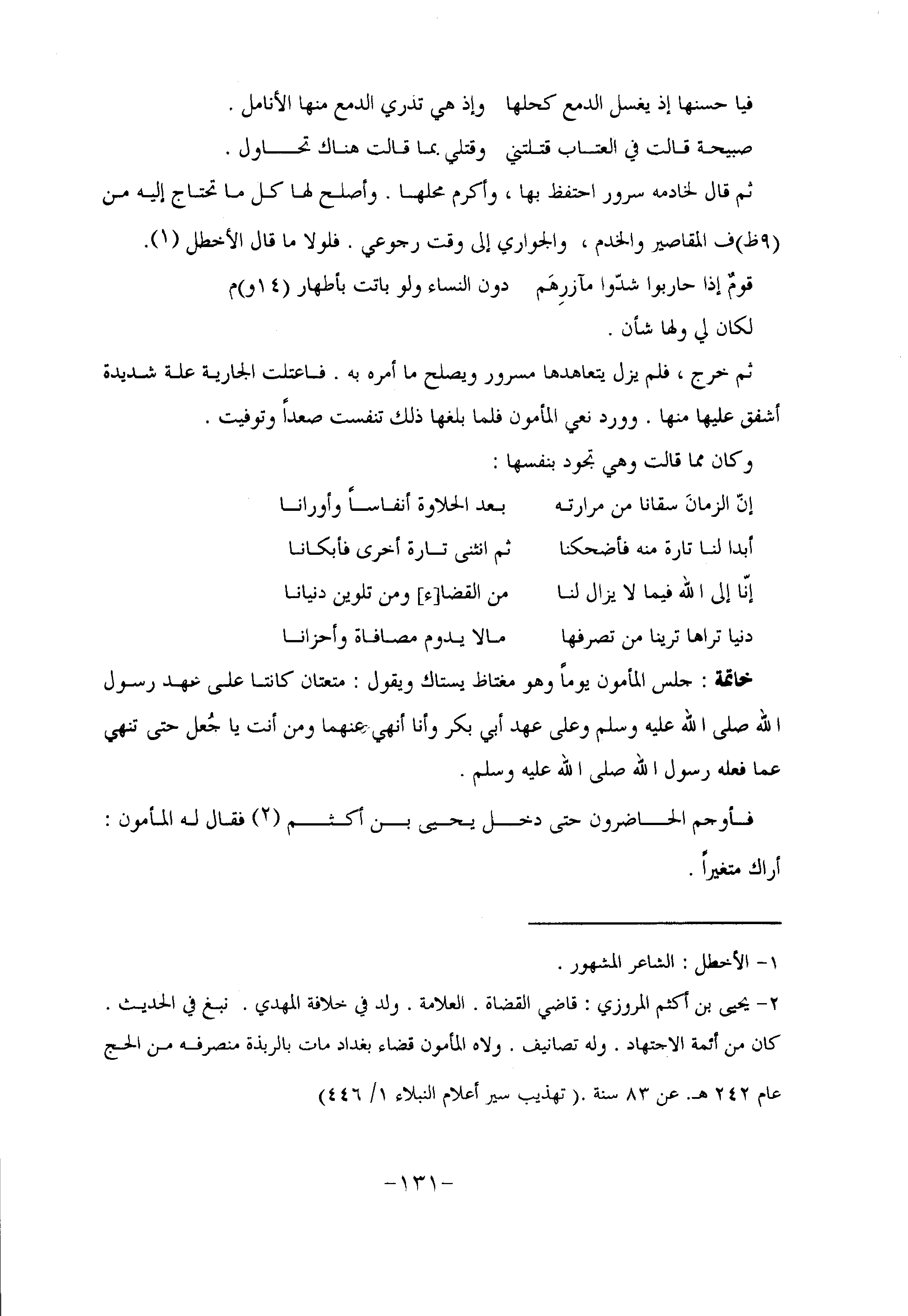 ثم قال لخادمه سرور احتفظ بها، وأكرم محلها. وأصلح لها كل ما تحتاج إليه من (9 ظ) ف المقاصير والخدم، والجواري إلى وقت رجوعي. فلولا ما قال الأخطل «1» .