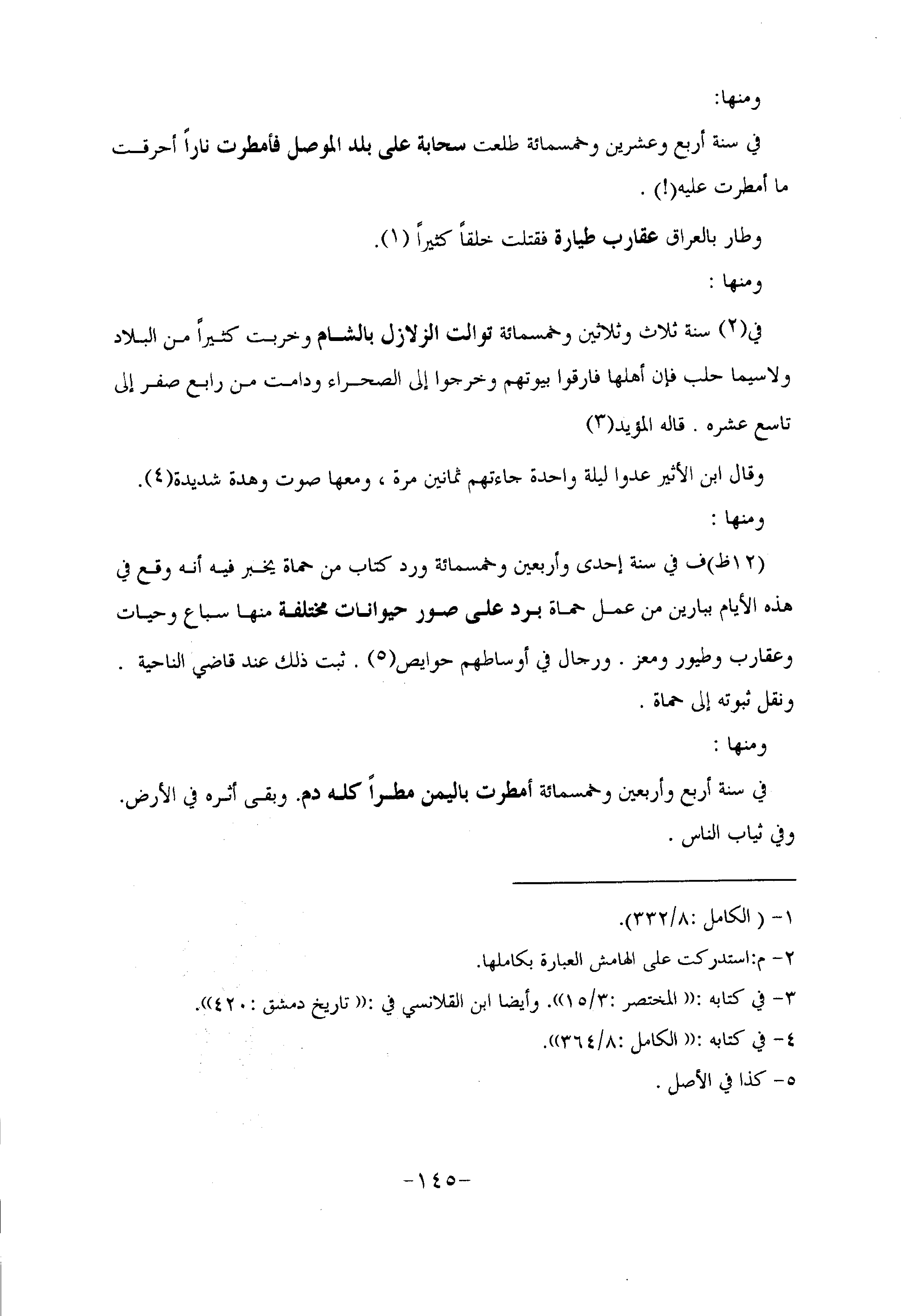 في سنة أربع وعشرين وخمسمائة طلعت سحابة على بلد الموصل فأمطرت نارا أحرقت ما أمطرت عليه (!) .