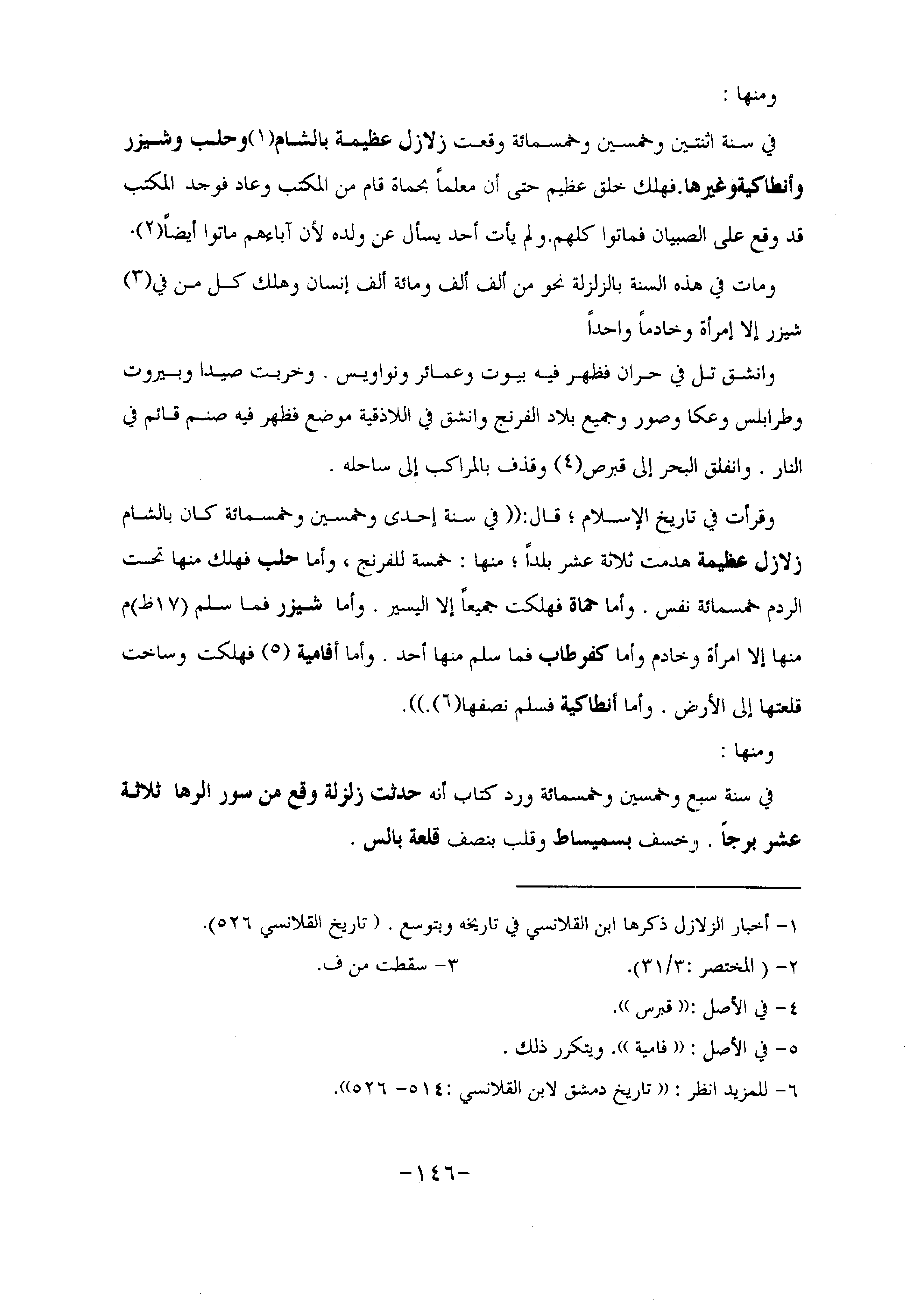 وقرأت في تاريخ الإسلام؛ قال: «في سنة إحدى وخمسين وخمسمائة كان بالشام زلازل عظيمة هدمت ثلاثة عشر بلدا؛ منها: خمسة للفرنج، وأما حلب فهلك منها تحت الردم خمسمائة نفس. وأما حماة فهلكت جميعا إلا اليسير. وأما شيزر فما سلم (17 ظ) م منها إلا امرأة وخادم وأما كفرطاب فما سلم منها أحد. وأما أفامية «5» فهلكت وساخت قلعتها إلى الأرض. وأما أنطاكية فسلم نصفها «6» .» .